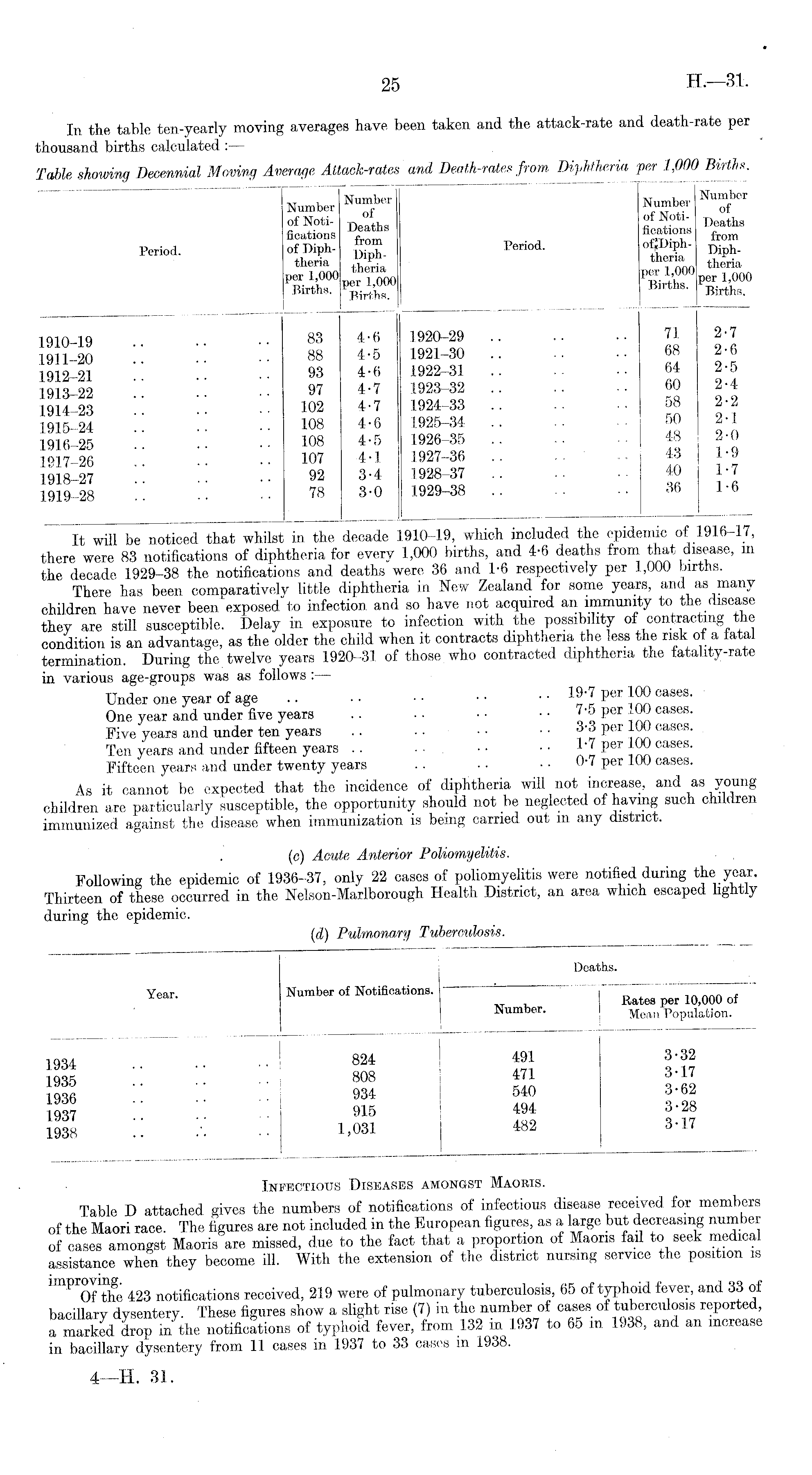Infectious Diseases amongst Maoris. Table D attached gives the numbers of notifications of infectious disease received for members of the Maori race. The figures are not included in the European figures, as a large but decreasing number of cases amongst Maoris are missed, due to the fact that a proportion of Maoris fail to seek medical assistance when they become ill. With the extension of the district nursing service the position is P Of the 423 notifications received, 219 were of pulmonary tuberculosis, 65 of typhoid fever, and 33 of bacillary dysentery. These figures show a slight rise (7) in the number of cases of tuberculosis reported a marked drop in the notifications of typhoid fever, from 132 m 1937 to 65 in U3B, and an increase in bacillary dysentery from 11 cases in 1937 to 33 cases in 1938.