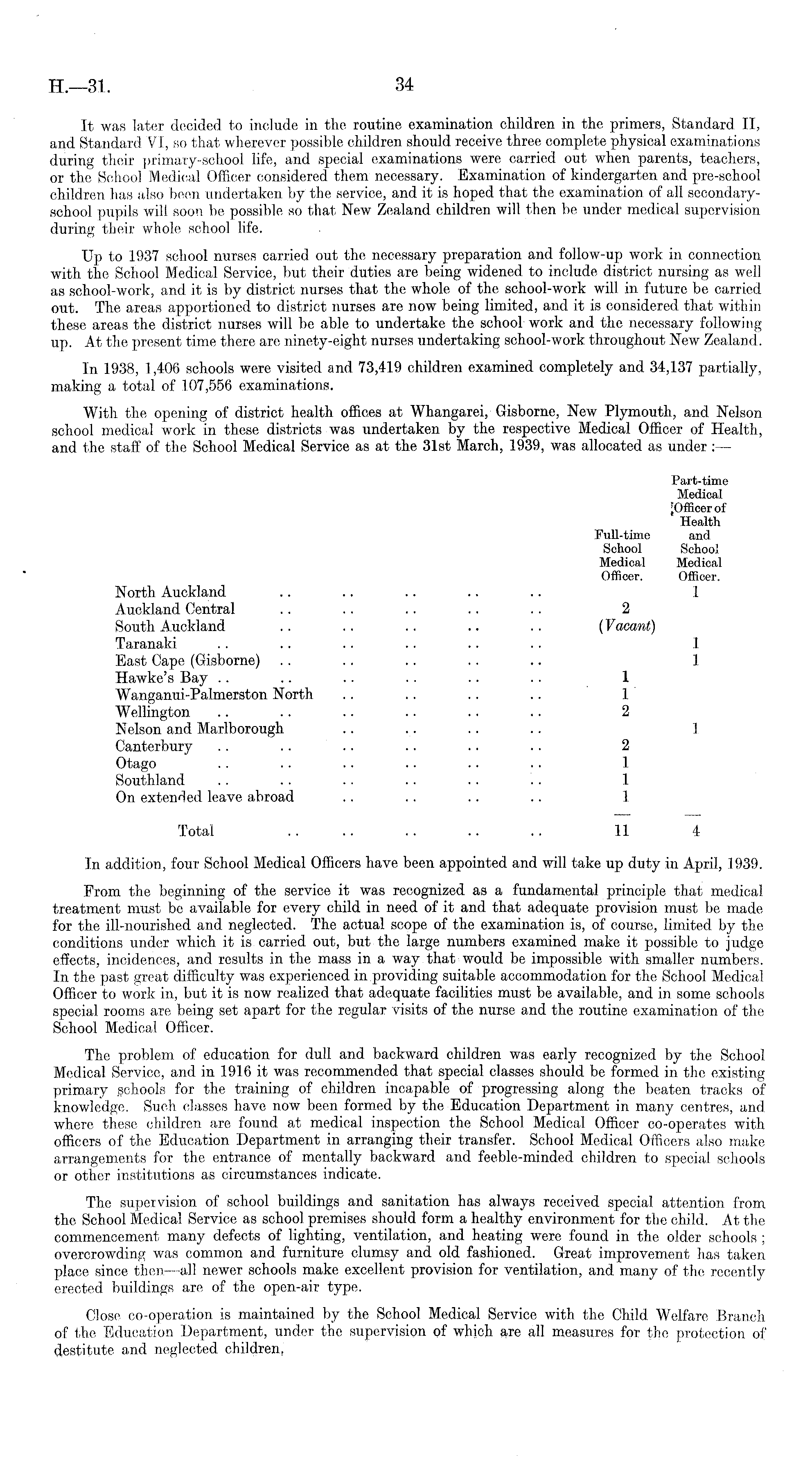 It was later decided to include in the routine examination children in the primers, Standard 11, and Standard VI, so that wherever possible children should receive three complete physical examinations during their primary-school life, and special examinations were carried out when parents, teachers, or the School Medical Officer considered them necessary. Examination of kindergarten and pre-school children has also been undertaken by the service, and it is hoped that the examination of all secondaryschool pupils will soon be possible so that New Zealand children will then be under medical supervision during their whole school life. Up to 1937 school nurses carried out the necessary preparation and follow-up work in connection with the School Medical Service, but their duties are being widened to include district nursing as well as school-work, and it is by district nurses that the whole of the school-work will in future be carried out. The areas apportioned to district nurses are now being limited, and it is considered that within these areas the district nurses will be able to undertake the school work and the necessary following up. At the present time there are ninety-eight nurses undertaking school-work throughout New Zealand. In 1938, 1,406 schools were visited and 73,419 children examined completely and 34,137 partially, making a total of 107,556 examinations. With the opening of district health offices at Whangarei, Gisborne, New Plymouth, and Nelson school medical work in these districts was undertaken by the respective Medical Officer of Health, and the staff of the School Medical Service as at the 31st March, 1939, was allocated as under :— Part-time Medical [Officer of Health Full-time and School School Medical Medical Officer. Officer. North Auckland .. .. .. .. .. 1 Auckland Central .. .. .. .. .. 2 South Auckland .. .. .. .. .. (Vacant) Taranaki . . .. .. .. .. . . 1 East Cape (Gisborne) .. .. .. .. .. 1 Hawke's Bay .. .. .. . . .. . . 1 Wanganui-Palmerston North . . . . . . .. 1 Wellington .. .. .. .. .. .. 2 Nelson and Marlborough .. .. . . .. 1 Canterbury .. .. .. .. .. .. 2 Otago . . .. .. .. .. . . 1 Southland . . . . . . . . . . . . 1 On extended leave abroad .. . . .. .. 1 Total .. .. .. .. .. 11 4 In addition, four School Medical Officers have been appointed and will take up duty in April, 1939. From the beginning of the service it was recognized as a fundamental principle that medical treatment must be available for every child in need of it and that adequate provision must be made for the ill-nourished and neglected. The actual scope of the examination is, of course, limited by the conditions under which it is carried out, but the large numbers examined make it possible to judge effects, incidences, and results in the mass in a way that would be impossible with smaller numbers. In the past great difficulty was experienced in providing suitable accommodation for the School Medical Officer to work in, but it is now realized that adequate facilities must be available, and in some schools special rooms are being set apart for the regular visits of the nurse and the routine examination of the School Medical Officer. The problem of education for dull and backward children was early recognized by the School Medical Service, and in 1916 it was recommended that special classes should be formed in the existing primary schools for the training of children incapable of progressing along the beaten tracks of knowledge. Such classes have now been formed by the Education Department in many centres, and where these children are found at medical inspection the School Medical Officer co-operates with officers of the Education Department in arranging their transfer. School Medical Officers also make arrangements for the entrance of mentally backward and feeble-minded children to special schools or other institutions as circumstances indicate. The supervision of school buildings and sanitation has always received special attention from the School Medical Service as school premises should form a healthy environment for the child. At the commencement many defects of lighting, ventilation, and heating were found in the older schools ; overcrowding was common and furniture clumsy and old fashioned. Great improvement has taken place since then—all newer schools make excellent provision for ventilation, and many of the recently erected buildings are of the open-air type. Close co-operation is maintained by the School Medical Service with the Child Welfare Branch of the Education Department, under the supervision of which are all measures for the protection of destitute and neglected children,