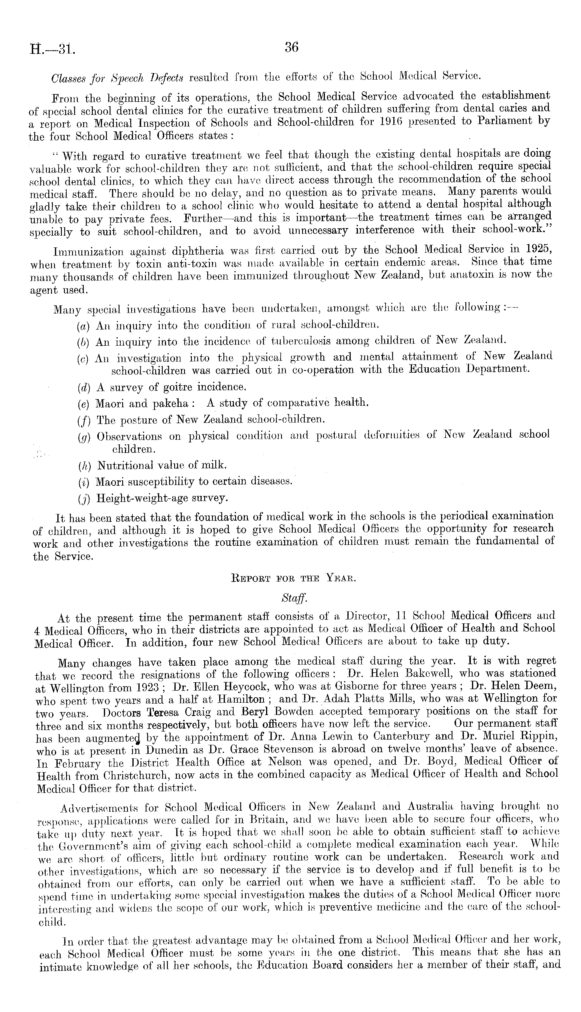 Classes for Speech Defects resulted from the eflorts of the School Medical Service. From the beginning of its operations, the School Medical Service advocated the establishment of special school dental clinics for the curative treatment of children suffering from dental caries and a report on Medical Inspection of Schools and School-children for 1916 presented to Parliament by the four School Medical Officers states : " With regard to curative treatment we feel that though the existing dental hospitals are doing valuable work for school-children they are not sufficient, and that the school-children require special school dental clinics, to which they can have direct access through the recommendation of the school medical staff. There should be no delay, a.nd no question as to private means. Many parents would gladly take their children to a school clinic who would hesitate to attend a dental hospital although unable to pay private fees. Further—-and this is important—the treatment times can be arranged specially to suit school-children, and to avoid unnecessary interference with their school-work." Immunization against diphtheria was first carried out by the School Medical Service in 1925, when treatment by toxin anti-toxin was made available in certain endemic areas. Since that time many thousands of children have been immunized throughout New Zealand, but anatoxin is now the agent used. Many special investigations have been undertaken, amongst which are the following : — (a) An. inquiry into the condition of rural school-children. (b) An inquiry into the incidence of tuberculosis among children of New Zealand. (c) An investigation into the physical growth and mental attainment of New Zealand school-children was carried out in co-operation with the Education Department. (d) A survey of goitre incidence. (e) Maori and pakeha : A study of comparative health. (/) The posture of New Zealand school-children. (g) Observations on physical condition and postural deformities of New Zealand school children. (h) Nutritional value of milk. (i) Maori susceptibility to certain diseases. (j) Height-weight-age survey. It has been stated that the foundation of medical work in the schools is the periodical examination of children, and although it is hoped to give School Medical Officers the opportunity for research work and other investigations the routine examination of children must remain the fundamental of the Service. Report for the Year. Staff. At the present time the permanent staff consists of a Director, 11 School Medical Officers and 4 Medical Officers, who in their districts are appointed to act as Medical Officer of Health and School Medical Officer. In addition, four new School Medical Officers are about to take up duty. Many changes have taken place among the medical staff during the year. It is with regret that we record the resignations of the following officers : Dr. Helen Bakewell, who was stationed at Wellington from 1923 ; Dr. Ellen Heycock, who was at Gisborne for three years ; Dr. Helen Deem, who spent two years and a half at Hamilton ; and Dr. Adah I'latts Mills, who was at Wellington for two years. Doctors Teresa Craig and Beryl Bowden accepted temporary positions on the staff for three and six months respectively, but both officers have now left the service. Our permanent staff has been augmented by the appointment of Dr. Anna Lewin to Canterbury and Dr. Muriel Rippin, who is at present in Dunedin as Dr. Grace Stevenson is abroad on twelve months' leave of absence. In February the District Health Office at Nelson was opened, and Dr. Boyd, Medical Officer of Health from Christchurch, now acts in the combined capacity as Medical Officer of Health and School Medical Officer for that district. Advertisements for School Medical Officers in New Zealand and Australia having brought no response, applications were called for in Britain, and we have been able to secure four officers, who take up duty next year. It is hoped that we shall soon be able to obtain sufficient staff to achieve the Government's aim of giving each school-child a complete medical examination each year. While we are short of officers, little but ordinary routine work can be undertaken. Research work and other investigations, which are so necessary if the service is to develop and if full benefit is to be obtained from our efforts, can only be carried out when we have a sufficient staff. To be able to spend time in undertaking some special investigation makes the duties of a School Medical Officer more interesting and widens the scope of our work, which is preventive medicine and the care of the schoolchild. In order that tlie greatest advantage may be obtained from a School Medical Officer and her work, each School Medical Officer must be some years in the one district. This means that she has an intimate knowledge of all her schools, the Education Board considers her a member of their staff, and