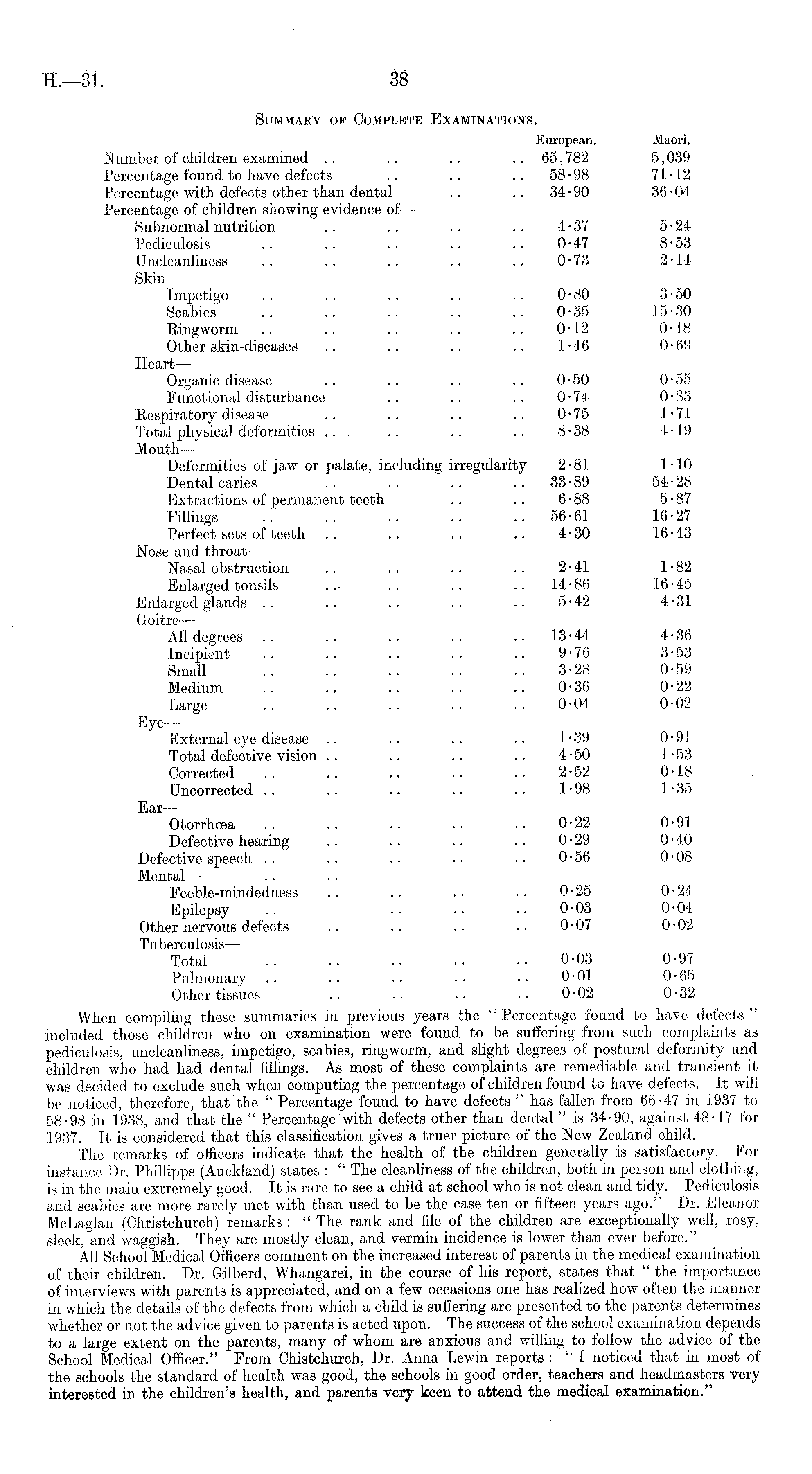 Summary op Complete Examinations. European. Maori. Number of children examined .. .. .. .. 65,782 5,039 Percentage found to have defects .. .. .. 58-98 71-12 Percentage with defects other than dental .. .. 34-90 36-04 Percentage of children showing evidence of — Subnormal nutrition .. .. .. .. 4-37 5-24 Pediculosis .. .. .. .. .. 0-47 8-53 Uncleanliness .. .. .. .. .. 0-73 2-14 Skin — Impetigo .. .. .. .. .. 0-80 3-50 Scabies .. 0-35 15-30 Ringworm .. .. .. .. .. 0-12 0-18 Other skin-diseases .. .. .. .. 1-46 0-69 Heart — Organic disease .. .. .. .. 0-50 0-55 Functional disturbance .. .. .. 0-74 0-83 Respiratory disease .. .. .. .. 0-75 1-71 Total physical deformities .. .. .. .. 8-38 4-19 Mouth — Deformities of jaw or palate, including irregularity 2-81 1-10 Dental caries . . . . .. . . 33-89 54-28 Extractions of permanent teeth .. .. 6-88 5-87 Fillings 56-61 16-27 Perfect sets of teeth .. .. .. .. 4-30 16-43 Nose and throat — Nasal obstruction .. .. .. . . 2-41 1-82 Enlarged tonsils ... .. .. .. 14-86 16-45 Enlarged glands .. .. .. .. .. 5-42 4-31 Goitre — All degrees .. .. .. .. .. 13-44 4-36 Incipient .. .. .. .. .. 9-76 3-53 Small .. .. .. .. .. 3-28 0-59 Medium .. .. .. .. .. 0-36 0-22 Large .. .. .. .. •• 0-04 0-02 EyeExternal eye disease .. .. .. .. 1-39 0-91 Total defective vision .. .. .. .. 4-50 1-53 Corrected .. .. .. .. •• 2-52 0-18 Uncorrected .. .. .. .. .. 1-98 1-35 Ear — Otorrhoea .. .. .. .. •• 0-22 0-91 Defective hearing .. .. .. .. 0-29 0-40 Defective speech .. .. .. .. .. 0-56 0-08 Mental — Feeble-mindedness .. .. .. .. 0-25 0-24 Epilepsy .. • ■ • • • ■ 0-03 0-04 Other nervous defects .. .. .. .. 0-07 0-02 Tuberculosis — Total .. .. •• •• 0-03 0-97 Pulmonary .. .. .. .. . • 0-01 0-65 Other tissues .. .. .. ■ ■ 0-02 0-32 When compiling these summaries in previous years the " Percentage found to have defects " included those children who on examination were found to be suffering from such complaints as pediculosis, uncleanliness, impetigo, scabies, ringworm, and slight degrees of postural deformity and children who had had dental fillings. As most of these complaints are remediable and transient it was decided to exclude such when computing the percentage of children found to have defects. It will be noticed, therefore, that the " Percentage found to have defects " has fallen from 66-47 in 1937 to 58-98 in 1938, and that the " Percentage with defects other than dental " is 34-90, against 48-17 for 1937. It is considered that this classification gives a truer picture of the New Zealand child. The remarks of officers indicate that the health of the children generally is satisfactory. For instance Dr. Phillipps (Auckland) states : " The cleanliness of the children, both in person and clothing, is in the main extremely good. It is rare to see a child at school who is not clean and tidy. Pediculosis and scabies are more rarely met with than used to be the case ten or fifteen years ago." Dr. Eleanor McLaglan (Christchurch) remarks : " The rank and file of the children are exceptionally well, rosy, sleek, and waggish. They are mostly clean, and vermin incidence is lower than ever before." All School Medical Officers comment on the increased interest of parents in the medical examination of their children. Dr. Gilberd, Whangarei, in the course of his report, states that " the importance of interviews with parents is appreciated, and on a few occasions one has realized how often the manner in which the details of the defects from which a child is suffering are presented to the parents determines whether or not the advice given to parents is acted upon. The success of the school examination depends to a large extent on the parents, many of whom are anxious and willing to follow the advice of the School Medical Officer." From Chistchurch, Dr. Anna Lewin reports : " I noticed that in most of the schools the standard of health was good, the schools in good order, teachers and headmasters very interested in the children's health, and parents very keen to attend the medical examination."