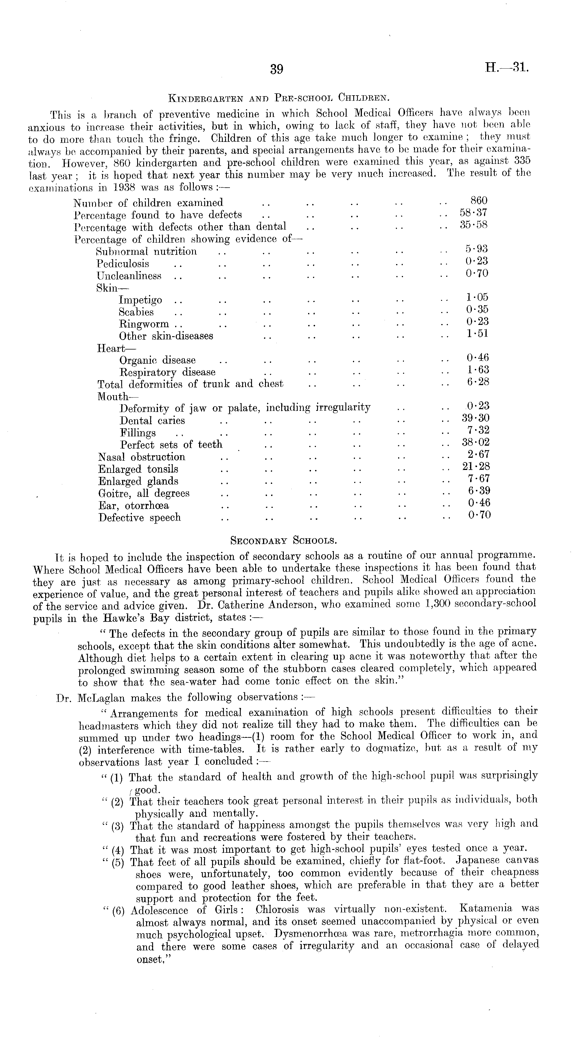 Kindergarten and Pre-rchool Children. This is a branch of preventive medicine in which School Medical Officers have always been anxious to increase their activities, but in which, owing to lack of staff, they have not been able to do more than touch the fringe. Children of this age take much longer to examine ; they must always be accompanied by their parents, and special arrangements have to be made for their examination. However, 860 kindergarten and pre-school children were examined this year, as against 335 last year ; it is hoped that next year this number may be very much increased. The result of the examinations in 1938 was as follows :— Number of children examined .. .. • • • • ■ • 860 Percentage found to have defects .. .. .. •. .. 58 •37 Percentage with defects other than dental .. .. .. 35 •58 Percentage of children showing evidence of — Subnormal nutrition .. .. .. • ■ • • • • 5-93 Pediculosis .. .. .. • • • • • • • ■ 0• 23 Uncleanliness .. .. .. • • • • • • ■ ■ 0-70 Skin — Impetigo .. .. • • • • • • • • ■ • '0^ Scabies .. .. .. • • • • • • • ■ 0' 35 Ringworm .. .. .. .. • • • • • • 0-23 Other skin-diseases .. .. • • • • • • 1' 51 Heart — Organic disease .. .. • • • • • ■ • • 0-46 Respiratory disease .. .. • • • ■ • • 1' 63 Total deformities of trunk and chest .. .. • • • • 6-28 Mouth — Deformity of jaw or palate, including irregularity .. .. 0-23 Dental caries . . .. • • • • • • .. 39 •30 Fillings .. .. .. •• •• ■■ 7-32 Perfect sets of teeth . . . . • • • • 38 •02 Nasal obstruction .. .. •• •• •• 2-67 Enlarged tonsils .. .. • • • • • • 21 ■28 Enlarged glands .. .. .. • • • • • • 7-67 Goitre, all degrees .. .. • ■ • • • • • • 6-39 Ear, otorrhcea .. ■ ■ • • • • • • • • 0'46 Defective speech .. .. ■ • • • • • • • 0-70 Secondary Schools. It is hoped to include the inspection of secondary schools as a routine of our annual programme. Where School Medical Officers have been able to undertake these inspections it has been found that they are just as necessary as among primary-school children. School Medical Officers found the experience of value, and the great personal interest of teachers and pupils alike showed an appreciation of the service and advice given. Dr. Catherine Anderson, who examined some 1,300 secondary-school pupils in the Hawke's Bay district, states: — " The defects in the secondary group of pupils are similar to those found in the primary schools, except that the skin conditions alter somewhat. This undoubtedly is the age of acne. Although diet helps to a certain extent in clearing up acne it was noteworthy that after the prolonged swimming season some of the stubborn cases cleared completely, which appeared to show that the sea-water had come tonic effect on the skin." Dr. McLaglan makes the following observations : — " Arrangements for medical examination of high schools present difficulties to their headmasters which they did not realize till they had to make them. The difficulties can be summed up under two headings —(1) room for the School Medical Officer to work in, and (2) interference with time-tables. It is rather early to dogmatize, but as a result of my observations last year I concluded :— " (1) That the standard of health and growth of the high-school pupil was surprisingly f good. " (2) That their teachers took great personal interest in their pupils as individuals, both physically and mentally. " (3) That the standard of happiness amongst the pupils themselves was very high and that fun and recreations were fostered by their teachers. " (4) That it was most important to get high-school pupils' eyes tested once a year. " (5) That feet of all pupils should be examined, chiefly for flat-foot. Japanese canvas shoes were, unfortunately, too common evidently because of their cheapness compared to good leather shoes, which are preferable in that they are a better support and protection for the feet. " (6) Adolescence of Girls: Chlorosis was virtually non-existent. Katamenia was almost always normal, and its onset seemed unaccompanied by physical or even much psychological upset. Dysmenorrhcea was rare, metrorrhagia more common, and there were some cases of irregularity and an occasional case of delayed onset,"