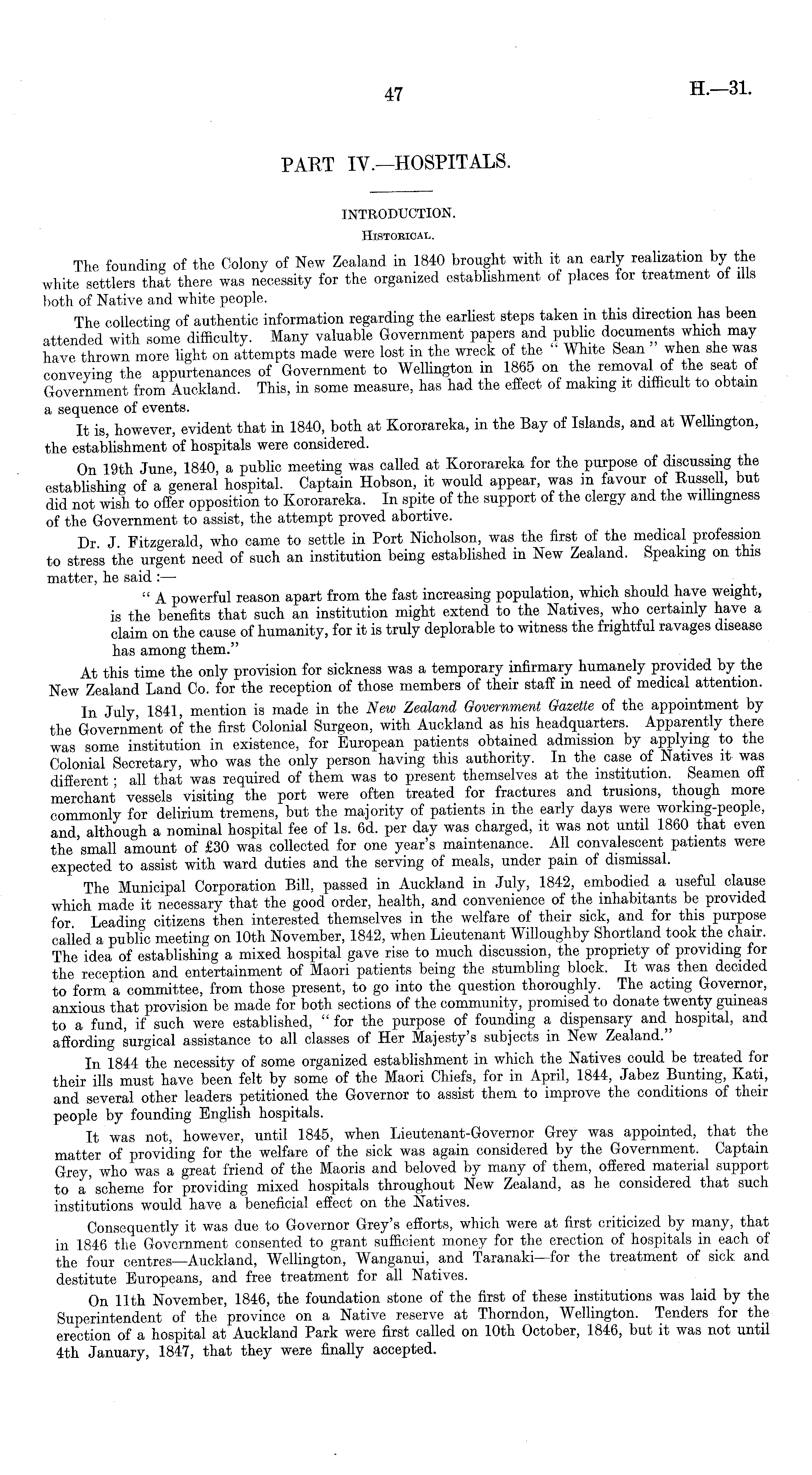 INTRODUCTION. Historical. The founding of the Colony of New Zealand in 1840 brought with it an early realization by the white settlers that there was necessity for the organized establishment of places for treatment of ills both of Native and white people. The collecting of authentic information regarding the earliest steps taken in this direction has been attended with some difficulty. Many valuable Government papers and public documents which may have thrown more light on attempts made were lost in the wreck of the White Sean when she was conveying the appurtenances of Government to Wellington in 1865 on the removal of the seat of Government from Auckland. This, in some measure, has had the effect of making it difficult to obtain a sequence of events. It is, however, evident that in 1840, both at Kororareka, in the Bay of Islands, and at Wellington, the establishment of hospitals were considered. On 19th June 1840, a public meeting was called at Kororareka for the purpose of discussing the establishing of a general hospital. Captain Hobson, it would appear, was in favour of Russell, but did not wish to offer opposition to Kororareka. In spite of the support of the clergy and the willingness of the Government to assist, the attempt proved abortive. Dr. J. Fitzgerald, who came to settle in Port Nicholson, was the first of the medical profession to stress the urgent need of such an institution being established in New Zealand. Speaking on this matter, he said : — " A powerful reason apart from the fast increasing population, which should have weight, is the benefits that such an institution might extend to the Natives, who certainly have a claim on the cause of humanity, for it is truly deplorable to witness the frightful ravages disease has among them." At this time the only provision for sickness was a temporary infirmary humanely provided by the New Zealand Land Co. for the reception of those members of their staff in need of medical attention. Tn July, 1841, mention is made in the New Zealand Government Gazette of the appointment by the Government of the first Colonial Surgeon, with Auckland as his headquarters. Apparently there was some institution in existence, for European patients obtained admission by applying to the Colonial Secretary, who was the only person having this authority. In the case of Natives it was different ; all that was required of them was to present themselves at the institution. Seamen oft merchant vessels visiting the port were often treated for fractures and trusions, though more commonly for delirium tremens, but the majority of patients in the early days were working-people, and although a nominal hospital fee of Is. 6d. per day was charged, it was not until 1860 that even the 'small amount of £30 was collected for one year's maintenance. All convalescent patients were expected to assist with ward duties and the serving of meals, under pain of dismissal. The Municipal Corporation Bill, passed in Auckland in July, 1842, embodied a useful clause which made it necessary that the good order, health, and convenience of the inhabitants be provided for Leading citizens then interested themselves in the welfare of their sick, and for this purpose called a public meeting on 10th November, 1842, when Lieutenant Willoughby Shortland took the chair. The idea of establishing a mixed hospital gave rise to much discussion, the propriety of providing for the reception and entertainment of Maori patients being the stumbling block. It was then decided to form a committee, from those present, to go into the question thoroughly. The acting Governor, anxious that provision be made for both sections of the community, promised to donate twenty guineas to a fund, if such were established, "for the purpose of founding a dispensary and hospital, and affording surgical assistance to all classes of Her Majesty s subjects in New Zealand. In 1844 the necessity of some organized establishment in which the Natives could be treated for their ills must have been felt by some of the Maori Chiefs, for in April, 1844, Jabez Bunting, Kati, and several other leaders petitioned the Governor to assist them to improve the conditions of their people by founding English hospitals. It was not, however, until 1845, when Lieutenant-Governor Grey was appointed, that the matter of providing for the welfare of the sick was again considered by the Government. Captain Grey, who was a great friend of the Maoris and beloved by many of them, offered material supportto a scheme for providing mixed hospitals throughout New Zealand, as he considered that such institutions would have a beneficial effect on the Natives. Consequently it was due to Governor Grey's efforts, which were at first criticized by many, that in 1846 the Government consented to grant sufficient money for the erection of hospitals in each of the four centres —Auckland, Wellington, Wanganui, and Taranaki —for the treatment of sick and destitute Europeans, and free treatment for all Natives. On 11th November, 1846, the foundation stone of the first of these institutions was laid by the Superintendent of the province on a Native reserve at Thorndon, Wellington. Tenders for the erection of a hospital at Auckland Park were first called on 10th October, 1846, but it was not until 4th January, 1847, that they were finally accepted.