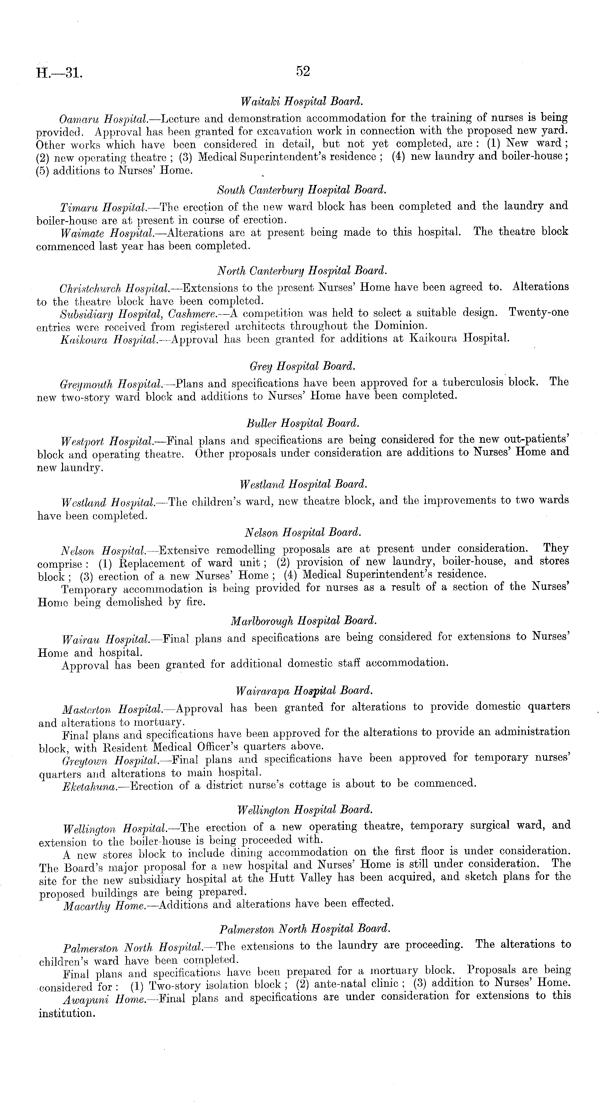 WaitaJci Hospital Board. Oamaru Hospital. —Lecture and demonstration accommodation for the training of nurses is being provided. Approval has been granted for excavation work in connection with the proposed new yard. Other works which have been considered in detail, but not yet completed, are: (1) New ward; (2) new operating theatre ; (3) Medical Superintendent's residence ; (4) new laundry and boiler-house; (5) additions to Nurses' Home. South Canterbury Hospital Board. Timaru Hospital. —The erection of the new ward block has been completed and the laundry and boiler-house are at present in course of erection. Waimate Hospital. —Alterations are at present being made to this hospital. The theatre block commenced last year has been completed. North Canterbury Hospital Board. Christchurch Hospital.—Extensions to the present Nurses' Home have been agreed to. Alterations to the theatre block have been completed. Subsidiary Hospital, Cashmere.—A competition was held to select a suitable design. Twenty-one entries were received from registered architects throughout the Dominion. Kaikoura Hospital.— Approval has been granted for additions at Kaikoura Hospital. Grey Hospital Board. Greymouth Hospital. —Plans and specifications have been approved for a tuberculosis block. The new two-story ward block and additions to Nurses' Home have been completed. JButter Hospital Board. Westport Hospital. —Final plans and specifications are being considered for the new out-patients' block and operating theatre. Other proposals under consideration are additions to Nurses' Home and new laundry. Westland Hospital Board. Westland Hospital—The children's ward, new theatre block, and the improvements to two wards have been completed. Nelson Hospital Board. Nelson Hospital.- Extensive remodelling proposals are at present under consideration. They comprise : (1) Replacement of ward unit; (2) provision of new laundry, boiler-house, and stores block ; (3) erection of a new Nurses' Home ; (4) Medical Superintendent's residence. Temporary accommodation is being provided for nurses as a result of a section of the Nurses' Home being demolished by fire. Marlborough Hospital Board. Wairau Hospital—Final plans and specifications are being considered for extensions to Nurses' Home and hospital. Approval has been granted for additional domestic staff accommodation. Wairarapa Hospital Board. Masterton Hospital— Approval has been granted for alterations to provide domestic quarters and alterations to mortuary. i .... Final plans and specifications have been approved for the alterations to provide an administration block, with Resident Medical Officer's quarters above. Greytown Hospital—Final plans and specifications have been approved for temporary nurses' quarters and alterations to main hospital. Eketahuna. —Erection of a district nurse's cottage is about to be commenced. Wellington Hospital Board. Wellington Hospital.—'The erection of a new operating theatre, temporary surgical ward, and extension to the boiler-house is being proceeded with. A new stores block to include dining accommodation on the first floor is under consideration. The Board's major proposal for a new hospital and Nurses' Home is still under consideration. The site for the new subsidiary hospital at the Hutt Valley has been acquired, and sketch plans for the proposed buildings are being prepared. Maoarthy Home. —Additions and alterations have been effected. Palmerston North Hospital Board. Palmerston North Hospital—The extensions to the laundry are proceeding. The alterations to children's ward have been completed. Final plans and specifications have been prepared for a mortuary block. Proposals are being considered for : (1) Two-story isolation block ; (2) ante-natal clinic ; (3) addition to Nurses' Home. Awapuni Home.—Final plans and specifications are under consideration for extensions to this institution.