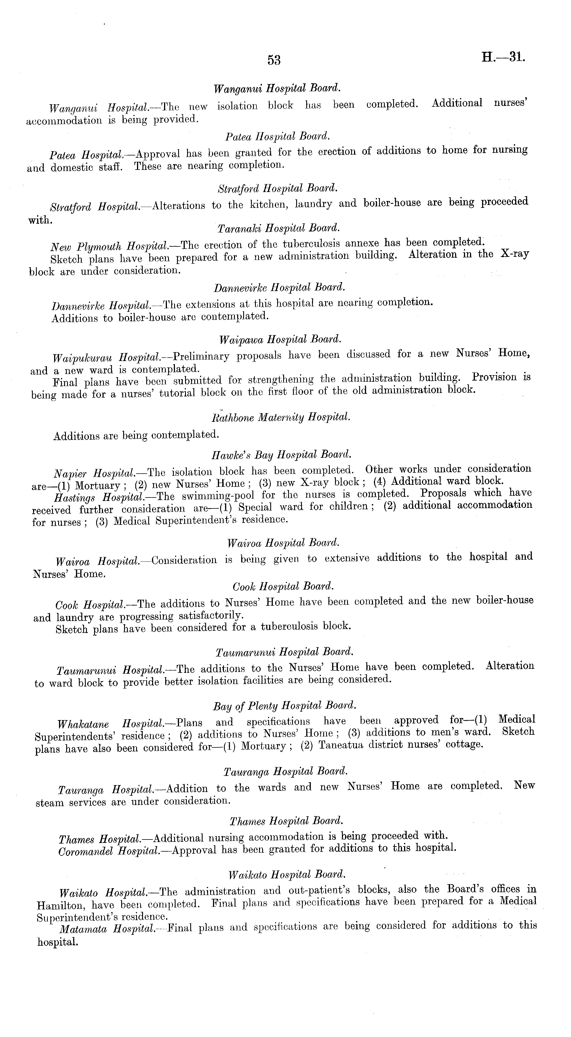 Wanganui Hospital Board. Wanganui Hospital. —The new isolation block has been completed. Additional nurses accommodation is being provided. Patea Hospital Board. Patea Hospital—Approval has been granted for the erection of additions to home for nursing and domestic staff. These are nearing completion. Stratford Hospital Board. Stratford Hospital.—Alterations to the kitchen, laundry and boiler-house are being proceeded with. Taranaki Hospital Board. New Plymouth Hospital.—The erection of the tuberculosis annexe has been completed Sketch plans have been prepared for a new administration building. Alteration in the X-ray block are under consideration. Dannevirke Hospital Board. Dannevirke Hospital. —The extensions at this hospital are nearing completion. Additions to boiler-house are contemplated. Waipawa Hospital Board. W aipukurau Hospital. —Preliminary proposals have been discussed for a new Nurses' Home, and a new ward is contemplated. . . . ~, t, Final plans have been submitted for strengthening the administration building. Provision is being made for a nurses' tutorial block on the first floor of the old administration block. % Rathbone Maternity Hospital. Additions are being contemplated. Hawke's Bay Hospital Board. Napier Hospital— The isolation block has been completed. Other works under consideration are—(l) Mortuary ; (2) new Nurses' Home ; (3) new X-ray block ; (4) Additional ward block. Hastinqs Hospital. —The swimming-pool for the nurses is completed. Proposals which have received further consideration are—(l) Special ward for children ; (2) additional accommodation for nurses ; (3) Medical Superintendent s residence. Wairoa Hospital Board. Wairoa Hospital. —Consideration is being given to extensive additions to the hospital and Nurses' Home. Cook Hospital Board. Cook Hospital.—The additions to Nurses' Home have been completed and the new boiler-house and laundry are progressing satisfactorily. Sketch plans have been considered for a tuberculosis block. Taumarunui Hospital Board. Taumarunui Hospital—The additions to the Nurses' Home have been completed. Alteration to ward block to provide better isolation facilities are being considered. Bay of Plenty Hospital Board. Whakatane Hospital. —Plans and specifications have been approved for—(1) Medical Superintendents' residence ; (2) additions to Nurses' Home ; (3) additions to men's ward. Sketch plans have also been considered for—(1) Mortuary ; (2) Taneatua district nurses' cottage. Tauranga Hospital Board. Tauranga Hospital—Addition to the wards and new Nurses' Home are completed. New steam services are under consideration. Thames Hospital Board. Thames Hospital.—Additional nursing accommodation is being proceeded with. Coromandel Hospital.—Approval has been granted for additions to this hospital. Waikato Hospital Board. Waikato Hospital—The administration and out-patient's blocks, also the Board's offices in Hamilton, have been completed. Final plans and specifications have been prepared for a Medical Superintendent's residence. . . Matamata Hospital- Final plans and specifications are being considered for additions to this hospital.