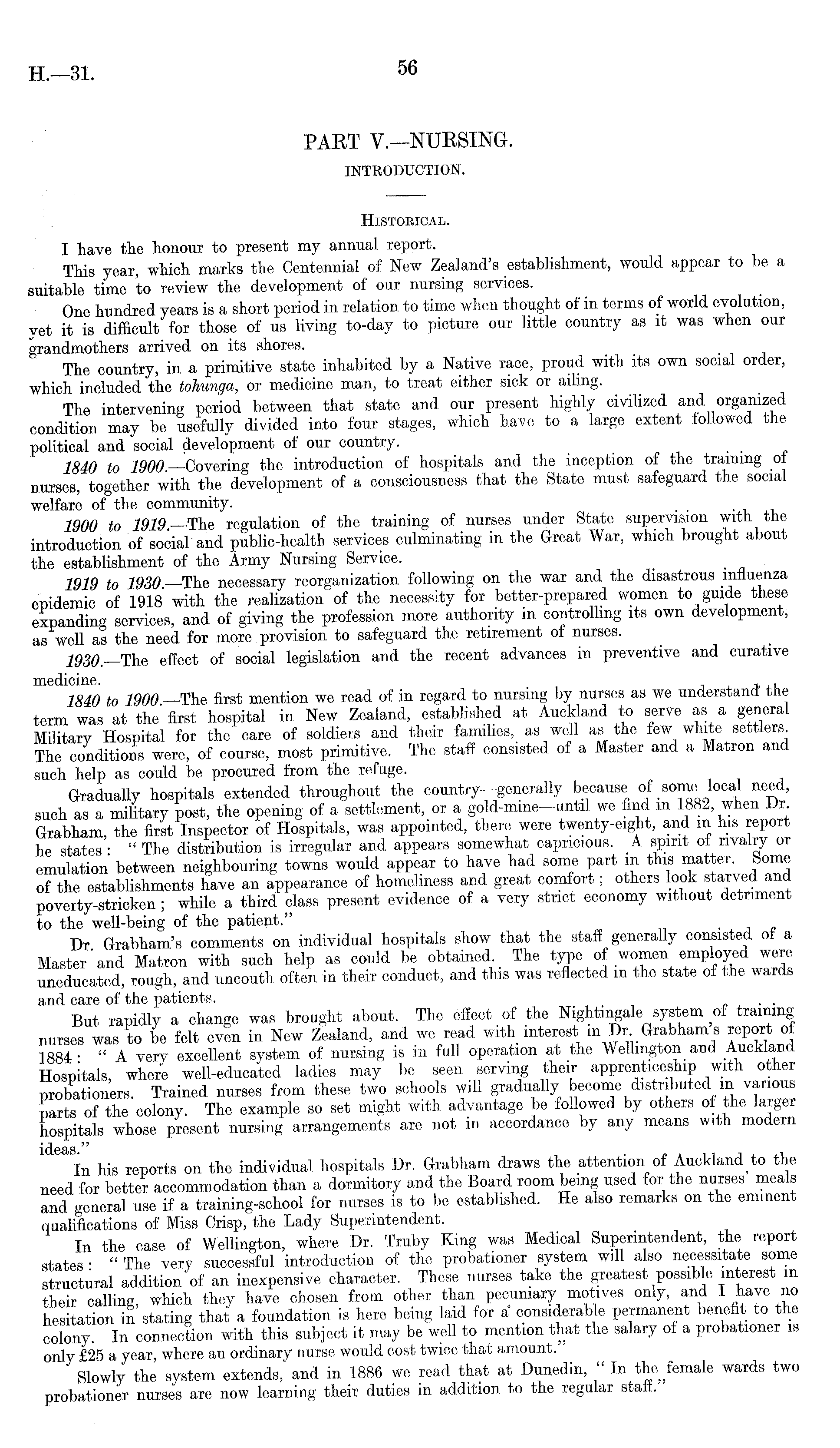 Historical. I have the honour to present my annual report. This year, which marks the Centennial of New Zealand's establishment, would appear to be a suitable time to review the development of our nursing services. One hundred years is a short period in relation to time when thought of in terms of world evolution, yet it is difficult for those of us living to-day to picture our little country as it was when our grandmothers arrived on its shores. The country, in a primitive state inhabited by a Native race, proud with its own social order, which included the tohunga, or medicine man, to treat either sick 01 ailing. The intervening period between that state and our present highly civilized and organized condition may be usefully divided into four stages, which have to a large extent followed the political and social development of our country. 1840 to 1900.—Covering the introduction of hospitals and the inception of the training of nurses, together with the development of a consciousness that the State must safeguard the socia welfare of the community. 1900 to 1919.—The regulation of the training of nurses under State supervision with the introduction of social and public-health services culminating in the Great War, which brought about the establishment of the Army Nursing Service. . 1919 to 1930 —The necessary reorganization following on the war and the disastrous influenza epidemic of 1918 with the realization of the necessity for better-prepared women to guide these expanding services, and of giving the profession more authority in controlling its own development, as well as the need for more provision to safeguard the retirement of nurses. 1930. The effect of social legislation and the recent advances in preventive and curative medicine. _ . , 1840 to 1900 —The first mention we read of in regard to nursing by nurses as we understand the term was at the first hospital in New Zealand, established at Auckland to serve as a general Military Hospital for the care of soldiers and their families, as well as the few white settlers The conditions were, of course, most primitive. The staff consisted of a Master and a Matron and such help as could be procured from the refuge. Gradually hospitals extended throughout the country—generally because of some local need, such as a military post, the opening of a settlement, or a gold-mme-until we find m 1882, when Dr Grabham, the first Inspector of Hospitals, was appointed, there were twenty-eight, and in his report he states : " The distribution is irregular and appears somewhat capricious. A spirit of rivalry or emulation between neighbouring towns would appear to have had some part in this matter. Some of the establishments have an appearance of homeliness and great comfort; others look starved and poverty-stricken ; while a third class present evidence of a very strict economy without detriment to the well-being of the patient." in Dr Grabham's comments on individual hospitals show that the staff generally consisted ot a Master'and Matron with such help as could be obtained. The type of worm 3 n employed were uneducated, rough, and uncouth often in their conduct, and this was reflected m the state of the wards and care of the patients. ... • • But rapidly a change was brought about. The effect of the Nightingale system of training nurses was to be felt even in New Zealand, and we read with interest in Di' Grabham s report of 1884 • " A very excellent system of nursing is m full operation at the Wellington and Auckland Hospitals, where well-educated ladies may be seen serving their apprenticeship with other probationers. Trained nurses from these two schools will gradually become distributed in various parts of the colony. The example so set might with advantage be followed by others of the larger hospitals whose present nursing arrangements are not in accordance by any means with modern his reports on the individual hospitals Dr. Grabham draws the attention of Auckland to the need for better accommodation than a dormitory and the Board room being used for the nurses meals and general use if a training-school for nurses is to be established. He also remarks on the eminent qualifications of Miss Crisp, the Lady Superintendent. In the case of Wellington, where Dr. Truby King was Medical Superintendent, the, report states : " The very successful introduction of the probationer system will also necessitate some structural addition of an inexpensive character. These nurses take the greatest possible interest in their calling, which they have chosen from other than pecuniary motives only, and I have no hesitation in stating that a foundation is here being laid for a considerable permanent benefit to the colony. In connection with this subject it may be well to mention that the salary of a probationer is only £25 a year, where an ordinary nurse would cost twice that amount. Slowly the system extends, and in 1886 we read that at Dunedin, " In the female wards two probationer nurses are now learning their duties in addition to the regular stall.