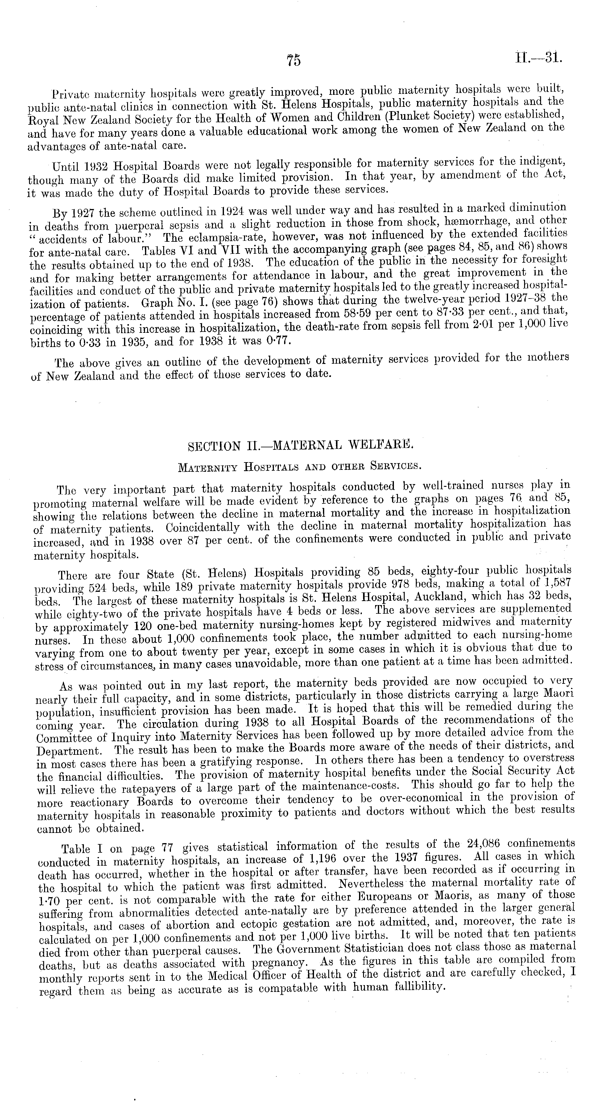 Private maternity hospitals were greatly improved, more public maternity hospitals were built, public ante-natal clinics in connection with St. Helens Hospitals, public maternity hospitals and the Royal New Zealand Society for the Health of Women and Children (Plunket Society) were established, and have for many years done a valuable educational work among the women of New Zealand on the advantages of ante-natal care. Until 1932 Hospital Boards were not legally responsible for maternity services for the indigent, though many of the Boards did make limited provision. In that year, by amendment of the Act, it was made the duty of Hospital Boards to provide these services. By 1927 the scheme outlined in 1924 was well under way and has resulted in a marked diminution in deaths from puerperal sepsis and a slight reduction in those from shock, haemorrhage,.and other "accidents of labour." The eclampsia-rate, however, was not influenced by the extended facilities for ante-natal care. Tables VI and VII with the accompanying graph (see pages 84, 85, and 86) shows the results obtained up to the end of 1938. The education of the public in the necessity for foresight and for making better arrangements for attendance in labour, and the great improvement in the facilities and conduct of the public and private maternity hospitals led to the greatly increased hospitalization of patients. Graph No. I. (see page 76) shows that during the twelve-year period 1927-38 the percentage of patients attended in hospitals increased from 58-59 per cent to 87-33 per cent, and that, coinciding with this increase in hospitalization, the death-rate from sepsis fell from 2-01 per 1,000 five births to 0-33 in 1935, and for 1938 it was 0-77. The above gives an outline of the development of maternity services provided for the mothers of New Zealand and the effect of those services to date. SECTION lI.—MATERNAL WELFARE. Maternity Hospitals and other Services. The very important part that maternity hospitals conducted by well-trained nurses play in promoting maternal welfare will be made evident by reference to the graphs on pages 76 and 85, showing the relations between the decline in maternal mortality and the increase in hospitalization of maternity patients. Coincidentally with the decline in maternal mortality hospitalization has increased, and in 1938 over 87 per cent, of the confinements were conducted in public and private maternity hospitals. There are four State (St. Helens) Hospitals providing 85 beds, eighty-four public hospitals providing 524 beds, while 189 private maternity hospitals provide 978 beds, making a total of 1,587 beds The largest of these maternity hospitals is St. Helens Hospital, Auckland, which has 32 beds, while eighty-two of the private hospitals have 4 beds or less. The above services are supplemented by approximately 120 one-bed maternity nursing-homes kept by registered midwives and maternity nurses. In these about 1,000 confinements took place, the number admitted to each nursing-home varying from one to about twenty per year, except in some cases in which it is obvious that due to stress of circumstances., in many cases unavoidable, more than one patient at a time has been admitted. As was pointed out in my last report, the maternity beds provided are now occupied to very nearly their full capacity, and in some districts, particularly in those districts carrying a large Maori population, insufficient provision has been made. It is hoped that this will be remedied during the coming year. The circulation during 1938 to all Hospital Boards of the recommendations of the Committee of Inquiry into Maternity Services has been followed up by more detailed advice from the Department The result has been to make the Boards more aware of the needs of their districts, and in most cases there has been a gratifying response. In others there has been a tendency to overstress the financial difficulties. The provision of maternity hospital benefits under the Social Security Act will relieve the ratepayers of a large part of the maintenance-costs. This should go far to help the more reactionary Boards to overcome their tendency to be over-economical in the provision of maternity hospitals in reasonable proximity to patients and doctors without which the best results cannot bo obtained. Table I on page 77 gives statistical information of the results of the 24,086 confinements conducted in maternity hospitals, an increase of 1,196 over the 1937 figures. AH cases m which death has occurred, whether in the hospital or after transfer, have been recorded as if occurring in the hospital to which the patient was first admitted. Nevertheless the maternal mortality rate of 1-70 per cent, is not comparable with the rate for either Europeans or Maoris, as many of those suffering from abnormalities detected ante-natally are by preference attended m the larger genera hospitals, and cases of abortion and ectopic gestation are not admitted, and, moreover, the rate is calculated on per 1,000 confinements and not per 1,000 live It will be noted that ten patients died from other than puerperal causes. The Government Statistician does not class those as maternal deaths, but as deaths associated with pregnancy. As the figures in this table are compiled from monthly reports sent in to the Medical Officer of Health of the district and are carefully checked, 1 regard them as being as accurate as is compatable with human fallibility.