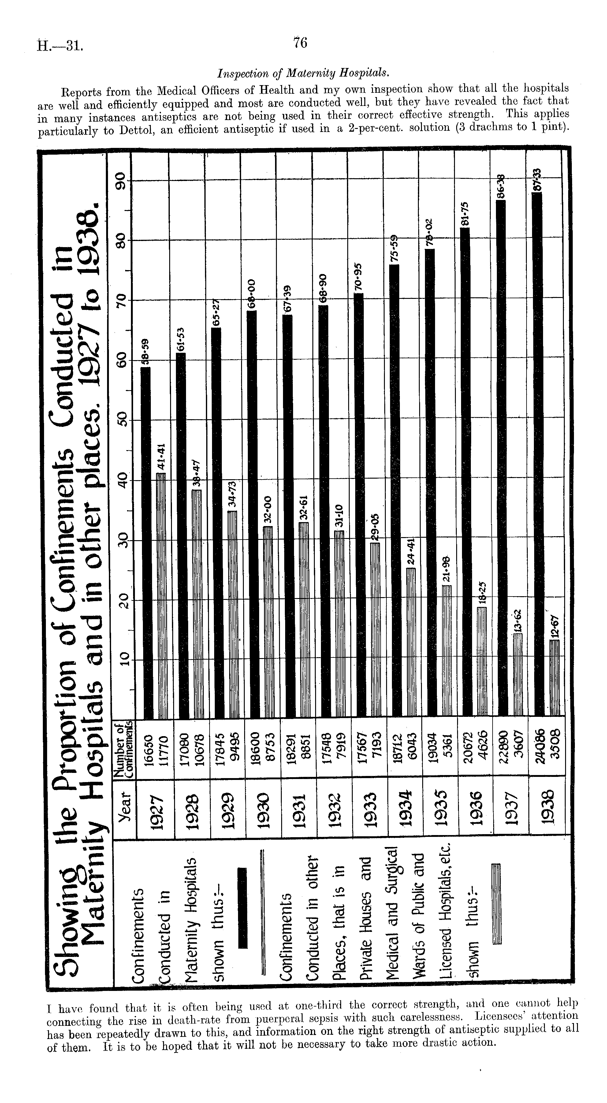Inspection of Maternity Hospitals. Reports from the Medical Officers of Health and my own inspection show that all the hospitals are well and efficiently equipped and most are conducted well, but they have revealed the fact that in many instances antiseptics are not being used in their correct effective strength. This applies particularly to Dettol, an efficient antiseptic if used in a 2-per-cent. solution (3 drachms to 1 pint).
