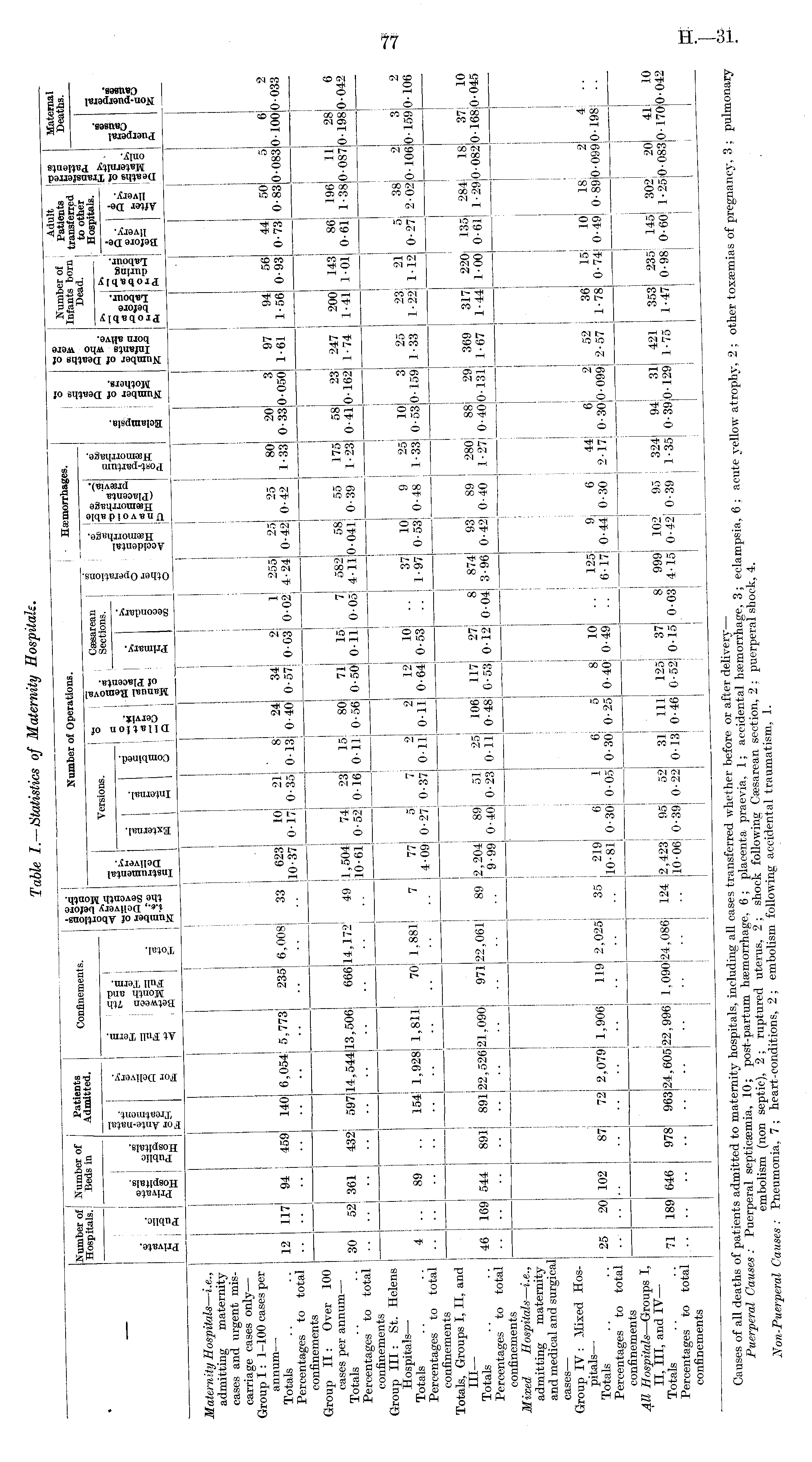 9 auuii T3 43 maternal -- — — . — " ~ ,,., .„„ r rh,i,'i>< ° ° 6 Xunibw of Patients 2 g Deaths. _ „ .. . j>&4 \ Number of Operations. MsemorriraK . Infants born transferred gti I Number of Number of Patients Confinements. © 2 h — , S -g Dead. to other 2 5 Hospitals. Beds in Admitted. "a I Cajsarean | S5, 3 £ -3 S S Q-= -| Hospitals. 3 g 1 ; i Versions. " o a Sections. ~ 5 as | gfi 2 I ~ I j ■ % S,„- ' - .,«us III a.. P li TTiTT h $ TT I ll Iff 8 1 il IB U M > VP*? f i i if. if u i 3 i**\ i p r i i! i .5° a s § § ,* * » i» !« * '* 1 1 ! — ' — j j ~ Maternity Hospitals —i.e., admitting maternity cases and urgent miscarriage cases only — Group I: 1-100 cases per 9? g4 56 44 50 5 6 2 To—".. - 12 117 94 469 140 6,054 5,773 235 6,008 33 10 ® 21 q * q * ® 34 «J 0-2 0-2 Percentages to total .. . • • • • • • • • • • • • • * * confinements Group II: Over 100 247 2Q0 143 86 196 n 28 6 ToS SPer_ 30 52 361 432 597 14,54413,506 66614,172 49 1,504 q 74 # 23 q 15 # 80 q « o . £ 0 -ol O-cSo-S Percentages to total .. • • • • • • • • • • • • * * " confinements Group III: St. Helens 23 21 5 38 2 3 2 ,£yT .. 4 .. « .. 1M '.Ml » 1.8,1 7 4 77 ,.g „.g ;; „.£ 0« 0-5„M5. _0^^02 0006 0^0006 Percentages to total .... .. • • • • • • • • • • * * confinements Totals, Groups I, II, and 3g9 gn 22Q 13g 2 84 18 37 10 TotSr .. .. 46 169 544 891 89122,526 21,090 97122,061 89 2,204 0-S 0-M 3 § 96 0-42 0-40 1-67 0^ Percentages to total .. - • • • • • • • • • • • * * i confinements Mixed Hospitals —i.e., admitting maternity and medical and surgical cases — Group IV: Mixed Hos- 9 36 15 10 18 2 4 Totalf - .. .. 25 20 102 87 72 2,079 1,906 119 2,025 35 l_ .. # 125 J 2 . 57 0 . 74 0 . 49 Q.890-0990- 198^ Percentages to total . • .... • • • • • • • • • • * * confinements All Hospitals —Groups I. «« 235 145 302 20 41 10 Totals" 1 ' and 1V ~ .. 71 189 646 978 963 24,605 22,996 1,09024,086 124 2,423 95 JU W9 ® 9o 0 . 390 . 129 x . 75 0-98 0-60 1-25 0 0830-1700-042 Percentages to total confinements _ * "