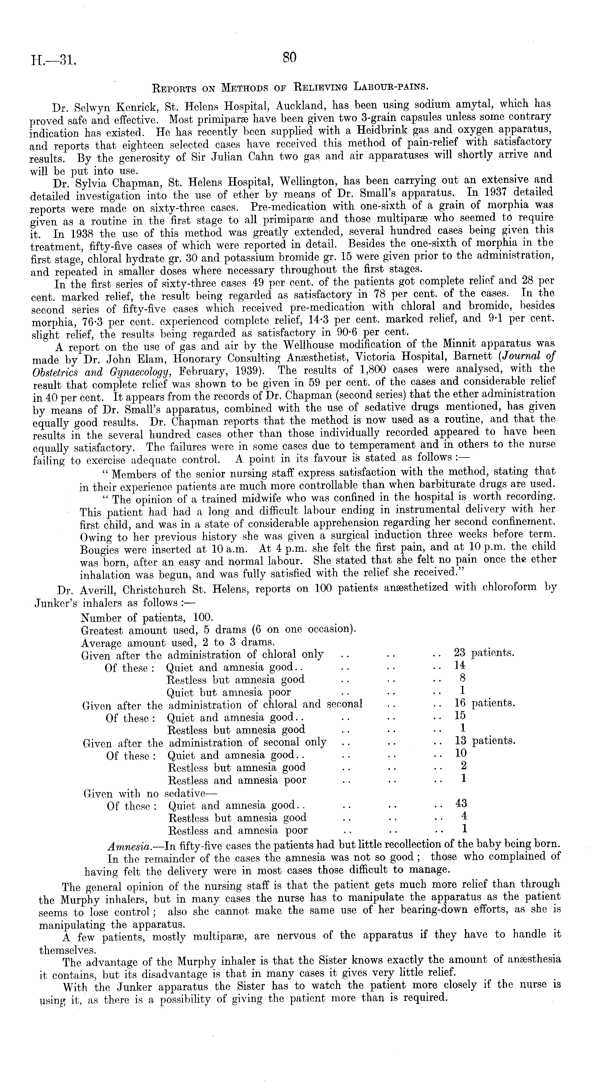 Reports on Methods of Relieving Labouk-pains. Dr. Selwyn Kcnrick, St. Helens Hospital, Auckland, lias been using sodium amytal, which has proved safe and effective. Most primiparee have been given two 3-grain capsules unless some contrary indication has existed. He has recently been supplied with a Heidbrink gas and oxygen apparatus, and reports that eighteen selected cases have received this method of pain-relief with satisfactory results. By the generosity of Sir Julian Cahn two gas and air apparatuses will shortly arrive and will be put into use. Dr. Sylvia Chapman, St. Helens Hospital, Wellington, has been carrying out an extensive and detailed investigation into the use of ether by means of Dr. Small s apparatus. In 1937 detailed reports were made on sixty-three cases. Pre-medication with one-sixth of a grain of morphia was given as a routine in the first stage to all primiparse and those multipara who seemed to require it. In 1938 the use of this method was greatly extended, several hundred cases being given this treatment, fifty-five cases of which were reported in detail. Besides the one-sixth of morphia in the first stage, chloral hydrate gr. 30 and potassium bromide gr. 15 were given prior to the administration, and repeated in smaller doses where necessary throughout the first stages. In the first series of sixty-three cases 49 per cent, of the patients got complete relief and 28 per cent, marked relief, the result being regarded as satisfactory in 78 per cent, of the cases. In the second series of fifty-five cases which received pre-medication with chloral and bromide, besides morphia, 76-3 per cent, experienced complete relief, 14-3 per cent, marked relief, and 9-1 per cent, slight relief, the results being regarded as satisfactory in 90-6 per cent. A report on the use of gas and air by the Wellhouse modification of the Minnit apparatus was made by Dr. John Elam, Honorary Consulting Anaesthetist, Victoria Hospital, Barnett (Journal of Obstetrics and Gynaecology, February, 1939). The results of 1,800 cases were analysed, with the result that complete relief was shown to be given in 59 per cent, of the cases and considerable relief in 40 per cent. It appears from the records of Dr. Chapman (second series) that the ether administration by means of Dr. Small's apparatus, combined with the use of sedative drugs mentioned, has given equally good results. Dr. Chapman reports that the method is now used as a routine, and that the results in the several hundred cases other than those individually recorded appeared to have been equally satisfactory. The failures were in some cases due to temperament and in others to the nurse failing to exercise adequate control. A point in its favour is stated as follows " Members of the senior nursing staff express satisfaction with the method, stating that in their experience patients are much more controllable than when barbiturate drugs are used. " The opinion of a trained midwife who was confined in the hospital is worth recording. This patient had had a long and difficult labour ending in instrumental delivery with her first child, and was in a state of considerable apprehension regarding her second confinement. Owing to her previous history she was given a surgical induction three weeks before term. Bougies were inserted at 10 a.m. At 4 p.m. she felt the first pain, and at 10 p.m. the child was born, after an easy and normal labour. She stated that she felt no pain once the ether inhalation was begun, and was fully satisfied with the relief she received." Dr. Averill, Christchurch St. Helens, reports on 100 patients anaesthetized with chloroform by Junker's inhalers as follows : — Number of patients, 100. Greatest amount used, 5 drams (6 on one occasion). Average amount used, 2 to 3 drams. Given after the administration of chloral only .. .. .. 23 patients. Of these : Quiet and amnesia good.. .. • • ..14 Restless but amnesia good .. .. 8 Quiet but amnesia poor . . ■ ■ • • I Given after the administration of chloral and Seconal .. 16 patients. Of these : Quiet and amnesia good.. .. .. .. 15 Restless but amnesia good .. ■ • .. 1 Given after the administration of Seconal only .. .. 13 patients. Of these : Quiet and amnesia good.. .. .. .. 10 Restless but amnesia good . . .. ■ ■ 2 Restless and amnesia poor .. .. .. 1 Given with no sedative — Of these : Quiet and amnesia good.. .. .. .. 43 Restless but amnesia good .. .. .. 4 Restless and amnesia poor .. .. • • 1 Amnesia. —In fifty-five cases the patients had but little recollection of the baby being born. In the remainder of the cases the amnesia was not so good ; those who complained of having felt the delivery were in most cases those difficult to manage. The general opinion of the nursing staff is that the patient gets much more relief than through the Murphy inhalers, but in many cases the nurse has to manipulate the apparatus as the patient seems to lose control; also she cannot make the same use of her bearing-down efforts, as she is manipulating the apparatus. A few patients, mostly multiparee, are nervous of the apparatus if they have to handle it themselves. The advantage of the Murphy inhaler is that the Sister knows exactly the amount of anaesthesia it contains, but its disadvantage is that in many cases it gives very little relief. With the Junker apparatus the Sister has to watch the patient more closely if the nurse is using it, as there is a possibility of giving the patient more than is required.