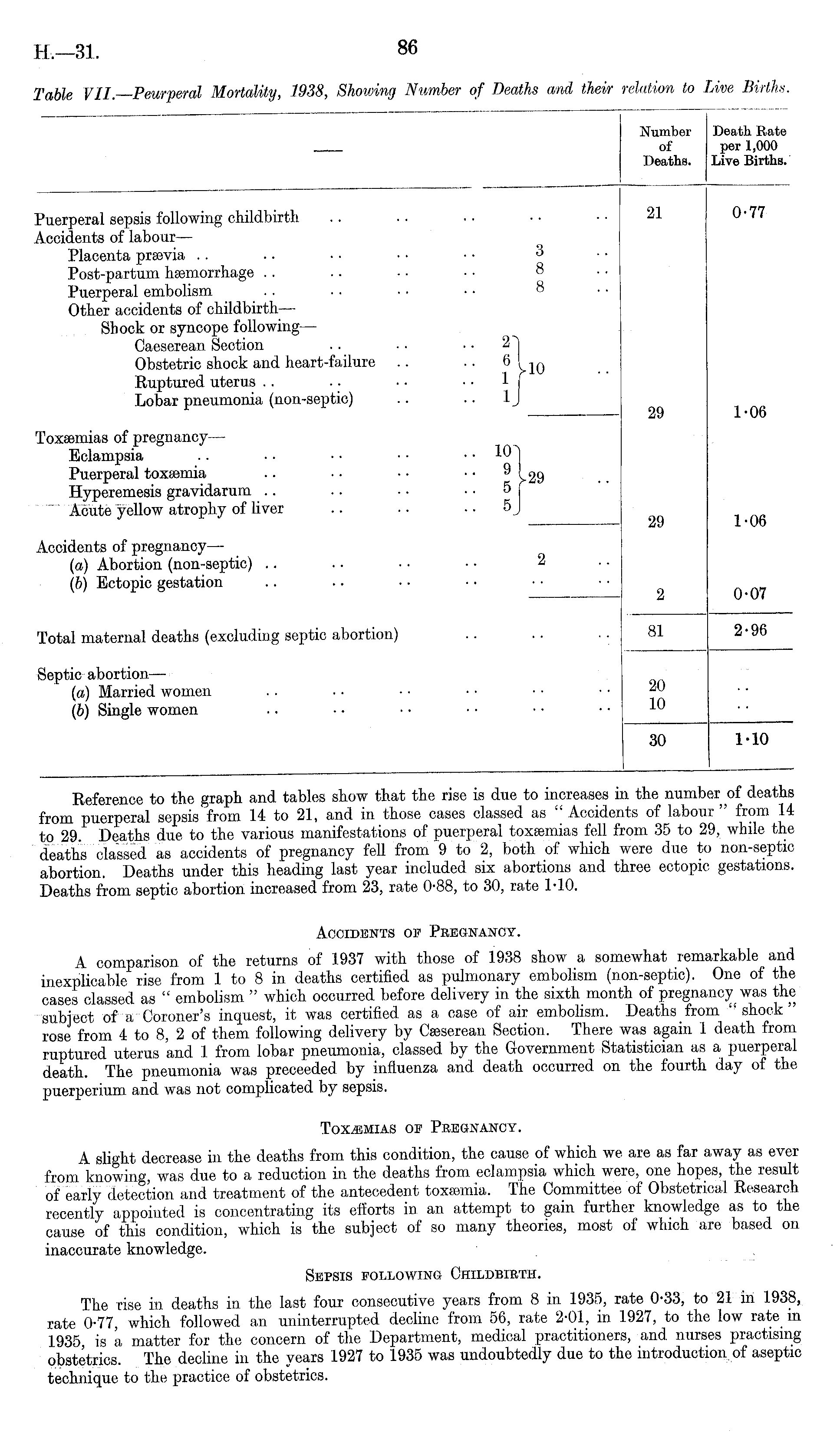 Reference to the graph and tables show that the rise is due to increases in the number of deaths from puerperal sepsis from 14 to 21, and in those cases classed as " Accidents of labour " from 14 to 29 Deaths due to the various manifestations of puerperal toxaemias fell from 35 to 29, while the deaths classed as accidents of pregnancy fell from 9 to 2, both of which were due to non-septic abortion. Deaths under this heading last year included six abortions and three ectopic gestations. Deaths from septic abortion increased from 23, rate 0-88, to 30, rate I*lo. Accidents of Pregnancy. A comparison of the returns of 1937 with those of 1938 show a somewhat remarkable and inexplicable rise from 1 to 8 in deaths certified as pulmonary embolism (non-septic). One of the cases classed as " embolism " which occurred before delivery in the sixth month of pregnancy was the subject of a Coroner's inquest, it was certified as a case of air embolism. Deaths from "shock rose from 4toB, 2 of them following delivery by Cseserean Section. There was again 1 death from ruptured uterus and 1 from lobar pneumonia, classed by the Government Statistician as a puerperal death. The pneumonia was preceeded by influenza and death occurred on the fourth day of the puerperium and was not complicated by sepsis. Toxemias of Pregnancy. A slight decrease in the deaths from this condition, the cause of which we are as far away as ever from knowing, was due to a reduction in the deaths from eclampsia which were, one hopes, the result of early detection and treatment of the antecedent toxtemia. The Committee of Obstetrical Research recently appointed is concentrating its efforts in an attempt to gain further knowledge as to the cause of this condition, which is the subject of so many theories, most of which are based on inaccurate knowledge. Sepsis following Childbirth. The rise in deaths in the last four consecutive years from 8 in 1935, rate 0-33, to 21 in 1938, rate 0-77, which followed an uninterrupted decline from 56, rate 2-01, in 1927, to the low rate m 1935 is a matter for the concern of the Department, medical practitioners, and nurses practising obstetrics. The decline in the years 1927 to 1935 was undoubtedly due to the introduction of aseptic technique to the practice of obstetrics.