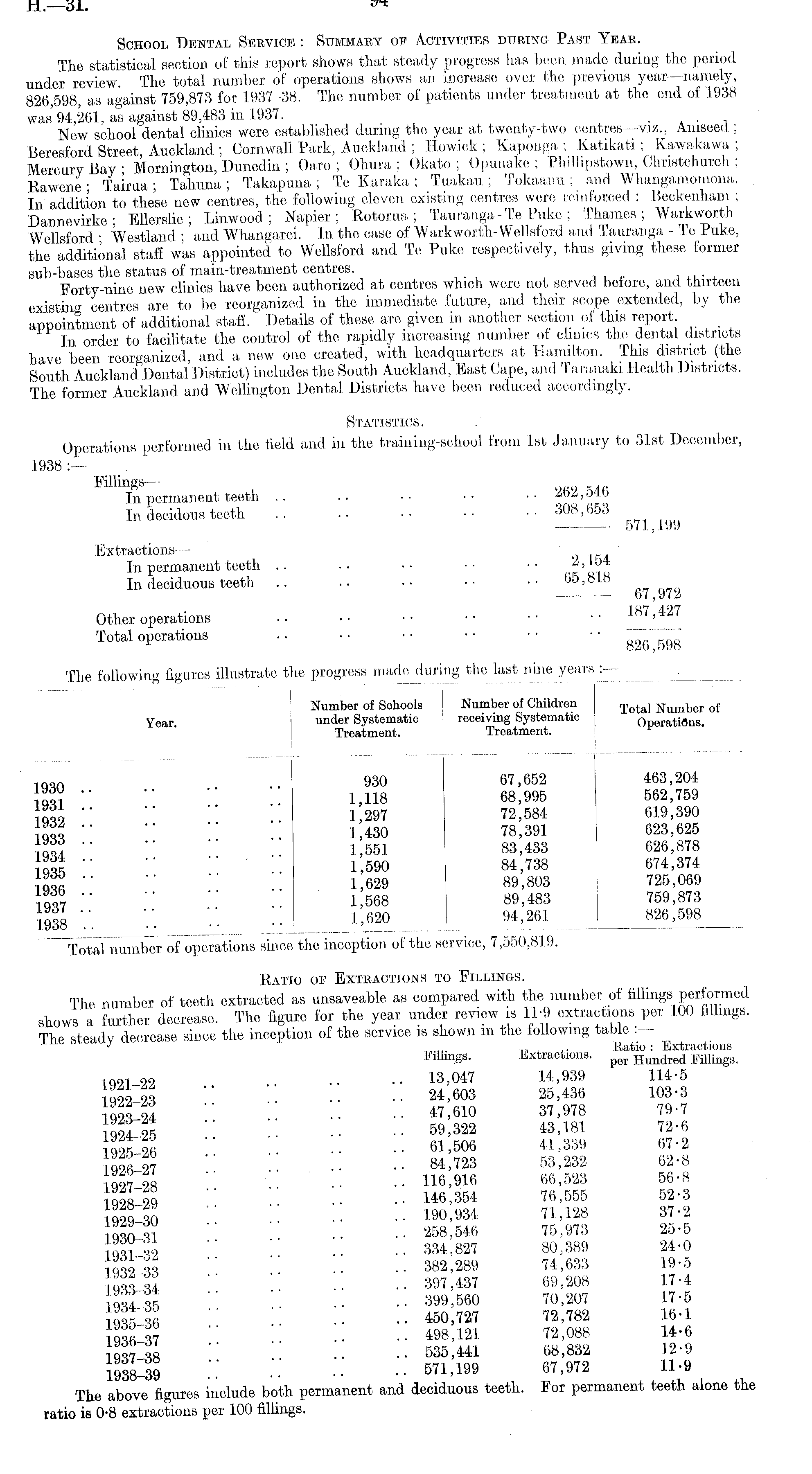 Total number of operations since the inception of the service, 7,550,819. Ratio of Extractions to Fillings. The number of teeth extracted as unsaveable as compared with the number of fillings performed shows a further decrease. The figure for the year under review is 11-9 extractions per 100 fillings. The steady decrease since the inception of the service is shown in the following table J Ratio: Extractions Fillings. Extractions. per Hundred killings. iQoioo .. .. 13,047 14,939 114-5 ■' " .. .. 24,603 25,436 103-3 liiil " " .. .. 47,610 37,978 79-7 " .. ..59,322 43,181 72-6 " :: .. .. 61,506 41,339 67-2 109*07 ' .. .. 84,723 53,232 62-8 ,1 " .. 116,916 66,523 56-8 IQ9R 9Q " ■ •• 146,354 76,555 52-3 JaSio " " •• 190,934 71,128 37-2 iQonJi " ' . 258,546 75,973 25-5 {nolloo ' ... 334,827 80,389 24-0 1009 oo " . .. 382,289 74,633 19-5 }fjtZ " " .. .. 397,437 69,208 17-4 00435 " ;; .. .. 399,560 70,207 17-5 iql o fi " .. .. 450,727 72,782 16-1 Infi; •• ' . .. 498,121 72,088 14-6 1007 OR " " .. .. 535,441 68,832 12-9 1938139 •• 571,199 67,972 11-9 The above figures include both permanent and deciduous teeth. For permanent teeth alone the ratio is 0-8 extractions per 100 fillings.