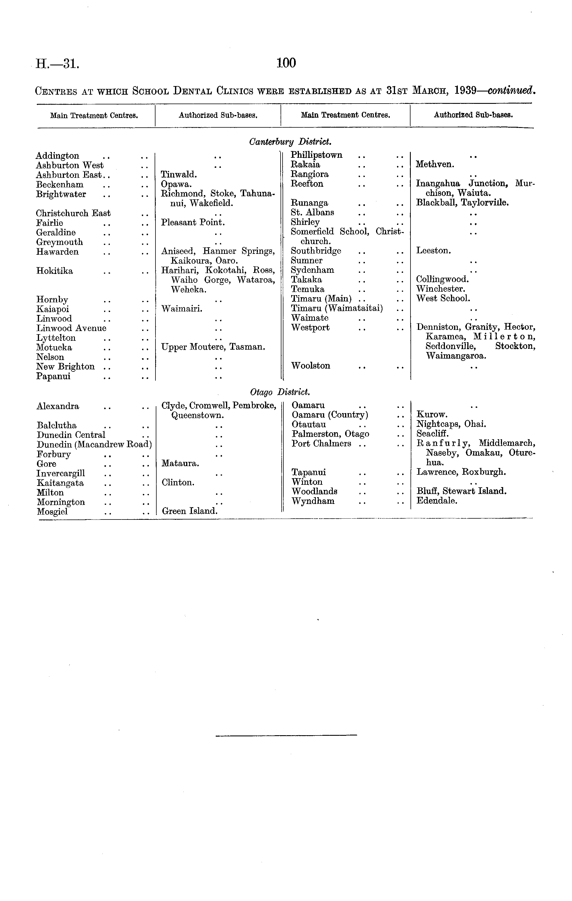 Main Treatment Centres. Authorized Sub-bases. Main Treatment Centres. Authorized Sub-bases. Canterbury District. Addington .. .. .. Phillipstown Ashburton West .. .. Rakaia .. .. Methven. Ashburton East.. .. Tinwald. Rangiora Beckenham .. .. Opawa. Reefton .. .. Inangahua Junction, MurBrightwater .. .. Richmond, Stoke, Tahuna- chison, Waiuta. nui, Wakefield. Runanga .. .. Blackball, Taylorville. Christchurch East .. .. St. Albans Eairlie .. .. Pleasant Point. Shirley Geraldine .. .. .. Somerfield School, ChristGreymouth .. .. .. church. Hawarden .. .. Aniseed, Hanmer Springs, Southbridge .. .. Leeston. Kaikoura, Oaro. Sumnor Hokitika .. .. Harihari, Kokotahi, Ross, Sydenham Waiho Gorge, Wataroa, Takaka .. .. Collingwood. Weheka. Temuka .. .. Winchester. Hornby .. .. .. Timaru (Main) .. .. West School. Kaiapoi .. .. Waimairi. Timaru (Waimataitai) Linwood .. .. .. Waimate Linwood Avenue .. .. Westport .. .. Denniston, Granity, Hector, Lyttelton .. .. .. Karamea, Millerton, Motueka .. .. Upper Moutere, Tasman. Seddonville, Stockton, Nelson .. .. .. Waimangaroa. New Brighton .. .. .. Woolston Papanui Otago District. Alexandra .. .. Clyde, Cromwell, Pembroke, Oamaru Queenstown. Oamaru (Country) .. Kurow. Balclutha .. .. .. Otautau .. .. Nightcaps, Ohai. Dunedin Central .. .. Palmerston, Otago .. Seacliff. Dunedin (MacandrewRoad) .. Port Chalmers .. .. Ranfurly, Middlemarch, For bu r y .. .. .. Naseby, Omakau, OtureGore .. .. Mataura. hua. Invercargill .. .. .. Tapanui .. .. Lawrence, Roxburgh. Kaitangata .. .. Clinton. Winton Milton .. .. .. Woodlands .. .. Bluff, Stewart Island. Mornington .. .. .. Wyndham .. .. Edendale. Mosgiel .. .. Green Island.