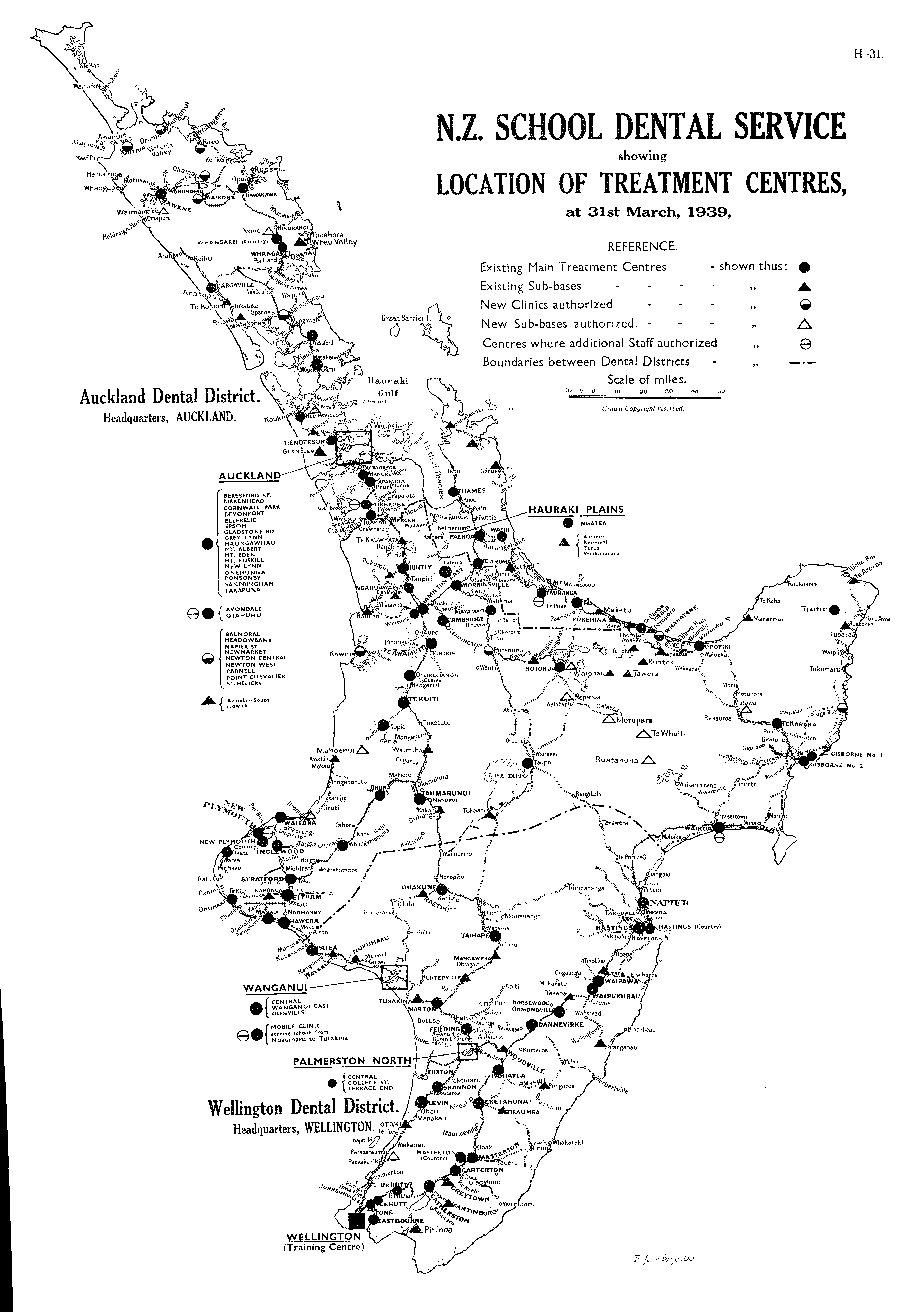 N.Z. SCHOOL DENTAL SERVICE showing LOCATION OF TREATMENT CENTRES, at 31st March, 1939,