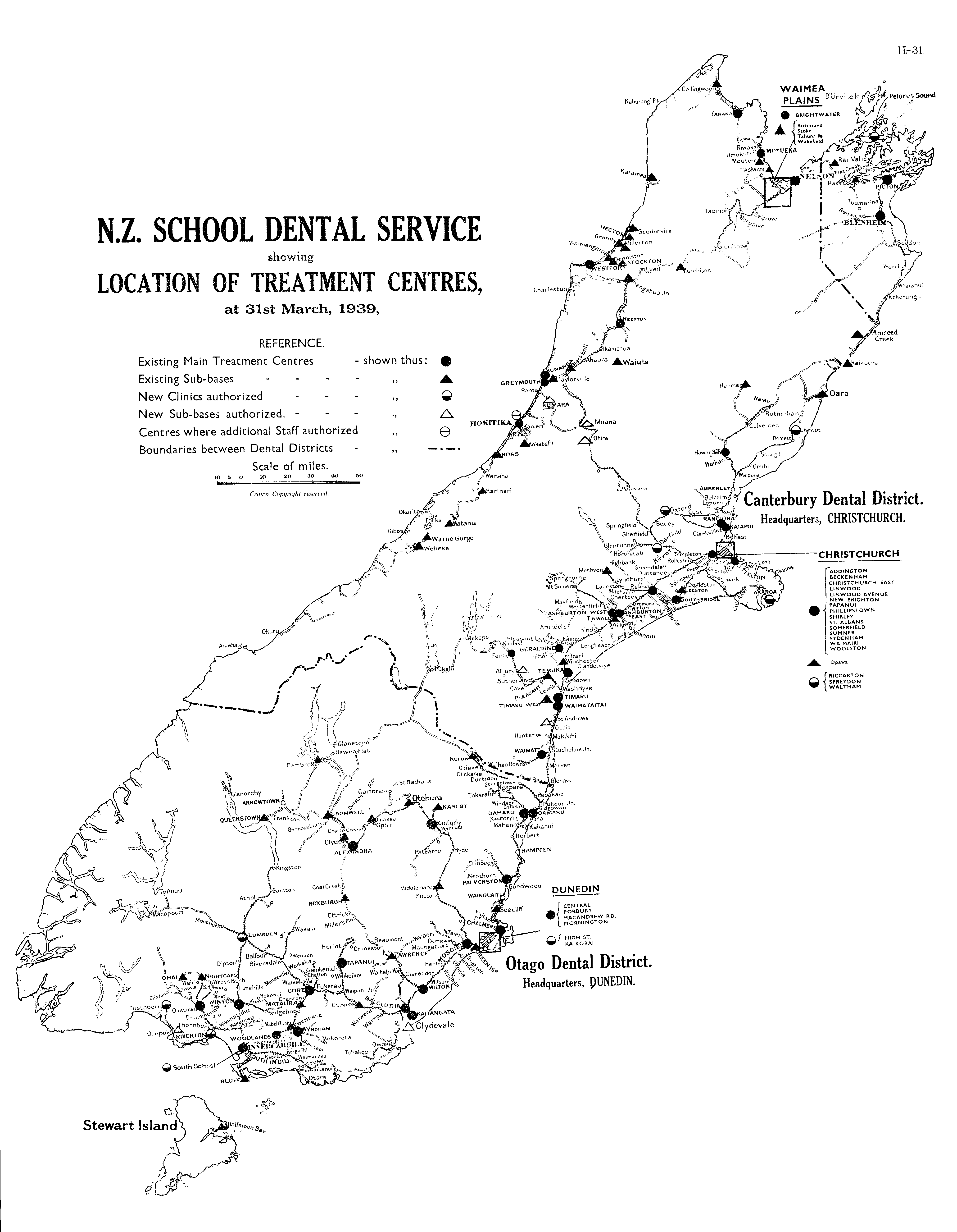 N.Z. SCHOOL DENTAL SERVICE showing LOCATION OF TREATMENT CENTRES, at 31st March, 1939,