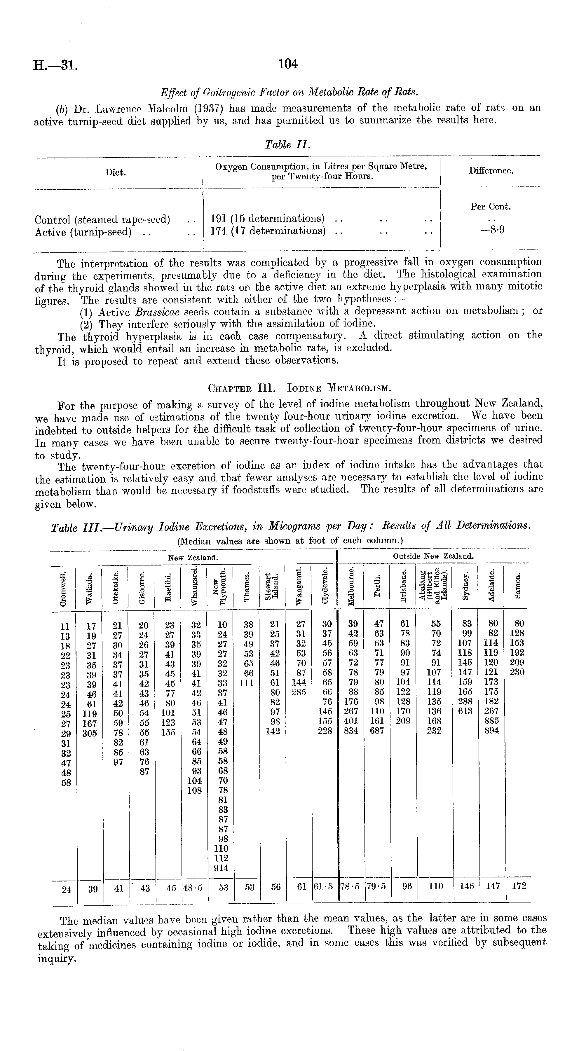 The interpretation of the results was complicated by a progressive fall in oxygen consumption during the experiments, presumably due to a deficiency in the diet. The histological examination of the thyroid glands showed in the rats on the active diet an extreme hyperplasia with many mitotic figures. The results are consistent with either of the two hypotheses : — (1) Active Brassicae seeds contain a substance with a depressant action on metabolism ; or (2) They interfere seriously with the assimilation of iodine. The thyroid hyperplasia is in each case compensatory. A direct stimulating action on the thyroid, which would entail an increase in metabolic rate, is excluded. It is proposed to repeat and extend these observations. Chapter lll.—lodine Metabolism. For the purpose of making a survey of the level of iodine metabolism throughout New Zealand, we have made use of estimations of the twenty-four-hour urinary iodine excretion. We have been indebted to outside helpers for the difficult task of collection of twenty-four-hour specimens of urine. In many cases we have been unable to secure twenty-four-hour specimens from districts we desired to study. The twenty-four-hour excretion of iodine as an index of iodine intake has the advantages that the estimation is relatively easy and that fewer analyses are necessary to establish the level of iodine metabolism than would be necessary if foodstuffs were studied. The results of all determinations are given below.