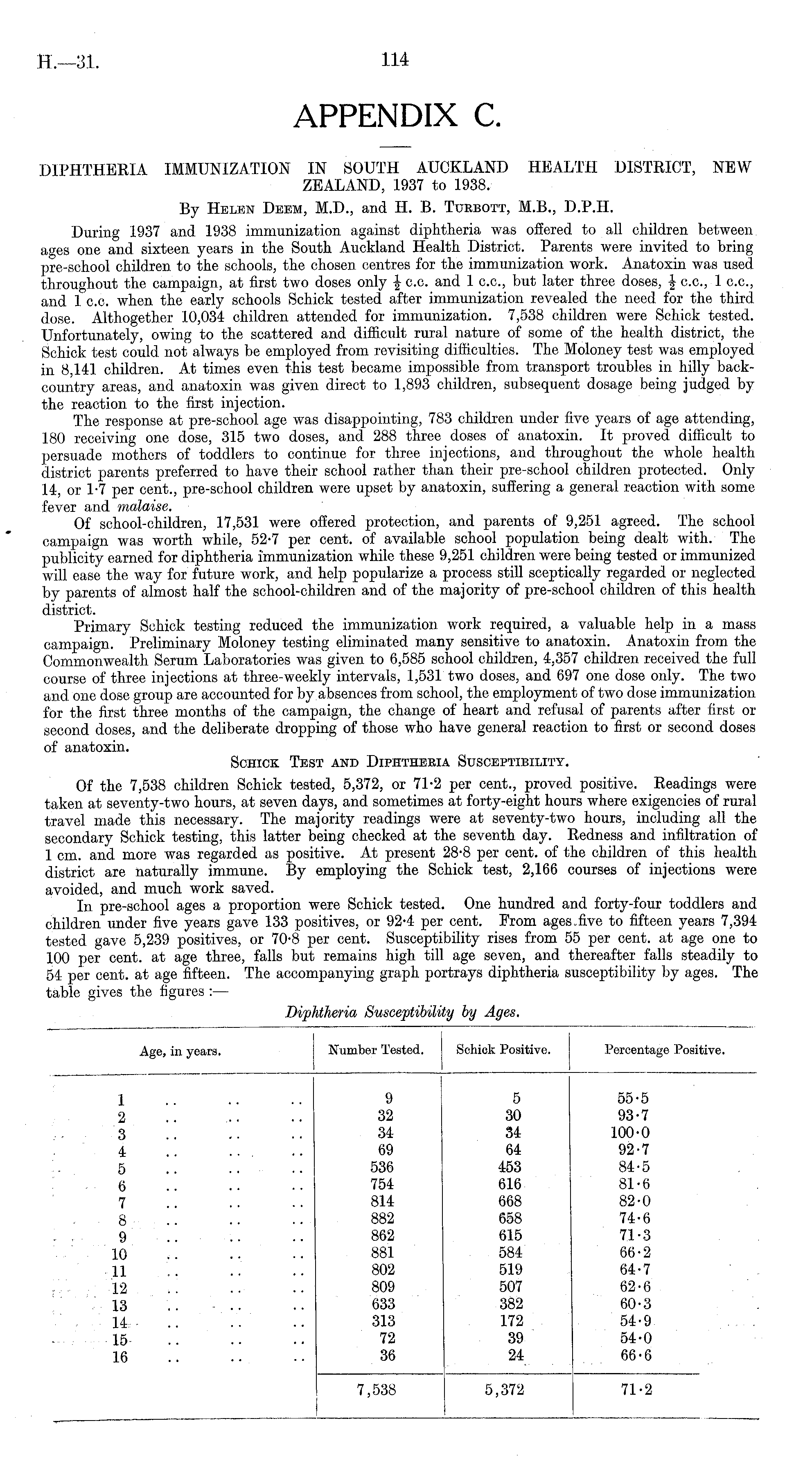 DIPHTHERIA IMMUNIZATION IN SOUTH AUCKLAND HEALTH DISTRICT, NEW ZEALAND, 1937 to 1938. By Helen Deem, M.D., and H. B. Turbott, M.8., D.P.H. During 1937 and 1938 immunization against diphtheria was offered to all children between ages one and sixteen years in the South Auckland Health District. Parents were invited to bring pre-school children to the schools, the chosen centres for the immunization work. Anatoxin was used throughout the campaign, at first two doses only c.c. and 1 c.c., but later three doses, -| c.c., 1 c.c., and 1 c.c. when the early schools Schick tested after immunization revealed the need for the third dose. Althogether 10,034 children attended for immunization. 7,538 children were Schick tested. Unfortunately, owing to the scattered and difficult rural nature of some of the health district, the Schick test could not always be employed from revisiting difficulties. The Moloney test was employed in 8,141 children. At times even this test became impossible from transport troubles in hilly backcountry areas, and anatoxin was given direct to 1,893 children, subsequent dosage being judged by the reaction to the first injection. The response at pre-school age was disappointing, 783 children under five years of age attending, 180 receiving one dose, 315 two doses, and 288 three doses of anatoxin. It proved difficult to persuade mothers of toddlers to continue for three injections, and throughout the whole health district parents preferred to have their school rather than their pre-school children protected. Only 14, or 1-7 per cent., pre-school children were upset by anatoxin, suffering a general reaction with some fever and malaise. Of school-children, 17,531 were offered protection, and parents of 9,251 agreed. The school campaign was worth while, 52-7 per cent, of available school population being dealt with. The publicity earned for diphtheria immunization while these 9,251 children were being tested or immunized will ease the way for future work, and help popularize a process still sceptically regarded or neglected by parents of almost half the school-children and of the majority of pre-school children of this health district. Primary Schick testing reduced the immunization work required, a valuable help in a mass campaign. Preliminary Moloney testing eliminated many sensitive to anatoxin. Anatoxin from the Commonwealth Serum Laboratories was given to 6,585 school children, 4,357 children received the full course of three injections at three-weekly intervals, 1,531 two doses, and 697 one dose only. The two and one dose group are accounted for by absences from school, the employment of two dose immunization for the first three months of the campaign, the change of heart and refusal of parents after first or second doses, and the deliberate dropping of those who have general reaction to first or second doses of anatoxin. Schick Test and Diphtheria Susceptibility. Of the 7,538 children Schick tested, 5,372, or 71-2 per cent., proved positive. Readings were taken at seventy-two hours, at seven days, and sometimes at forty-eight hours where exigencies of rural travel made this necessary. The majority readings were at seventy-two hours, including all the secondary Schick testing, this latter being checked at the seventh day. Redness and infiltration of 1 cm. and more was regarded as positive. At present 28-8 per cent, of the children of this health district are naturally immune. By employing the Schick test, 2,166 courses of injections were avoided, and much work saved. In pre-school ages a proportion were Schick tested. One hundred and forty-four toddlers and children under five years gave 133 positives, or 92-4 per cent. From ages.five to fifteen years 7,394 tested gave 5,239 positives, or 70-8 per cent. Susceptibility rises from 55 per cent, at age one to 100 per cent, at age three, falls but remains high till age seven, and thereafter falls steadily to 54 per cent, at age fifteen. The accompanying graph portrays diphtheria susceptibility by ages. The table gives the figures :—