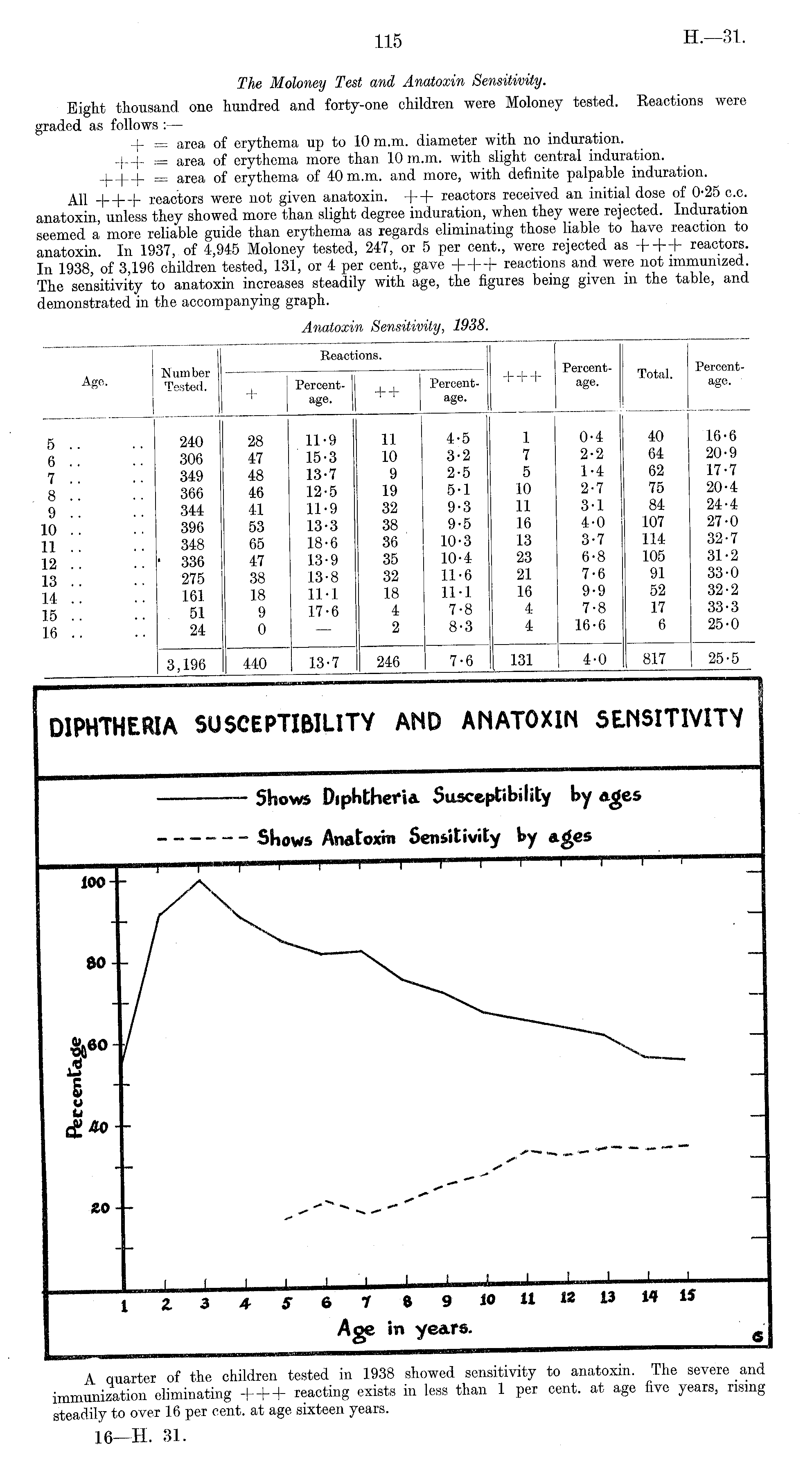 The Moloney Test and Anatoxin Sensitivity. Eight thousand one hundred and forty-one children were Moloney tested. Reactions were graded as follows : — -f = area of erythema up to 10 m.m. diameter with no induration. _ area of erythema more than 10 m.m. with slight central induration. — area of erythema of 40 m.m. and more, with definite palpable induration. All ++ + reactors were not given anatoxin. + -f- reactors received an initial dose of 0-25 c.c. anatoxin, unless they showed more than slight degree induration, when they were rejected. Induration seemed a more reliable guide than erythema as regards eliminating those liable to have reaction to anatoxin. In 1937, of 4,945 Moloney tested, 247, or 5 per cent., were rejected as +++ reactors. In 1938, of 3,196 children tested, 131, or 4 per cent., gave ++ + reactions and were not immunized. The sensitivity to anatoxin increases steadily with age, the figures being given in the table, and demonstrated in the accompanying graph.