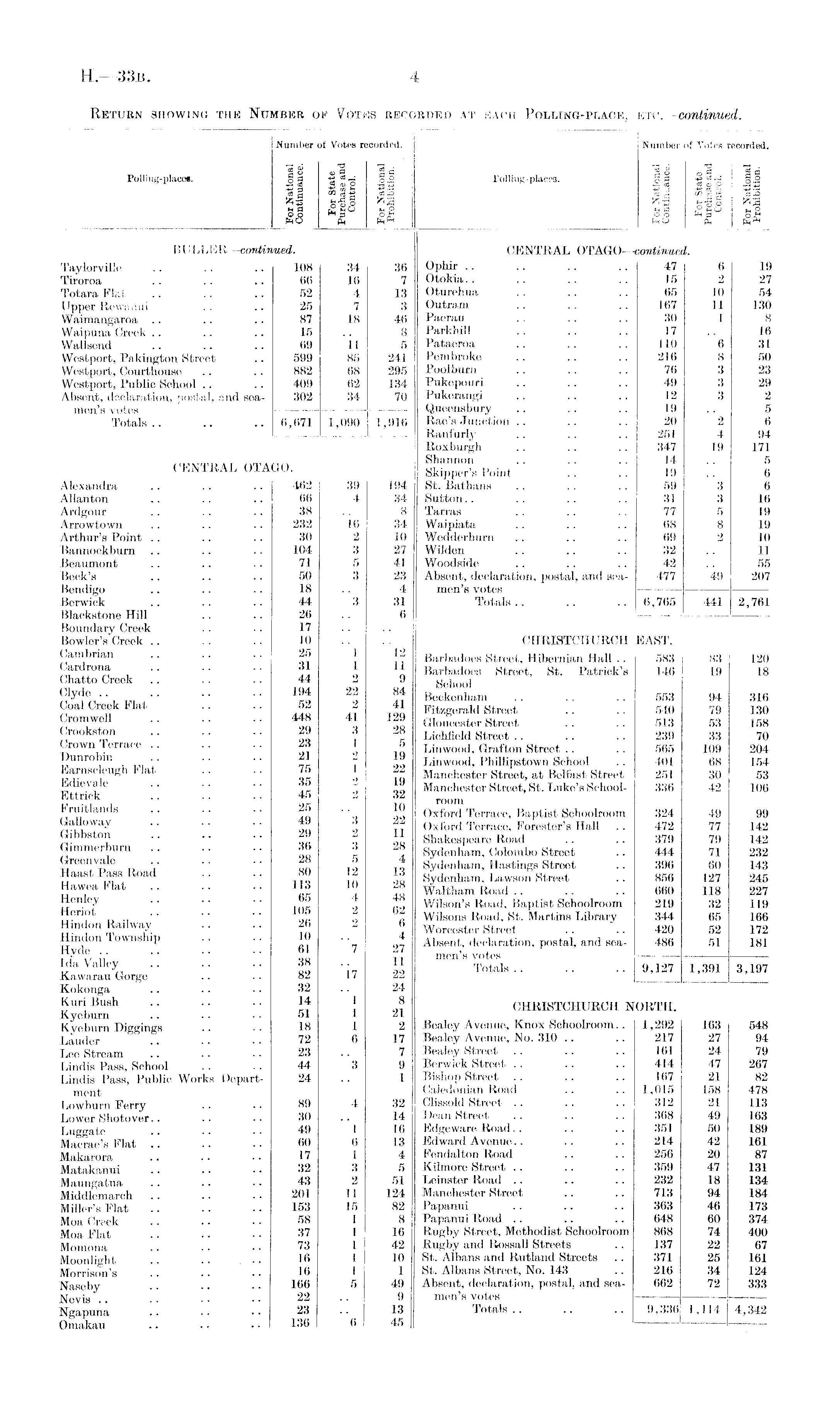 Number of Votes recorded. "3 g 'p "Sq Polling-place#. J sa 50 « a 00 «"S .5-° fcs g-g g *b s§ tg|<S gs feO PH I*H BULLER—continued. Taylorville .. .. .. 108 34 36 Tiroroa .. .. .. 66 16 7 Totara Flat .. .. .. 52 4 13 Upper Rewanui .. .. 25 7 3 Waimangaroa .. .. .. 87 18 46 Waipuna Creek .. .. .. 15 .. 8 Wallsend .. .. .. 69 11 5 Westport, Pakington Street .. 599 85 241 Westport, Courthouse .. .. 882 68 295 Westport, Public School .. .. 409 62 134 Absent, declaration, postal, and sea- 302 34 70 men's votes — Totals.. .. .. 6,671 1,090 1,916 CENTRAL OTAGO. Alexandra .. .. .. 462 39 194 Allanton .. .. .. 66 4 34 Ardgour .. .. .. 38 . . 8 Arrowtown .. .. .. 232 16 34 Arthur's Point .. .. .. 30 2 10 Bannockburn .. .. .. 104 3 27 Beaumont .. .. .. 71 5 41 Beck's .. .. .. 50 3 23 Bendigo .. .. .. 18 .. 4 Berwick .. . . .. 44 3 31 Blackstone Hill .. .. 26 . . 6 Boundary Creek .. .. 17 Bowler's Creek .. .. .. 10 Cambrian .. .. .. 25 1 12 Cardrona .. .. .. 31 1 11 Chatto Creek .. . . .. 44 2 9 Clyde .. .. .. •• 194 22 84 Coal Creek Flat .. .. 52 2 41 Cromwell .. .. .. 448 41 129 Crookston .. . . .. 29 3 28 Crown Terrace .. .. .. 23 I 5 Dunrobin .. .. .. 21 2 19 Earnscleugh Flat .. .. 75 I 22 Edievale .. .. .. 35 2 19 Ettrick .. .. .. 45 2 32 Fruitlands .. .. . • 25 .. 10 Galloway .. .. .. 49 3 22 Gibbston .. .. .. 29 2 11 Gimmerburn .. .. .. 36 3 28 Greenvale .. .. . • 28 5 4 Haast Pass Road .. .. 80 12 13 Hawea Flat .. .. .. 113 10 28 Henley .. .. • • 65 4 48 Heriot .. .. .. 105 2 62 Hindon Railway .. .. 26 2 6 Hindon Township . . .. 10 .. 4 Hyde .. .. .. .. 61 7 27 Ida Valley .. .. •• 38 .. 11 Kawarau Gorge .. . • 82 17 22 Kokonga .. .. .. 32 .. 24 Kuri Bush .. .. .. 14 I 8 Kyeburn .. .. • • 51 1 21 Kyeburn Diggings .. .. 18 1 2 Lauder .. .. • • 72 6 17 Lee Stream .. .. .. 23 .. 7 Lindis Pass, School . . .. 44 3 9 Lindis Pass, Public Works Depart- 24 1 ment Lowburn Ferry .. . • 89 4 32 Lower Shotover.. .. .. 30 .. 14 Luggate .. .. . • 49 1 16 Macrae's Flat .. .. .. 60 6 13 Makarora .. .. •. 17 1 4 Matakanui .. .. .. 32 3 5 Maungatua .. .. • • 43 2 51 Middlemarch . . .. .. 201 11 124 Miller's Flat .. .. • • 153 15 82 Moa Creek .. .. • • 58 1 8 Moa Flat .. .. .. 37 1 16 Momona .. .. • • 73 1 42 Moonlight .. .. . • • 16 1 10 Morrison's .. .. • • 16 Naseby .. .. • • 166 5 49 Nevis .. .. • • • • 22 .. 9 Ngapuna .. .. • • 23 .. 13 Omakau .. .. . • 136 6 45