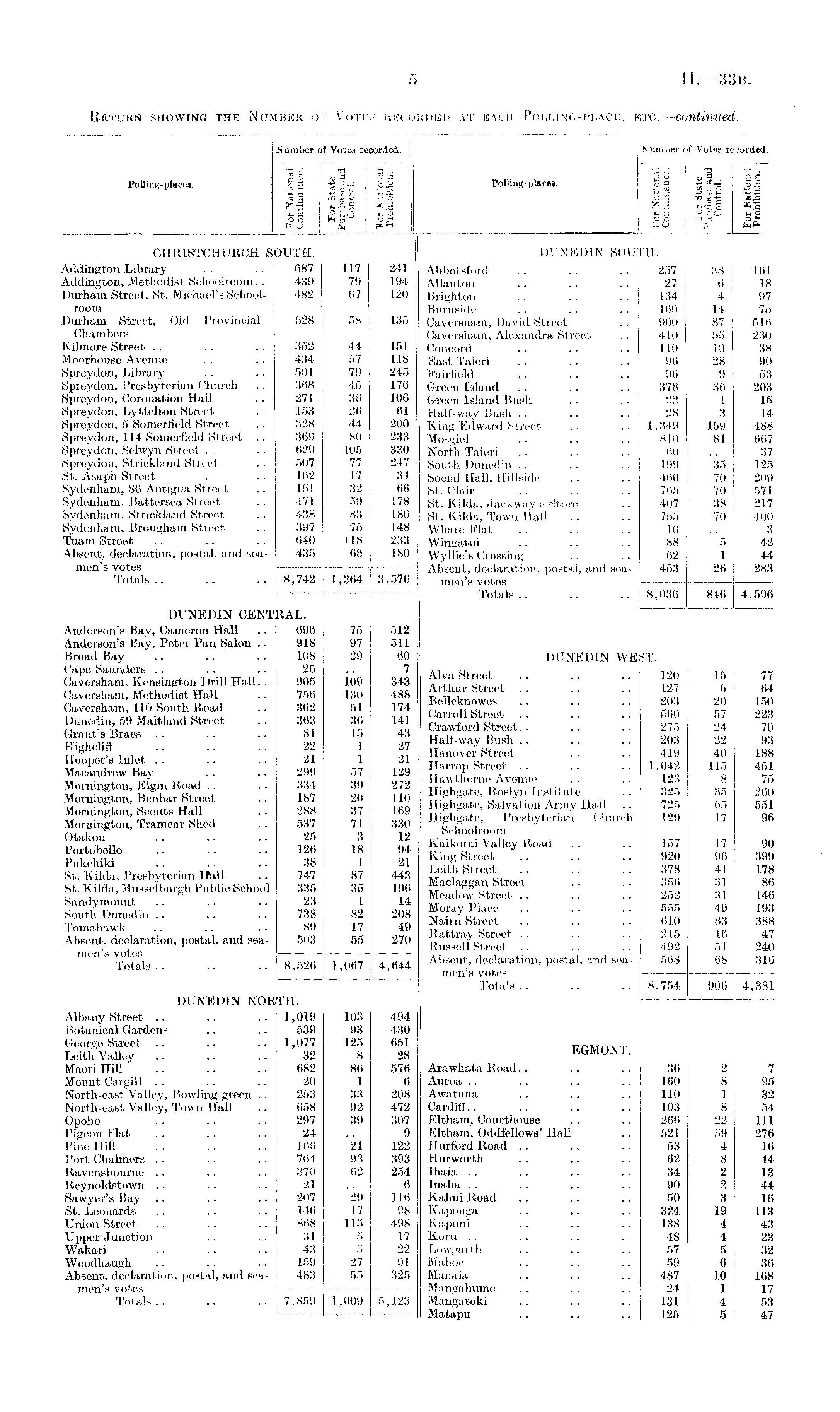 Number of Votes recorded. as <u *2 "3 ,J rj O O I Cl Polling-placer o g "3 S "3 I ° S 2 § s s s fcj S"Sq *- a gg iSa 5 o s CHRISTCHURCH SOUTH. Addington Library .. .. 687 117 241 Addington, Methodist Schoolroom.. 439 79 194 Durham Street, St. Michael's School- 482 67 120 room Durham Street, Old Provincial 528 58 135 Chambers Kilmore Street .. .. .. 352 44 151 Moorhouse Avenue .. .. 434 57 118 Spreydon, Library . . .. 501 79 245 Spreydon, Presbyterian Church .. 368 45 176 Spreydon, Coronation Hall .. 271 36 106 Spreydon, Lyttelton Street .. 153 26 61 Spreydon, 5 Somerfield Street .. 328 44 200 Spreydon, 114 Somerfield Street .. 369 80 233 Spreydon, Selwyn Street .. .. 629 105 330 Spreydon, Strickland Street .. 507 77 247 St. Asaph Street .. .. 162 17 34 Sydenham, 86 Antigua Street .. 151 32 66 Sydenham, Battersea Street .. 471 59 178 Sydenham, Strickland Street .. 438 83 180 Sydenham, Brougham Street .. 397 75 148 Tuam Street .. .. .. 640 118 233 Absent, declaration, postal, and sea- 435 66 180 men's votes -——— Totals.. .. .. 8,742 1,364 3,576 DUNEDIN CENTRAL. Anderson's Bay, Cameron Hall .. 696 75 512 Anderson's Bay, Peter Pan Salon .. 918 97 511 Broad Bay .. .. .. 108 29 60 Cape Saunders .. .. .. 25 .. 7 Caversham, Kensington Drill Hall.. 905 109 343 Caversham, Methodist Hall .. 756 130 488 Caversham, 110 South Road .. 362 51 174 Dunedin, 59 Maitland Street .. 363 36 141 Grant's Braes .. .. .. 81 15 43 Higholiff .. .. .. 22 1 27 Hooper's Inlet .. .. .. 21 1 21 Macandrew Bay .. ... 299 57 129 Mornington, Elgin Road .. .. 334 39 272 Mornington, Benhar Street .. 187 20 110 Mornington, Scouts Hall .. 288 37 169 Mornington, Tramcar Shed .. 537 71 330 Otakou .. .. .. 25 3 12 Portobello .. .. .. 126 18 94 Pukehiki .. .. .. 38 1 21 St. Kilda, Presbyterian Hall .. 747 87 443 St. Kilda, Musselburgh Public School 335 35 196 Sandymount .. .. .. 23 1 14 South Dunedin .. .. .. 738 82 208 Tomahawk .. .. .. 89 17 49 Absent, declaration, postal, and sea- 503 55 270 men's votes Totals.. .. .. 8,526 1,067 4,644 DUNEDIN NORTH. Albany Street .. .. .. 1,019 103 494 Botanical Gardens .. .. 539 93 430 George Street .. .. .. 1,077 125 651 Leith Valley .. .. .. 32 8 28 Maori Hill .. .. .. 682 86 576 Mount Cargill .. .. .. 20 1 6 North-east Valley, Bowling-green .. 253 33 208 North-east Valley, Town Hall .. 658 92 472 Opoho .. .. .. 297 39 307 Pigeon Flat .. .. .. 24 .. 9 Pine Hill .. .. .. 166 21 122 Port Chalmers .. .. .. 764 93 393 Ravensbourne .. .. .. 370 62 254 Reynoldstown .. .. .. 21 .. 6 Sawyer's Bay .. .. .. 207 29 116 St. Leonards .. .. .. 146 17 98 Union Street .. .. .. 868 115 498 Upper Junction .. .. 31 5 17 Wakari .. .. .. 43 5 22 Woodhaugh .. .. .. 159 27 91 Absent, declaration, postal, and sea- 483 55 325 men's votes —— Totals.. .. .. 7,859 1,009 5,123