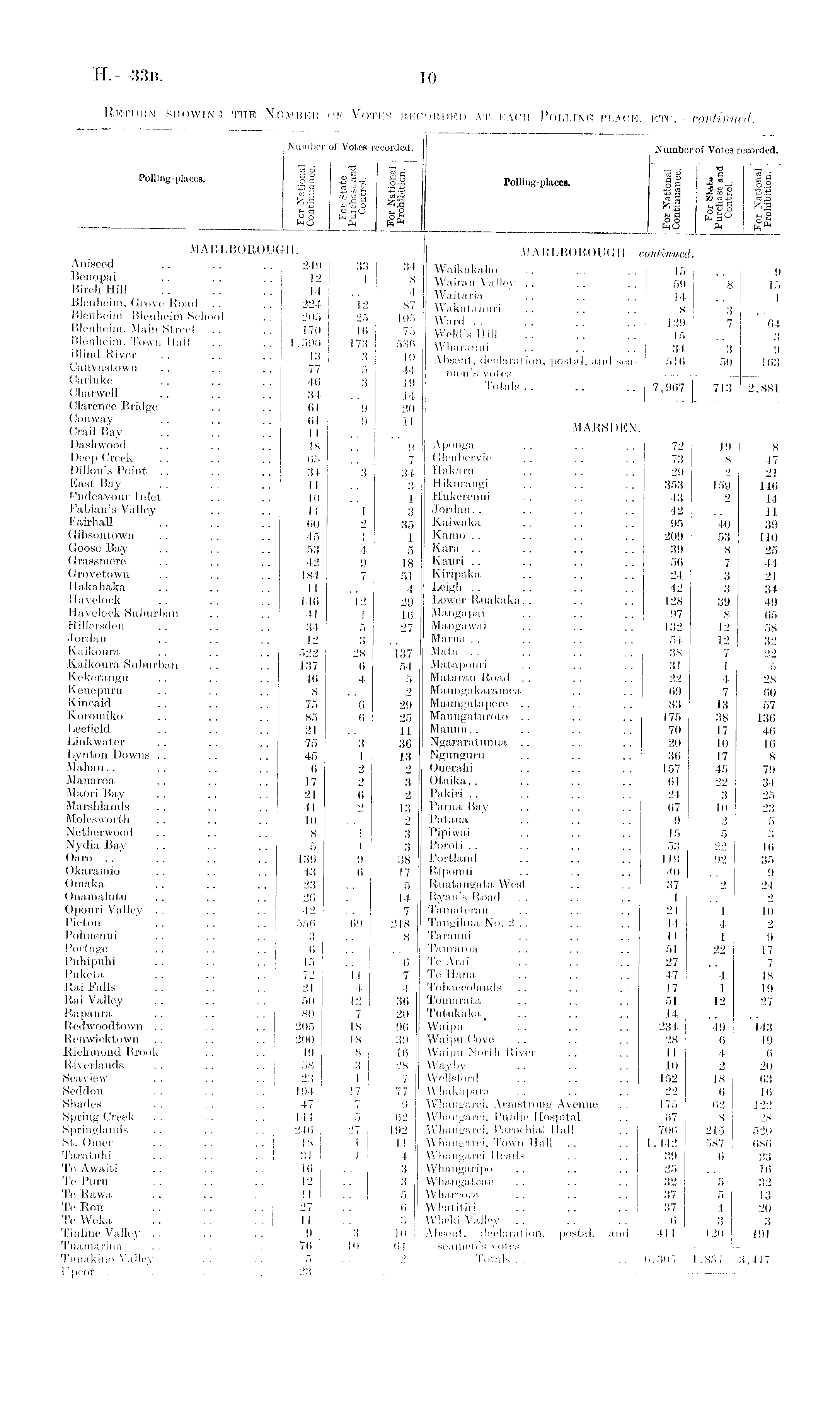 Number of Votes recorded. Polling-places. la <g rf-; go sg ssf Si Sf<3 mo o g Eh 3 Si* hS ft, ft MARLBOROUGH. Aniseed .. .. .. 249 33 34 Benopai .. .. .. 12 1 8 Birch Hil] .. .. .. 14 .. 4 Blenheim, Grove Road .. .. 224 12 87 Blenheim, Blenheim School .. 205 25 105 Blenheim, Main Street .. .. 170 16 75 Blenheim, Town Hall .. .. 1,590 173 586 Blind River .. .. .. 13 3 10 Oanvastown .. .. .. 77 5 44 Carluke .. .. .. 46 3 19 Oharwell .. .. .. 34 .. 14 Clarence Bridge .. .. 61 9 20 Conway .. .. .. 61 9 11 Crail Bay .. .. .. 11 Dashwood .. .. .. 48 ,. 9 Deep Creek .. .. .. 65 .. 7 Dillon's Point .. .. .. 34 3 34 East Bay .. .. .. 11 ., 3 Endeavour Inlet .. .. 10 .. 1 Fabian's Valley .. .. 11 1 3 Fairhall .. .. .. 60 2 35 Gibsontown .. .. .. 45 1 1 Goose Bay .. .. ., 53 4 5 Grassmere .. .. .. 42 9 18 Grovetown .. .. .. 184 7 51 Hakahaka .. .. .. 11 .. 4 Havelock .. • .. 146 12 29 Haveloek Suburban .. .. 41 1 16 Hillersden .. .. .. 34 5 27 Jordan .. ,. .. 12 3 Kaikoura .. .. .. 522 28 137 Kaikoura Suburban .. .. 137 6 54 Kekerangu .. .. .. 46 4 5 Kenepuru .. .. .. 8 .. 2 Kincaid .. .. .. 75 6 29 Koromiko .. .. .. 85 6 25 Leefield .. .. .. 21 .. 11 Linkwater .. .. .. 75 3 36 Lynton Downs .. .. .. 45 1 13 Mahau.. .. .. .. 6 2 2 Manaroa .. .. .. 17 2 3 Maori Bay .. .. .. 21 6 2 Marshlands .. .. .. 41 2 13 Molesworth .. .. .. 10 .. 2 Netherwood .. .. .. 8 1 3 Nydia Bay .. .. .. 5 1 3 Oaro .. ' .. .. . . 139 9 38 Okaramio ... ,. .. 43 6 17 Omaka .. ,. .. 23 .. 5 Onamalutu . > .. .. 26 .. 14 Opouri Valley .. .. .. 42 .. 7 Picton .. .. .. 556 69 218 Pohuenui .1, .. .. 3 .. 8 Portage .. . . .. 6 Puhipuhi .. .. . . 15 .. 6 Puketa .. .. .. 72 11 7 Rai Falls .. .. .. 21 4 4 Rai Valley .. .. . . 50 12 36 Rapaura .. . . .. 80 7 20 Redwoodtown .. .. .. 205 18 96 Renwicktown . . .. . . 200 18 39 Richmond Brook .. . . 49 8 16 Riverlands .. .. .. 58 3 28 Seaview .. .. .. 23 1 7 Seddon .. .. .. 194 17 77 Shades . . .. .. 47 7 9 Spring Creek .. . . . . 144 5 62 Springlands .. .. .. 246 27 192 St. Omer .. .. .. 18 1 11 Taratuhi .. .. . . 31 1 4 Te Awaiti .. .. .. 16 .. .3 Te Puru .. .. .. 12 .. 3 Te Rawa .. .. .. 11 .. 5 Te Rou .. .. . . 27 . . 6 Te Weka .. . . . . 11 .. 3 Tinline Valley .. .. .. 9 3 10 Tuamarina .. . . .. 76 10 64 Tunakino Valley .. .. 5 .. 2 Upcot .. . . . . . . 23