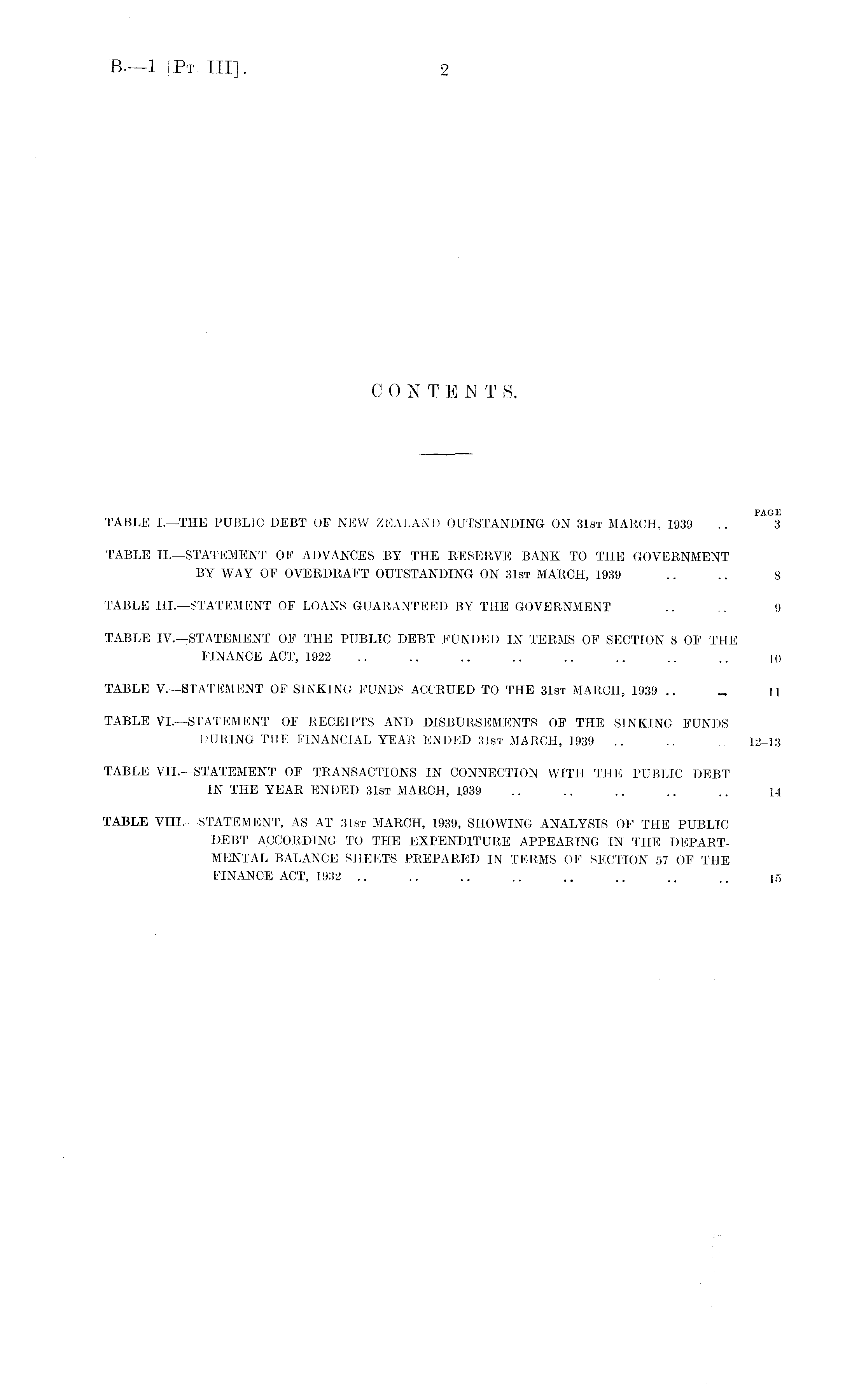 PAGE TABLE I.—THE PUBLIC DEBT OF NEW ZEALAND OUTSTANDING ON 31ST MARCH, 1939 .. 3 TABLE lI.—STATEMENT OF ADVANCES BY THE RESERVE BANK TO THE GOVERNMENT BY WAY OF OVERDRAFT OUTSTANDING ON 31ST MARCH, 1939 .. .. 8 TABLE lII.—STATEMENT OF LOANS GUARANTEED BY THE GOVERNMENT .. .. 9 TABLE IV.—STATEMENT OF THE PUBLIC DEBT FUNDED IN TERMS OF SECTION 8 OF THE FINANCE ACT, 1922 .. .. .. .. .. .. .. .. io TABLE V.—STATEMENT OF SINKING FUNDS ACCRUED TO THE 31st MARCH, 1939 .. „ n TABLE VI.—STATEMENT OF RECEIPTS AND DISBURSEMENTS OF THE SINKING FUNDS DURING THE FINANCIAL YEAR ENDED 31st MARCH, 1939 .. .. 12-13 TABLE VII.—STATEMENT OF TRANSACTIONS IN CONNECTION WITH THE PUBLIC DEBT IN THE YEAR ENDED 31ST MARCH, 1939 .. .. .. .. .. 14 TABLE VIII.—STATEMENT, AS AT 31ST MARCH, 1939, SHOWING ANALYSIS OF THE PUBLIC DEBT ACCORDING TO THE EXPENDITURE APPEARING IN THE DEPARTMENTAL BALANCE SHEETS PREPARED IN TERMS OF SECTION 57 OF THE FINANCE ACT, 1932 .. .. .. .. .. .. .. .. 15