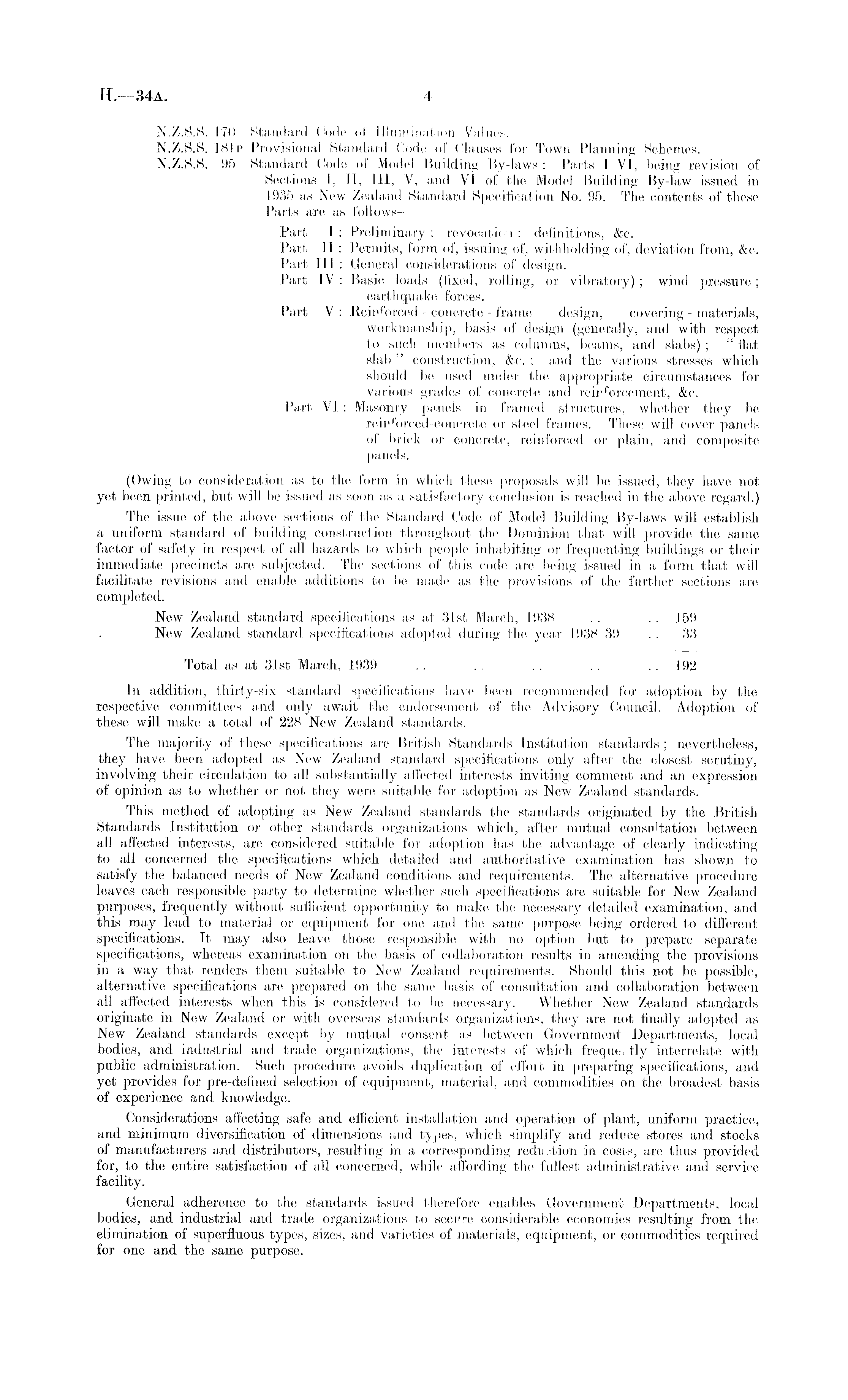 N.Z.S.S. 170 Standard Code of Illumination Values. N.Z.S.S. 181p Provisional Standard Code of Clauses for Town Planning Schemes. N.Z.S.S. 95 Standard Code of Model Building By-laws : Parts I-VI, being revision of Sections I, 11, 111, V, and VI of the Model Building By-law issued in 1935 as New Zealand Standard Specification No. 95. The contents of these Parts are as follows— Part I : Preliminary ; revocation ; definitions, &c. Part II: Permits, form of, issuing of, withholding of, deviation from, &c. Part III: General considerations of design. Part IV: Basic loads (fixed, rolling, or vibratory); wind pressure; earthquake forces. Part V : Reinforced - concrete - frame design, covering - materials, workmanship, basis of design (generally, and with respect to such members as columns, beams, and slabs); " flat slab " construction, &c.; and the various stresses which should be used under the appropriate circumstances for various grades of concrete and reinforcement, &c. Part VI : Masonry panels in framed structures, whether they be reir f orced-concrete or steel frames. These will cover panels of brick or concrete, reinforced or plain, and composite panels. (Owing to consideration as to the form in which these proposals will be issued, they have not yet been printed, but will be issued as soon as a satisfactory conclusion is reached in the above regard.) The issue of the above sections of the Standard Code of Model Building By-laws will establish a uniform standard of building construction throughout the Dominion that will provide the same factor of safety in respect of all hazards to which people inhabiting or frequenting buildings or their immediate precincts are subjected. The sections of this code are being issued in a form that will facilitate revisions and enable additions to be made as the provisions of the further sections are completed. New Zealand standard specifications as at 31st March, 1938 .. .. 159 New Zealand standard specifications adopted during the year 1938-39 .. 33 Total as at 31st March, 1939 .. .. .. .. .. 192 In addition, thirty-six standard specifications have been recommended for adoption by the respective committees and only await the endorsement of the Advisory Council. Adoption of these will make a total of 228 New Zealand standards. The majority of these specifications are British Standards Institution standards ; nevertheless, they have been adopted as New Zealand standard specifications only after the closest scrutiny, involving their circulation to all substantially affected interests inviting comment and an expression of opinion as to whether or not they were suitable for adoption as New Zealand standards. This method of adopting as New Zealand standards the standards originated by the British Standards Institution or other standards organizations which, after mutual consultation between all affected interests, are considered suitable for adoption has the advantage of clearly indicating to all concerned the specifications which detailed and authoritative examination has shown to satisfy the balanced needs of New Zealand conditions and requirements. The alternative procedure leaves each responsible party to determine whether such specifications are suitable for New Zealand purposes, frequently without sufficient opportunity to make the necessary detailed examination, and this may lead to material or equipment for one and the same purpose being ordered to different specifications. It may also leave those responsible with no option but to prepare separate specifications, whereas examination on the basis of collaboration residts in amending the provisions in a way that renders them suitable to New Zealand requirements. Should this not be possible, alternative specifications are prepared on the same basis of consultation and collaboration between all affected interests when this is considered to be necessary. Whether New Zealand standards originate in New Zealand or with overseas standards organizations, they are not finally adopted as New Zealand standards except by mutual consent as between Government Departments, local bodies, and industrial and trade organisations, the interests of which frequently interrelate with public administration. Such procedure avoids duplication of effoifc in preparing specifications, and yet provides for pre-defined selection of equipment, material, and commodities on the broadest basis of experience and knowledge. Considerations affecting safe and efficient installation and operation of plant, uniform practice, and minimum diversification of dimensions and tj pes, which simplify and reduce stores and stocks of manufacturers and distributors, resulting in a corresponding reduction in costs, are thus provided for, to the entire satisfaction of all concerned, while affording the fullest administrative and service facility. General adherence to the standards issued therefore enables Government Departments, local bodies, and industrial and trade organizations to secure considerable economies resulting from the elimination of superfluous types, sizes, and varieties of materials, equipment, or commodities required for one and the same purpose.