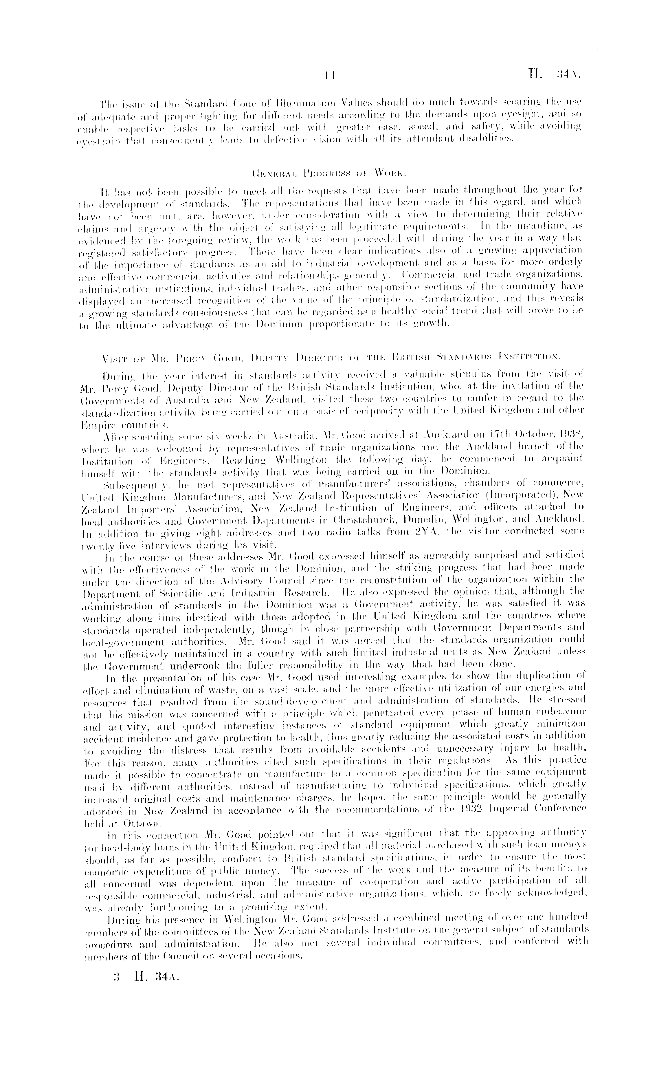 The issue of the Standard Code of Illumination Values should do much towards securing the use of adequate and proper lighting for different needs according to the demands upon eyesight, and so enable respective tasks to be carried out with greater ease, speed, and safety, while avoiding eyestrain that consequently leads to defective vision with all its attendant disabilities. General Progress op Work. It has not been possible to meet all the requests that have been made throughout the year for the development, of standards. The representations that have been made in this regard, and which have not been met, are, however, under consideration with a view to determining their relative claims and urgency with the object of satisfying all legitimate requirements. In the meantime, as evidenced by the foregoing review, the work has been proceeded with during the year in a way that registered satisfactory progress. There have been clear indications also of a growing appreciation of the importance of standards as an aid to industrial development and as a basis for more orderly and effective commercial activities and relationships generally. Commercial and trade organizations, administrative institutions, individual traders, and other responsible sections of the community have displayed an increased recognition of the value of the principle of standardization, and this reveals a growing standards consciousness that can be regarded as a healthy social trend that will prove to be to the ultimate advantage of the Dominion proportionate to its growth. Visit op Mr. Percy Good, Deputy Director op the British Standards Institution. During the year interest in standards activity received a valuable stimulus from the visit of Mr. Percy Good, Deputy Director of the British Standards Institution, who, at the invitation of the Governments of Australia and New Zealand, visited these two countries to confer in regard to the standardization activity being carried out on a basis of reciprocity with the United Kingdom and other Empire countries. After spending some six weeks in Australia, Mr. Good arrived at Auckland on 17th October, 1938, where he was welcomed by representatives of trade organizations and the Auckland branch of the Institution of Engineers. Reaching Wellington the following day, he commenced to acquaint himself with the standards activity that was being carried on in the Dominion. Subsequently, he met representatives of manufacturers' associations, chambers of commerce, United Kingdom Manufacturers, and New Zealand Representatives' Association (Incorporated), New Zealand Importers' Association, New Zealand Institution of Engineers, and officers attached to local authorities and Government Departments in Christchurch, Dunedin, Wellington, and Auckland. In addition to giving eight addresses and two radio talks from 2YA, the visitor conducted some twenty-five interviews during his visit. In the course of these addresses Mr. Good expressed himself as agreeably surprised and satisfied with the effectiveness of the work in the Dominion, and the striking progress that had been made under the direction of the Advisory Council since the reconstitution of the organization within the Department of Scientific and Industrial Research. He also expressed the opinion that, although the administration of standards in the Dominion was a Government activity, he was satisfied it was working along lines identical with those adopted in the United Kingdom and the countries where standards operated independently, though in close partnership with. Government Departments and local-government authorities. Mr. Good said it was agreed that the standards organization could not be effectively maintained in a country with such limited industrial units as New Zealand unless the Government undertook the fuller responsibility in the way that, had been done. In the presentation of his case Mr. Good used interesting examples to show the duplication of effort and elimination of waste, on a vast scale, and the more effective utilization of our energies and resources that resulted from the sound development and administration of standards. He stressed that his mission was concerned with a principle which penetrated every phase of human endeavour and activity, and quoted interesting instances of standard equipment which greatly minimized accident incidence and gave protection to health, thus greatly reducing the associated costs in addition to avoiding the distress that results from avoidable accidents and unnecessary injury to health. For this reason, many authorities cited such specifications in their regulations. As this practice made it possible to concentrate on manufacture to a common specification for the same equipment used by different authorities, instead of manufacturing to individual specifications, which greatly increased original costs and maintenance charges, he hoped the same principle would be generally adopted in New Zealand in accordance with the recommendations of the 1932 Imperial Conference held at Ottawa. ... ... In this connection Mr. Good pointed out that it was significant that the approving authority for local-body loans in the United Kingdom required that all material purchased with such loan-moneys should, as far as possible, conform to British standard specifications, in order to ensure the most economic expenditure of public money. The success of the work and the measure of its benefits to all concerned was dependent upon the measure of co-operation and active participation of all responsible commercial, industrial, and administrative organizations, which, he freely acknowledged, was already forthcoming to a promising extent. During his presence in Wellington Mr. Good addressed a combined meeting of over one hundred members of the committees of the New Zealand Standards Institute on the general subject of standards procedure and administration. He also met, several individual committees, and conferred with