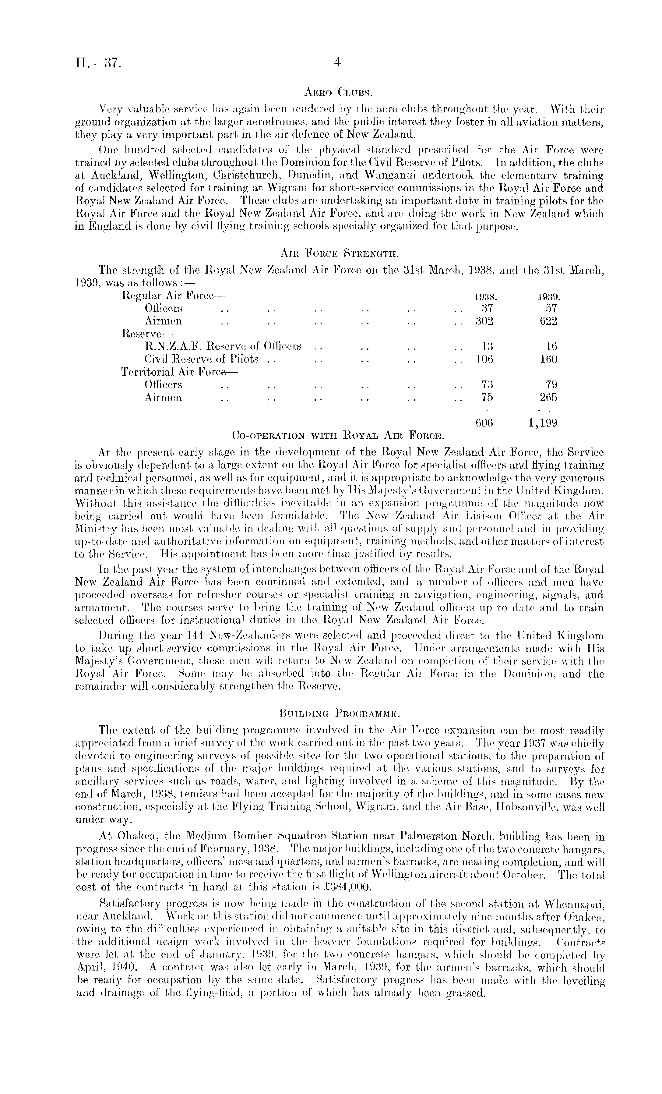 Aero Clubs. Very valuable service has again been rendered by the aero clubs throughout the year. With their ground organization at the larger aerodromes, and the public interest they foster in all aviation matters, they play a very important part in the air defence of New Zealand. One hundred selected candidates of the physical standard prescribed for the Air Force were trained by selected clubs throughout the Dominion for the Civil Reserve of Pilots. In addition, the clubs at Auckland, Wellington, Christchurch, Dunedin, and Wanganui undertook the elementary training of candidates selected for training at Wigram for short-service commissions in the Royal Air Force and Royal New Zealand Air Force. These clubs are undertaking an important duty in training pilots for the Royal Air Force and the Royal New Zealand Air Force, and are doing the work in New Zealand which in England is done by civil flying training schools specially organized for that purpose. Air Force Strength. The strength of the Royal New Zealand Air Force on the 31st March, 1938, and the 31st March, 1939, was as follows : — Regular Air Force— 1938. 1939. Officers .. .. .. .. .. 37 57 Airmen .. .. .. .. .. .. 302 622 Reserve — R.N.Z.A.F. Reserve of Officers .. .. .. 13 16 Civil Reserve of Pilots .. .. .. .. .. 106 160 Territorial Air ForceOfficers .. ... .. .. .. ..73 79 Airmen .. .. .. .. .. 75 265 606 1,199 Co-operation with Royal Air Force. At the present early stage in the development of the Royal New Zealand Air Force, the Service is obviously dependent to a large extent on the Royal Air Force for specialist officers and flying training and technical personnel, as well as for equipment, and it is appropriate to acknowledge the very generous manner in which these requirements have been met by His Majesty's Government in the United Kingdom. Without this assistance the difficulties inevitable in an expansion programme of the magnitude now being carried out would have been formidable. The New Zealand Air Liaison Officer at the Air Ministry has been most valuable in dealing with all questions of supply and personnel and in providing up-to-date and authoritative information on equipment, training methods, and other matters of interest to the Service. His appointment has been more than justified by results. In the past year the system of interchanges between officers of the Royal Air Force and of the Royal New Zealand Air Force has been continued and extended, and a number of officers and men have proceeded overseas for refresher courses or specialist training in navigation, engineering, signals, and armament. The courses serve to bring the training of New Zealand officers up to date and to train selected officers for instructional duties in the Royal New Zealand Air Force. During the year 144 New-Zealanders were selected and proceeded direct to the United Kingdom to take up short-service commissions in the Royal Air Force. Under arrangements made with His Majesty's Government, these men will return to New Zealand on completion of their service with the Royal Air Force. Some may be absorbed into the Regular Air Force in the Dominion, and the remainder will considerably strengthen the Reserve. Building Programme. The extent of the building programme involved in the Air Force expansion can be most readily appreciated from a brief survey of the work carried out in the past two years. The year 1937 was chiefly devoted to engineering surveys of possible sites for the two operational stations, to the preparation of plans and specifications of the major buildings required at the various stations, and to surveys for ancillary services such as roads, water, and lighting involved in a scheme of this magnitude. By the end of March, 1938, tenders had been accepted for the majority of the buildings, and in some cases new construction, especially at the Flying Training School, Wigram, and the Air Base, Hobsonville, was well under way. At Ohakea, the Medium Bomber Squadron Station near Palmerston North, building has been in progress since the end of February, 1938. The major buildings, including one of the two concrete hangars, station headquarters, officers' mess and quarters, and airmen's barracks, are nearing completion, and will be ready for occupation in time to receive the first flight of Wellington aircraft about October. The total cost of the contracts in hand at this station is £384,000. Satisfactory progress is now being made in the construction of the second station at Whenuapai, near Auckland. Work on this station did not commence until approximately nine months after Ohakea, owing to the difficulties experienced in obtaining a suitable site in this district and, subsequently, to the additional design work involved in the heavier foundations required for buildings. Contracts let at the end of January, 1939, for the two concrete hangars, which should be completed by April> 1940. A contract was also let early in March, 1939, for the airmen's barracks, which should be ready for occupation by the same date. Satisfactory progress has been made with the levelling and drainage of the flying-field, a portion of which has already been grassed.