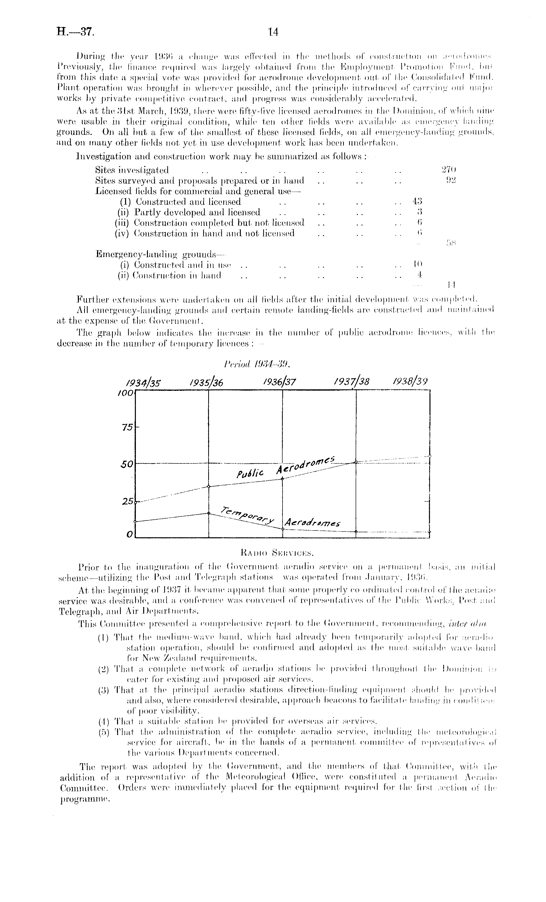 During the year 1936 a change was effected in the methods of construction on aerodromes. Previously, the finance required was largely obtained from the Employment Promotion Fund, but from this date a special vote was provided for aerodrome development out of the Consolidated Fund. Plant operation was brought in wherever possible, and the principle introduced of carrying out major works by private competitive contract, and progress was considerably accelerated. As at the 31st March, 1939, there were fifty-five licensed aerodromes in the Dominion, of which nine were usable in their original condition, while ten other fields were available as emergency-landing grounds. On all but a few of the smallest of these licensed fields, on all emergency-landing grounds, and on many other fields not yet in use development work has been undertaken. Investigation and construction work may be summarized as follows : — Sites investigated .. .. .. .. .. .. 270 Sites surveyed and proposals prepared or in hand .. .. . . 92 Licensed fields for commercial and general use — (1) Constructed and licensed .. .. .. .. 43 (ii) Partly developed and licensed .. .. .. 3 (iii) Construction completed but not licensed .. .. .. 6 (iv) Construction in hand and not licensed .. .. .. 6 — 58 Emergency-landing grounds— (i) Constructed and in use .. .. .. .. 10 (ii) Construction in hand .. .. .. .. 4 — 14 Further extensions were undertaken on all fields after the initial development was completed. All emergency-landing grounds and certain remote landing-fields are constructed and maintained at the expense of the Government. The graph below indicates the increase in the number of public aerodrome licences, with the decrease in the number of temporary licences : —