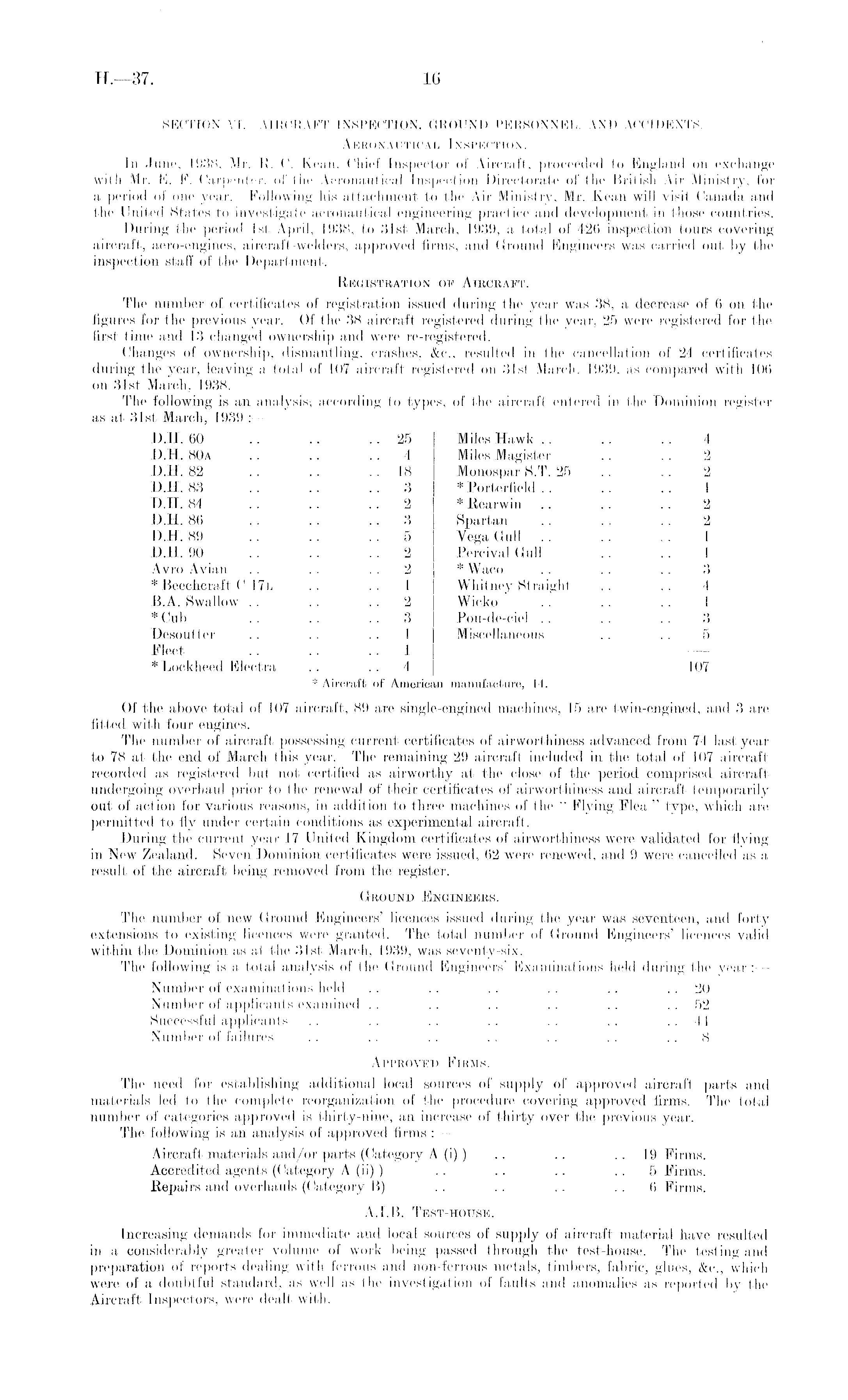 SECTION VT. —AIRCRAFT INSPECTION, GROUND PERSONNEL, AND ACCIDENTS. Aeronautical Inspection. In Juno, 1938, Mr. R. C. Kcan, Chief Inspector of Aircraft, proceeded to England on exchange with Mr. E. F. Carpenter, of the Aeronautical Inspection Directorate of the British Air Ministry, for a period of one year. Following his attachment to the Air Ministry, Mr. Kean will visit Canada and the United States to investigate aeronautical engineering practice and development in those countries. During the period Ist April, 1938, to 31st March, 1939, a total of 426 inspection tours coveringaircraft, aero-engines, aircraft-welders, approved firms, and Ground Engineers was carried out by the inspection staff of the Department. Registration op Aircraft. The number of certificates of registration issued during the year was 38, a decrease of 6 on the figures for the previous year. Of the 38 aircraft registered during the year, 25 were registered for the first time and 13 changed ownership and were re-registered. Changes of ownership, dismantling, crashes, &c., resulted in the cancellation of 24 certificates during the year, leaving a total of .107 aircraft registered on 31st March, 1939, as compared with 106 on 31st March, 1938. The following is an analysis; according to types, of the aircraft entered in the Dominion register as at 31st March, 1939 :— D.H. 60 25 Miles Hawk 4 D.H. 80a .. .. 4 Miles Magister .. .. 2 D.H. 82 .. .. 18 Monospar S.T. 25 .. .. 2 D.H. 83 .. .. 3 * Porterfield .. .. .. 1 D.H. 84 .. .. ..2 *Rearwin .. .. .. 2 D.H. 86 .. .. 3 Spartan .. .. .. 2 D.H. 89 .. .. 5 Vega Gull .. .. .. 1 D.H. 90 .. .. .. 2 Percival Gull .. .. 1 Avro Avian .. .. 2 * Waco .. .. .. 3 * Beechcraft C 17l .. .. 1 Whitney Straight .. .. 4 B.A. Swallow .. .. 2 Wicko .. .. .. 1 * Cub .. .. 3 Pou-de-ciel .. .. .. 3 Desoutter .. .. 1 Miscellaneous .. .. 5 Fleet .. .. .. 1 * Lockheed Electra . t .. 4 107 * Aircraft of American manufacture, 14. Of the above total of 107 aircraft, 89 are single-engined machines, 15 are twin-engined, and 3 are fitted with four engines. The number of aircraft possessing current certificates of airworthiness advanced from 74 last year to 78 at the end of March this year. The remaining 29 aircraft included in the total of 107 aircraft recorded as registered but not certified as airworthy at the close of the period comprised aircraft undergoing overhaul prior to the renewal of their certificates of airworthiness and aircraft temporarily out of action for various reasons, in addition to three machines of the " Flying Flea " type, which are permitted to fly under certain conditions as experimental aircraft. During the current year 17 United Kingdom certificates of airworthiness were validated for flying in New Zealand. Seven Dominion certificates were issued, 62 were renewed, and 9 were cancelled as a result of the aircraft being removed from the register. Ground Engineers. The number of new Ground Engineers' licences issued during the year was seventeen, and forty extensions to existing licences were granted. The total number of Ground Engineers' licences valid within the Dominion as at the 31st March, 1939, was seventy-six. The following is a total analysis of the Ground Engineers' Examinations held during the year: — Number of examinations held .. .. .. .. .. 20 Number of applicants examined . . .. .. .. .. 52 Successful applicants .. .. .. .. . . .. 44 Number of failures .. .. .. .. .. .. 8 Approved Firms. The need for establishing additional local sources of supply of approved aircraft parts and materials led to the complete reorganization of the procedure covering approved firms. The total number of categories approved is thirty-nine, an increase of thirty over the previous year. The following is an analysis of approved firms : — Aircraft materials and/or parts (Category A (i)) .. .. 19 Firms. Accredited agents (Category A (ii) ) .. .. .. 5 Firms. Repairs and overhauls (Category B) .. .. .. 6 Firms. A.LB. Test-house. Increasing demands for immediate and local sources of supply of aircraft material have resulted in a considerably greater volume of work being passed through the test-house. The testing and preparation of reports dealing with ferrous and non-ferrous metals, timbers, fabric, glues, &c., which were of a doubtful standard, as well as the investigation of faults and anomalies as reported by the Aircraft Inspectors, were dealt with,