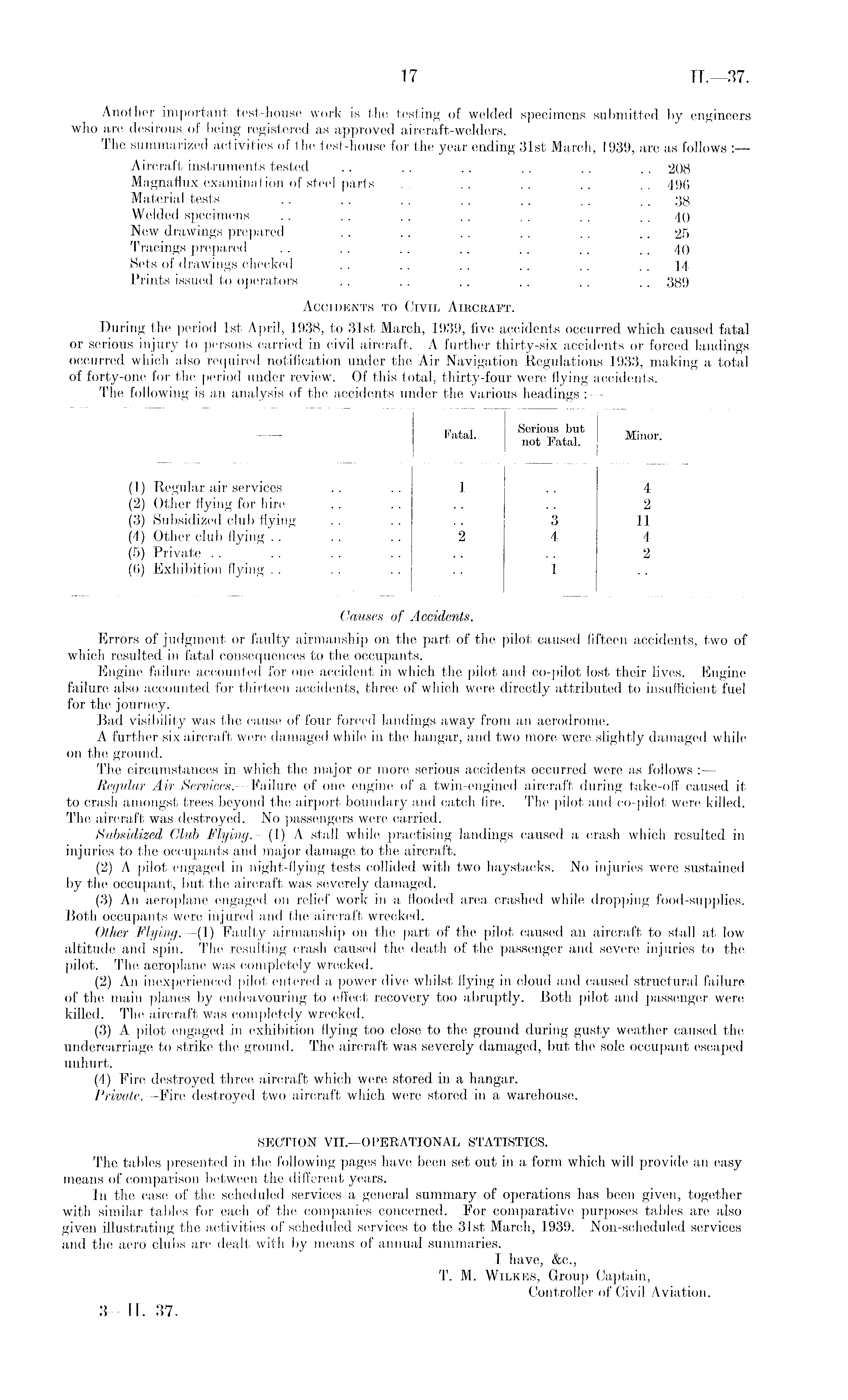 Causes of Accidents. Errors of judgment or faulty airmanship on the part of the pilot caused fifteen accidents, two of which resulted in fatal consequences to the occupants. Engine failure accounted for one accident in which the pilot and co-pilot lost their lives. Engine failure also accounted for thirteen accidents, three of which were directly attributed to insufficient fuel for the journey. Bad visibility was the cause of four forced landings away from an aerodrome. A further six aircraft were damaged while in the hangar, and two more were slightly damaged while on the ground. The circumstances in which the major or more serious accidents occurred were as follows : — Regular Air Services. —Failure of one engine of a twin-engined aircraft during take-off caused it to crash amongst trees beyond the airport boundary and catch fire. The pilot and co-pilot were killed. The aircraft was destroyed. No passengers were carried. Subsidized Club Flying.—(l) A stall while practising landings caused a crash which resulted in injuries to the occupants and major damage to the aircraft. (2) A pilot engaged in night-flying tests collided with two haystacks. No injuries were sustained by the occupant, but the aircraft was severely damaged. (3) An aeroplane engaged on relief work in a flooded area crashed while dropping food-supplies. Both occupants were injured and. the aircraft wrecked. Other Flying. —(1) Faulty airmanship on the part of the pilot caused an aircraft to stall at low altitude and spin. The resulting crash caused the death of the passenger and severe injuries to the pilot. The aeroplane was completely wrecked. (2) An inexperienced pilot entered a power dive whilst flying in cloud and caused structural failure of the main planes by endeavouring to effect recovery too abruptly. Both pilot and passenger were killed. The aircraft was completely wrecked. (3) A pilot engaged in exhibition flying too close to the ground during gusty weather caused the undercarriage to strike the ground. The aircraft was severely damaged, but the sole occupant escaped unhurt. (4) Fire destroyed three aircraft which were stored in a hangar. Private. —Fire destroyed two aircraft which were stored in a warehouse. SECTION VII.—OPERATIONAL STATISTICS. The tables presented in the following pages have been set out in a form which will provide an easy means of comparison between the different years. In the case of the scheduled services a general summary of operations has been given, together with similar tables for each of the companies concerned. For comparative purposes tables are also given illustrating the activities of scheduled services to the 31st March, 1939. Non-scheduled services and the aero clubs are dealt with by means of annual summaries. I have, &c., T. M. Wilkes, Group Captain, Controller of Civil Aviation.