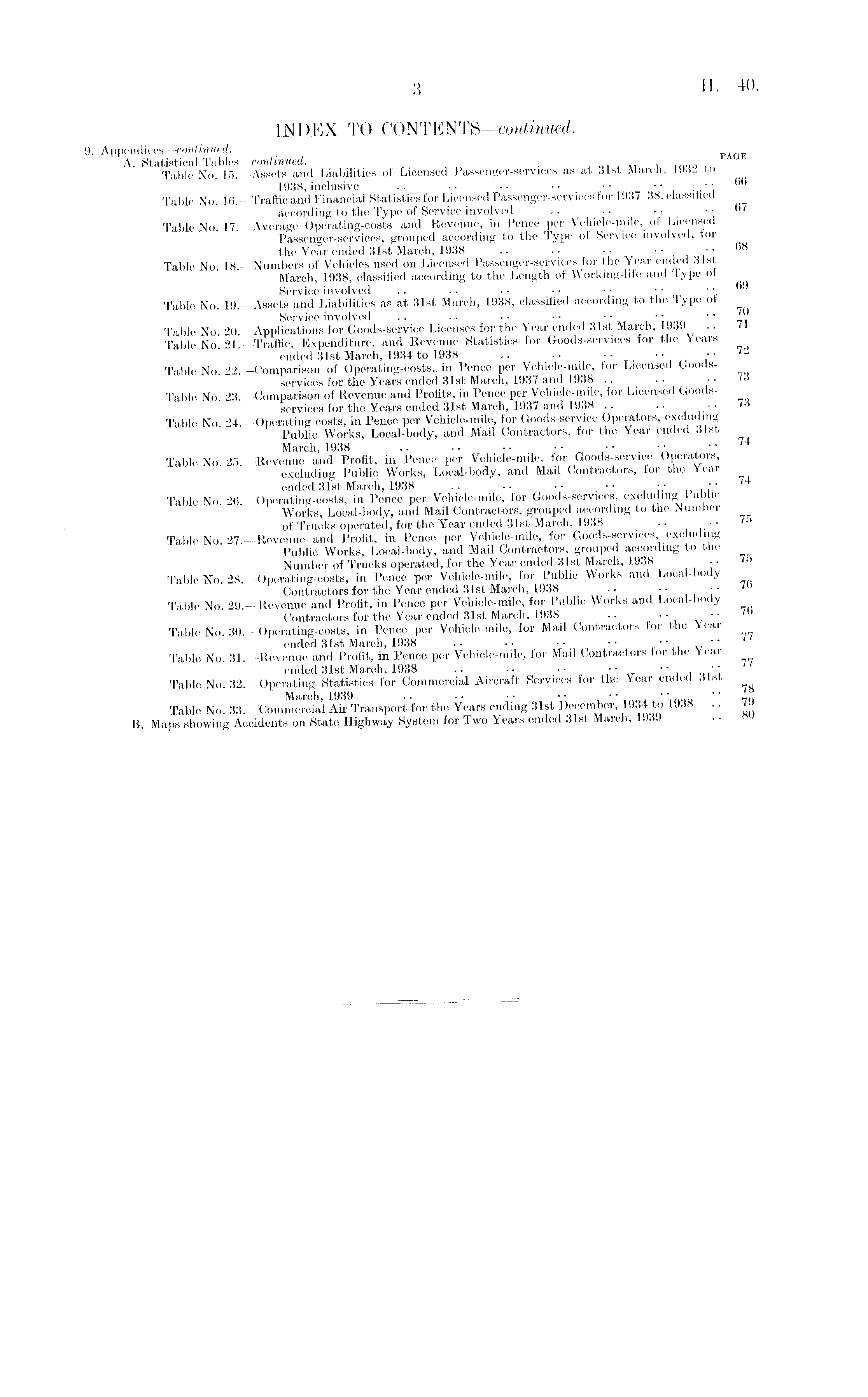 INDEX TO CONTENTS—continued. 9. Appendices —continued. A. Statistical Tables—continued. . , ~, , .„., 0 . Table No. 15.—Assets and Liabilities of Licensed Passenger-services as at 31st Maicn, I\)AZ to 1938, inclusive .. .. • • • • • • • j Table No. 16.—Traffic and Financial Statistics for Licensed Passenger-services for 1937-38, classified according to the Type of Service involved .. . • • • • • b7 Table No. 17.—Average Operating-costs and Revenue, in Pence per Vehicle-mile, of Licensed Passenger-services, grouped according to the Type of Service involved, for the Year ended 31st March, 1938 .. .. • • •• • • 68 Table No. 18. Numbers of Vehicles used on Licensed Passenger-services for the Year ended 31st March, 1938, classified according to the Length of Working-life and Type of Service involved .. .. • • • • • • '' Table No. 19. —Assets and Liabilities as at 31st March, 1938, classified according to the lype ot Service involved .. .. • • • ■ • • • • • • L ! Table No. 20. Applications for Goods-service Licenses for the Year ended 31st March, 1939 • • Table No. 21.—'Traffic, Expenditure, and Revenue Statistics for Goods-services for the Years ended 31st March, 1934 to 1938 .. •• •• •• J Table No. 22.—Comparison of Operating-costs,, in Pence per Vehicle-mile, for Licensed Goodsservices for the Years ended 31st March, 1937 and 1938 .. . • • • ' Table No. 23.—Comparison of Revenue and Profits, in Pence per Vehicle-mile, for Licensed Goodsservices for the Years ended 31st March, 1937 and 1938 .. . • Table No 24 —Operating-costs, in Pence per Vehicle-mile, for Goods-service Operators, excluding Public Works, Local-body, and Mail Contractors, for the Year ended 31st March, 1938 .. ;■ •• . 74 Table No. 25—Revenue and Profit, in Pence per Vehicle-mile, for Goods-service Operators, excluding Public Works, Local-body, and Mail Contractors, for the Year ended 31st March, 1938 .. •• •• y Table No. 26. —Operating-costs, in Pence per Vehicle-mile, for Goods-services, excluding rublic Works, Local-body, and Mail Contractors, grouped according to the Number of Trucks operated, for the Year ended 31st March, 1938 .. •• 75 Table No 27.—Revenue and Profit, in Pence per Vehicle-mile, for Goods-services, excluding Public Works, Local-body, and Mail Contractors, grouped according to the Number of Trucks operated, for the Year ended 31st March, 1938 • • 75 Table No. 28.—Operating-costs, in Pence per Vehicle-mile, for Public Works and Local-body Contractors for the Year ended 31st March, 1938 • • •• •• Table No. 29.—Revenue and Profit, in Pence per Vehicle-mile, for Public Works and Local-body Contractors for the Year ended 31st March, 1938 ■ • • • • • 10 Table No. 30. —Operating-costs, in Pence per Vehicle-mile, for Mail Contractors tor the Year ended 31st March, 1938 .. • • . i "n. v " Table No. 31.—Revenue and Profit, in Pence per Vehicle-mile, for Mail Contractors for the Year ended 31st March, 1938 .. •• •• •• Table No 32. —Operating Statistics for Commercial Aircraft Services for the Year ended 31st March, 1939 •• • ■ l( _ • • " Table No. 33.—Commercial Air Transport for the Years ending 31st December, 1934 to 1938 .. id B. Maps showing Accidents on State Highway System for Two Years ended 31st March, I.MJ