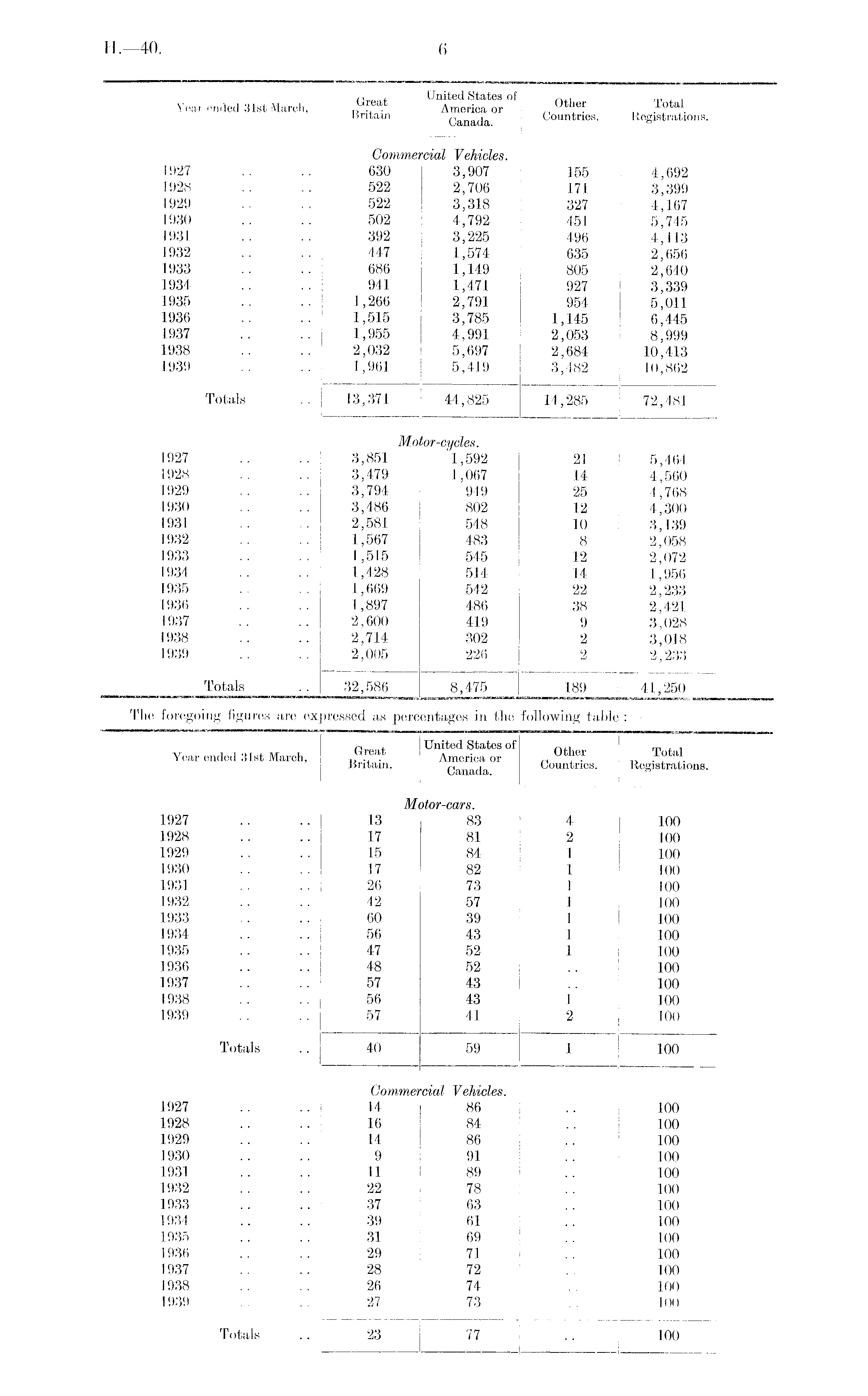 /<„„„* United States of _ , , Year ended 31st March, „ . . America or „ or Total Jintam Canada Countries. Registrations. Commercial Vehicles. 1927 .. .. I 630 3,907 155 4,692 1928 .. .. 522 2,706 171 3,399 1929 .. .. 522 3,318 327 4,167 1930 .. .. 502 4,792 451 5,745 1931 .. .. 392 3,225 496 4,113 1932 .. .. 447 1,574 635 2,656 1933 .. .. 686 1,149 805 2,640 1934 .. .. 941 1,471 927 3,339 1935 .. .. 1,266 2,791 954 5,011 1936 .. .. 1,515 3,785 1,145 6,445 1937 .. .. 1,955 4,991 2,053 8,999 1938 .. .. 2,032 5,697 2,684 10,413 1939 .. .. 1,961 5,419 3,482 10,862 Totals 13,371 44,825 14,285 72,481 Motor-cycles. 1927 .. .. 3,851 1 '1,592 21 5,464 1928 .. .. 3,479 1,067 14 4,560 1929 .. .. 3,794 j 949 25 4,768 1930 .. .. 3,486 802 12 4,300 1931 .. .. 2,581 548 10 3,139 1932 .. .. 1,567 483 8 2,058 1933 .. 1,515 545 12 2,072 1934 .. 1,428 514 14 1,956 1935 .. .. 1,669 542 22 2,233 1936 .. .. 1,897 486 38 2,421 1937 .. .. 2,600 419 9 3,028 1938 .. .. 2,714 302 2 j 3,018 1939 .. .. 2,005 226 2 ! 2,233 Totals .. 32,586 8,475 189 I 41,250