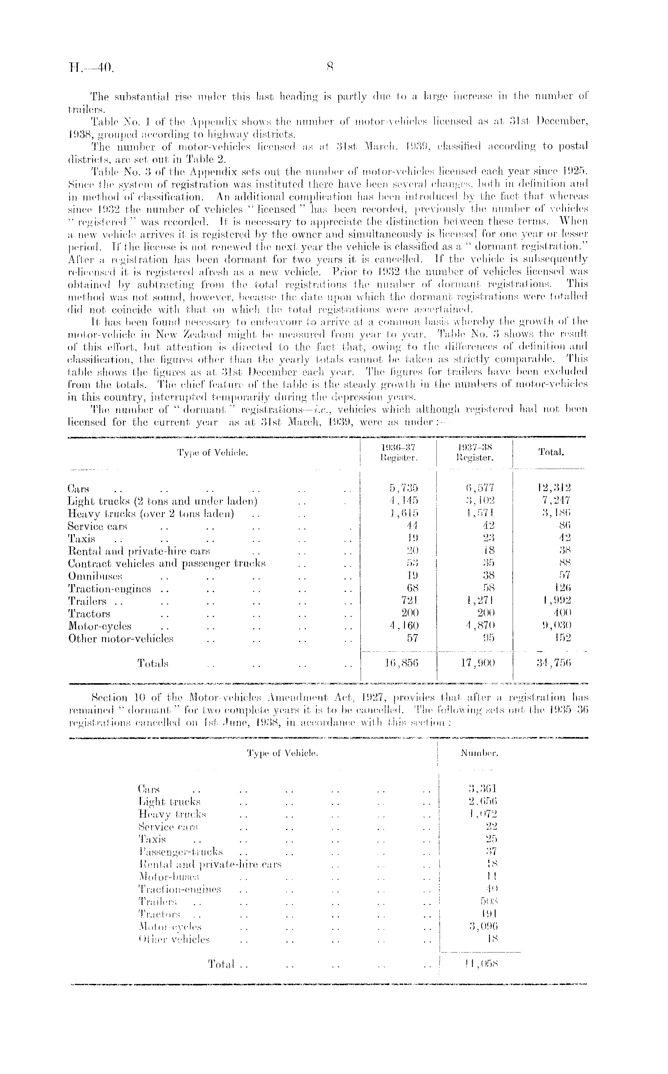 The substantial rise under this last heading is partly due to a large increase in the number of trailers. Table No. 1 of the Appendix shows the number of motor-vehicles licensed as at 31st December, 1938, grouped according to highway districts. The number of motor-vehicles licensed as at 31st March, 1939, classified according to postal districts, are set out in Table 2. Table No. 3 of the Appendix sets out the number of motor-vehicles licensed each year since 1925. Since the system of registration was instituted there have been several changes, both in definition and in method of classification. An additional complication has been introduced by the fact that whereas since 1932 the number of vehicles " licensed " has been recorded, previously the number of vehicles " registered " was recorded. It is necessary to appreciate the distinction between these terms. When a new vehicle arrives it is registered by the owner and simultaneously is licensed for one year or lesser period. If the license is not renewed the next year the vehicle is classified as a " dormant registration." After a registration has been dormant for two years it is cancelled. If the vehicle is subsequently relicensed it is registered afresh as a new vehicle. Prior to 1932 the number of vehicles licensed was obtained by subtracting from the total registrations the number of dormant registrations. This method was not sound, however, because the date upon which the dormant registrations wore totalled did not coincide with that on which the total registrations were ascertained. It has been found necessary to endeavour to arrive at a common basis whereby the growth of the motor-vehicle in New Zealand might be measured from year to year. Table No. 3 shows the result of this effort, but attention is directed to the fact that, owing to the differences of definition and classification, the figures other than the yearly totals cannot be taken as strictly comparable. This table shows the figures as at 31st December each year. The figures for trailers have been excluded from the totals. The chief feature of the table is the steady growth in the numbers of motor-vehicles in this country, interrupted temporarily during the depression years. The number of " dormant " registrations—i.e., vehicles which although registered had not been licensed for the current year —as at 31st March, 1939, were as under: —