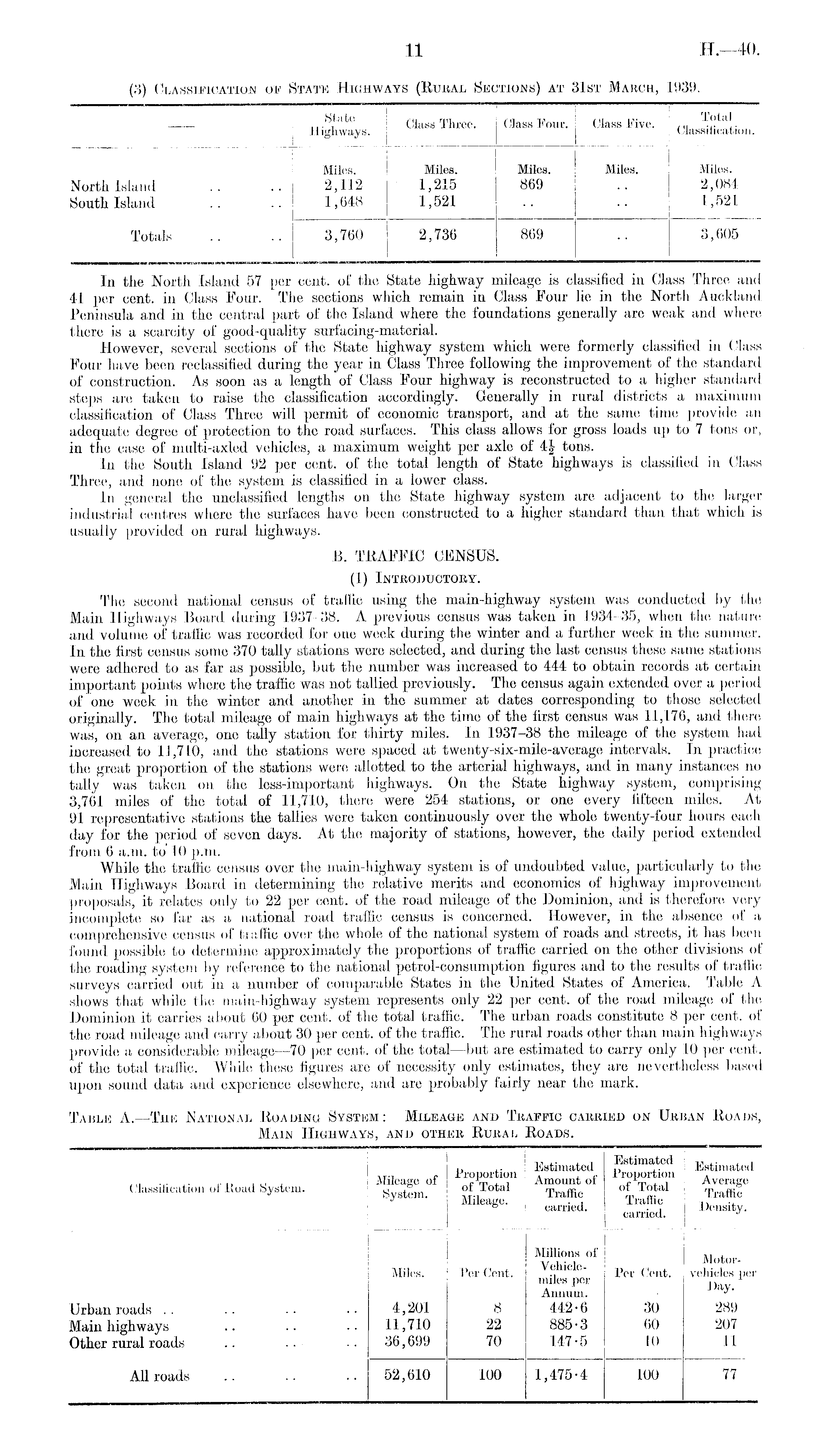 In the North Island 57 per cent, of the State highway mileage is classified in Class Three and 41 per cent, in Class Four. The sections which remain in Class Four lie in the North Auckland Peninsula and in the central part of the Island where the foundations generally are weak and where there is a scarcity of good-quality surfacing-material. However, several sections of the State highway system which were formerly classified in Class Four have been reclassified during the year in Class Three following the improvement of the standard of construction. As soon as a length of Class Four highway is reconstructed to a higher standard steps are taken to raise the classification accordingly. Generally in rural districts a maximum classification of Class Three will permit of economic transport, and at the same time provide an adequate degree of protection to the road surfaces. This class allows for gross loads up to 7 tons or, in the case of multi-axled vehicles, a maximum weight per axle of 4| tons. In the South Island 92 per cent, of the total length of State highways is classified in Class Three, and none of the system is classified in a lower class. In general the unclassified lengths on the State highway system are adjacent to the larger industrial centres where the surfaces have been constructed to a higher standard than that which is usually provided on rural highways. B. TRAFFIC CENSUS. (1) Introductory. The second national census of traffic using the main-highway system was conducted by the Main Highways Board during 1937-38. A previous census was taken in 1934-35, when the nature and volume of traffic was recorded for one week during the winter and a further week in the summer. In the first census some 370 tally stations were selected, and during the last census these same stations were adhered to as far as possible, but the number was increased to 444 to obtain records at certain important points where the traffic was not tallied previously. The census again extended over a period of one week in the winter and another in the summer at dates corresponding to those selected originally. The total mileage of main highways at the time of the first census was 11,176, and there was, on an average, one tally station for thirty miles. In 1937-38 the mileage of the system had increased to 11,710, and the stations were spaced at twenty-six-mile-average intervals. In practice the great proportion of the stations were allotted to the arterial highways, and in many instances no tally was taken on the less-important highways. On the State highway system, comprising 3,761 miles of the total of 11,710, there were 254 stations, or one every fifteen miles. At 91 representative stations the tallies were taken continuously over the whole twenty-four hours each day for the period of seven days. At the majority of stations, however, the daily period extended from 6 a.m. to' 10 p.m. While the traffic census over the main-highway system is of undoubted value, particularly to the Main Highways Board in determining the relative merits and economics of highway improvement proposals, it relates only to 22 per cent, of the road mileage of the Dominion, and is therefore very incomplete so far as a national road traffic census is concerned. However, in the absence of a comprehensive census of traffic over the whole of the national system of roads and streets, it has been found possible to determine approximately the proportions of traffic carried on the other divisions of the roading system by reference to the national petrol-consumption figures and to the results of traffic surveys carried out in a number of comparable States in the United States of America. Table A shows that while the main-highway system represents only 22 per cent, of the road mileage of the Dominion it carries about 60 per cent, of the total traffic. The urban roads constitute 8 per cent, of the road mileage and carry about 30 per cent, of the traffic. The rural roads other than main highways provide a considerable mileage —70 per cent, of the total —but are estimated to carry only 10 per cent, of the total traffic. While these figures are of necessity only estimates, they are nevertheless based upon sound data and experience elsewhere, and are probably fairly near the mark.