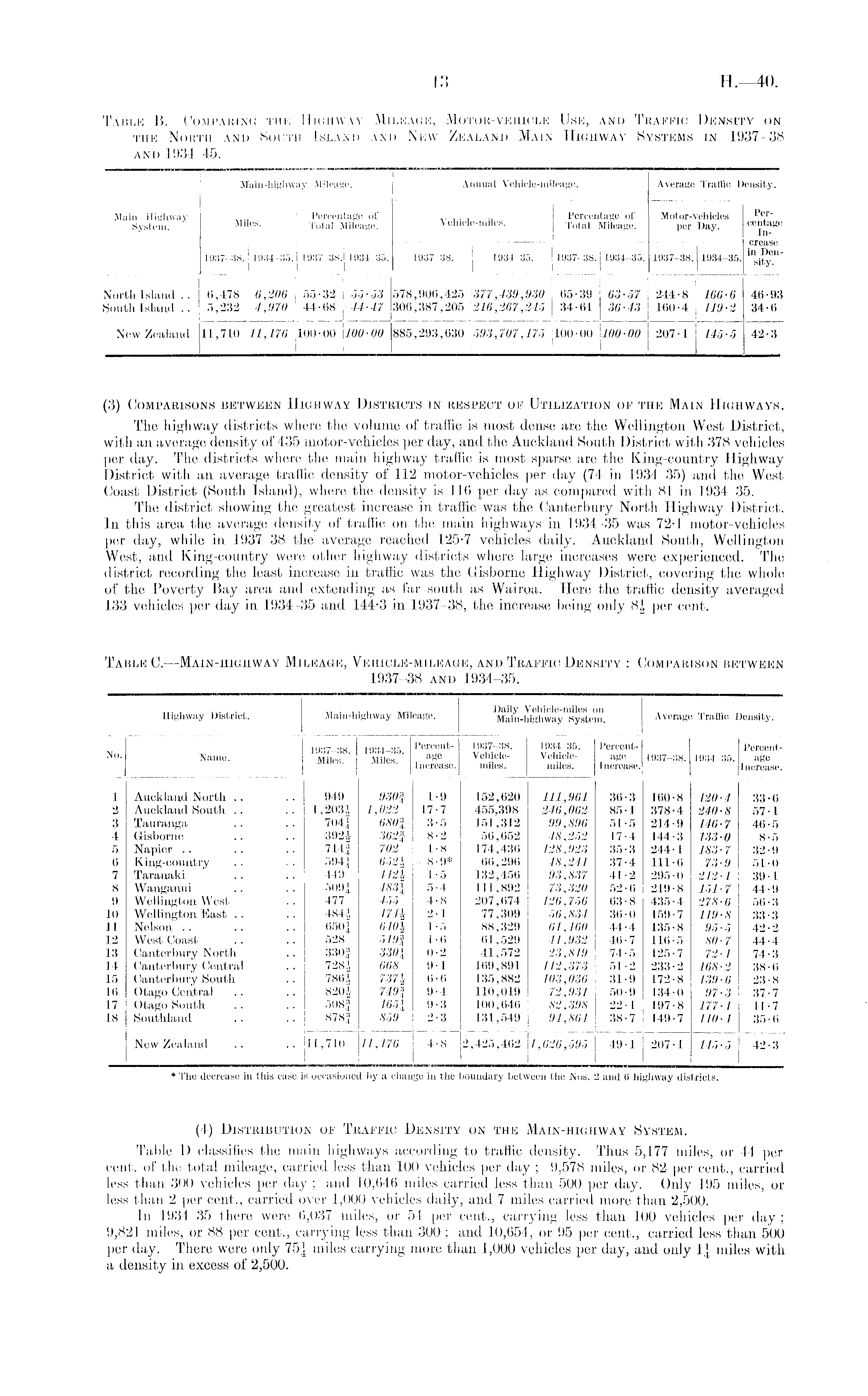 Table B.— Comparing the Highway Mileage, Motor-vehicle Use, and Traffic Density on the North and South Island and New Zealand Main Highway Systems in 1937-38 and 1934-45.