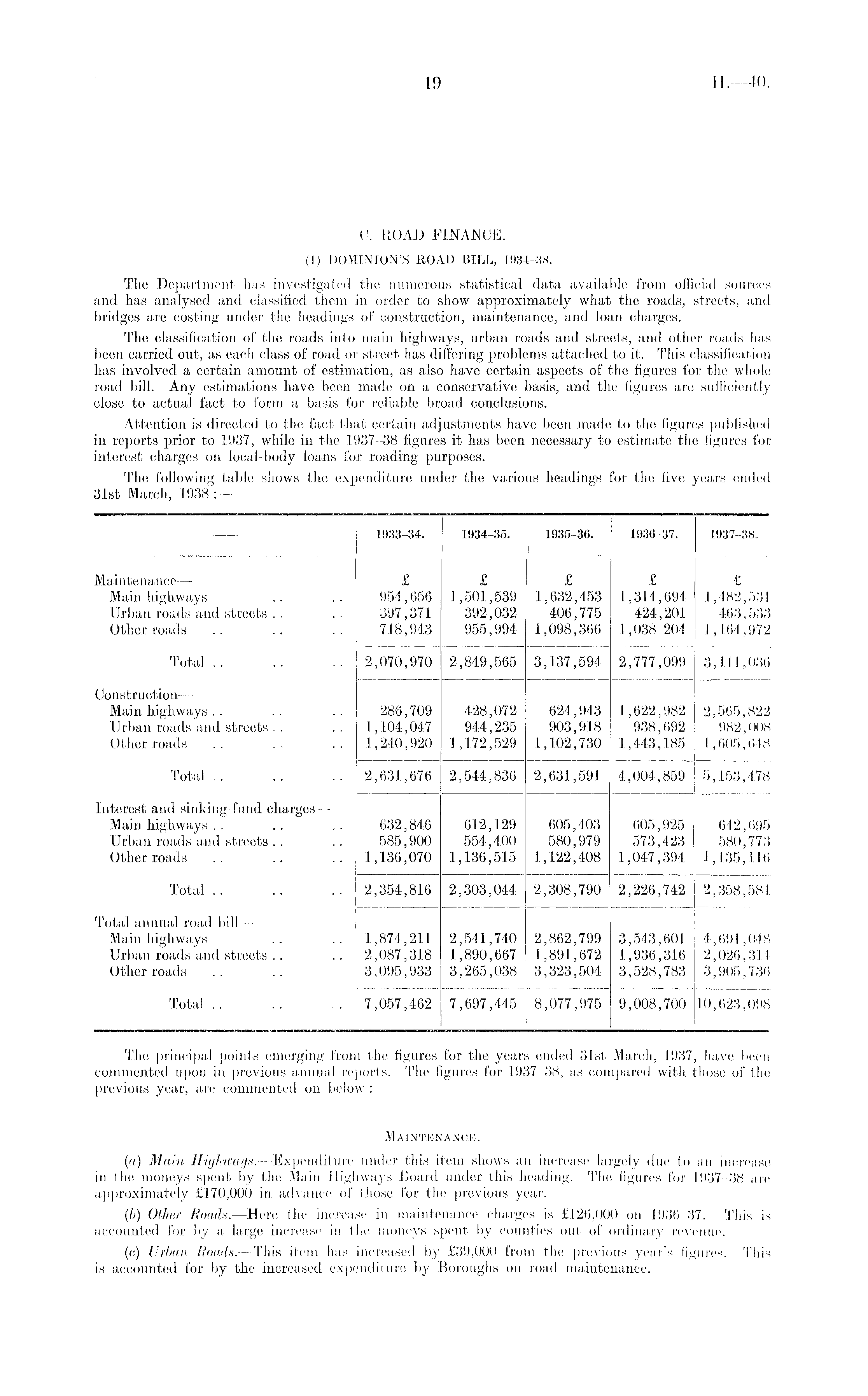 0. ROAD FINANCE. (1) DOMINION'S ROAD BILL, 1934-38. The Department has investigated the numerous statistical data available from official sources and has analysed and classified them in order to show approximately what the roads, streets, and bridges are costing under the headings of construction, maintenance, and loan charges. The classification of the roads into main highways, urban roads and streets, and other roads has been carried out, as each class of road or street has differing problems attached to it. This classification has involved a certain amount of estimation, as also have certain aspects of the figures for the whole road bill. Any estimations have been made on a conservative basis, and the figures are sufficiently close to actual fact to form a basis for reliable broad conclusions. Attention is directed to the fact that certain adjustments have been made to the figures published in reports prior to 1937, while in the 1937-38 figures it has been necessary to estimate the figures for interest charges on local-body loans for roading purposes. The following table shows the expenditure under the various headings for the five years ended 31st March, "1938 :—