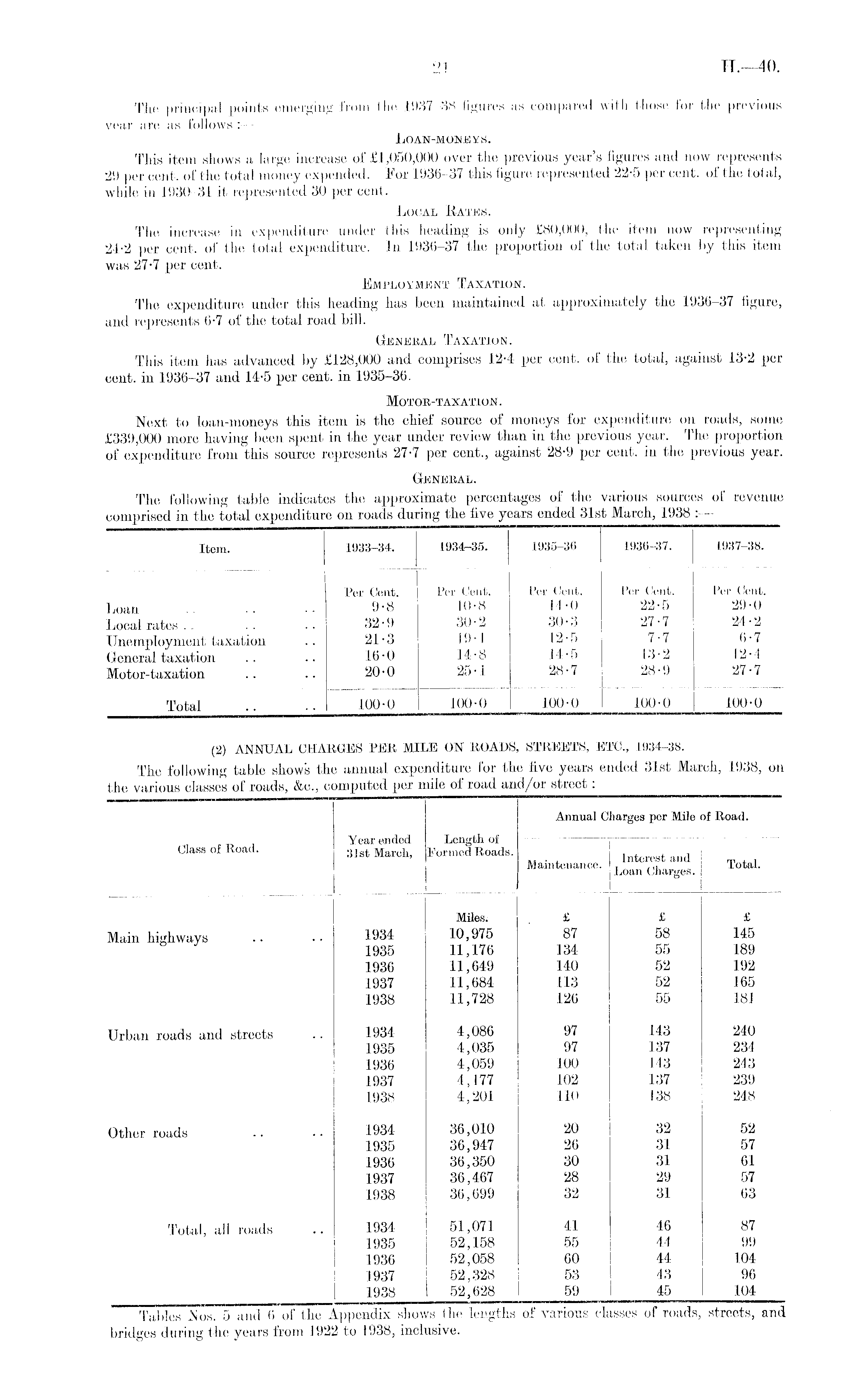 (2) ANNUAL CHARGES PER MILE ON ROADS, STREETS, ETC., 1934-38. The following table show's the annual expenditure for the live years ended 31st March, 1938, on the various classes of roads, &c., computed per mile of road and/or street