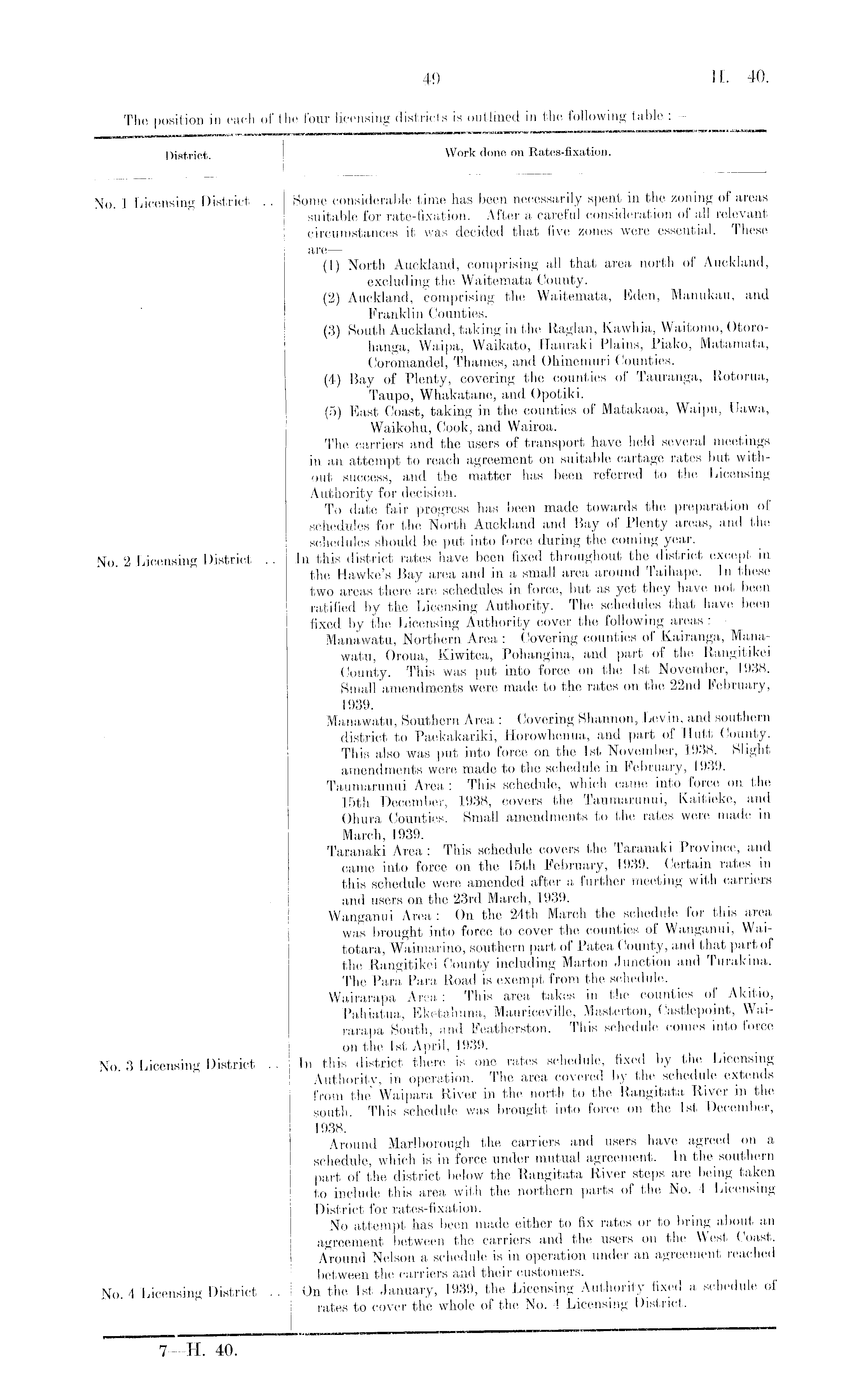 District. Work done on Rates-fixation. No. 1 Licensing District .. Some considerable time has been necessarily spent in the zoning of areas suitable for rate-fixation. After a careful consideration of all relevant circumstances it was decided that five zones were essential. These are — (1) North Auckland, comprising all that area north of Auckland, excluding the Waitemata County. (2) Auckland, comprising the Waitemata, Eden, Manukau, and Franklin Counties. (3) South Auckland, taking in the Raglan, Kawhia, Waitomo, Otorohanga, Waipa, Waikato, Hauraki Plains, Piako, Matamata, Coromandel, Thames, and Ohinemuri Counties. (4) Bay of Plenty, covering the counties of Tauranga, Rotorua, Taupo, Whakatane, and Opotiki. (5) East Coast, taking in the counties of Matakaoa, Waipu, Uawa, Waikohu, Cook, and Wairoa. The carriers and the users of transport have held several meetings in an attempt to reach agreement on suitable cartage rates but without success, and the matter has been referred to the Licensing Authority for decision. To date fair progress has been made towards the preparation of schedules for the North Auckland and Bay of Plenty areas, and the schedules should be put into force during the coming year. No. 2 Licensing District .. In this district rates have been fixed throughout the district except in the Hawke's Bay area and in a small area around Taihape. In these two areas there are schedules in force, but as yet they have not been ratified by the Licensing Authority. The schedules that have been fixed by the Licensing Authority cover the following areas : — Manawatu, Northern Area : Covering counties of Kairanga, Manawatu, Oroua, Kiwitea, Pohangina, and part of the Rangitikei County. This was put into force on the 1st November, 1938. Small amendments were made to the rates on the 22nd February, 1939. Manawatu, Southern Area : Covering Shannon, Levin, and southern district to Paekakariki, Horowhenua, and part of Hutt County. This also was put into force on the 1st November, 1938. Slight amendments were made to the schedule in February, 1939. Taumarunui Area : This schedule, which came into force on the 15th December, 1938, covers the Taumarunui, Kaitieke, and Ohura Counties. Small amendments to the rates were made in March, 1939. Taranaki Area : This schedule covers the Taranaki Province, and came into force on the 15th February, 1939. Certain rates in this schedule were amended after a further meeting with carriers and users on the 23rd March, 1939. Wanganui Area : On the 24th March the schedule for this area was brought into force to cover the counties of Wanganui, Waitotara, Waimarino, southern part of Patea County, and that part of the Rangitikei County including Marton Junction and Turakina. The Para Para Road is exempt from the schedule. Wairarapa Area : This area takes in the counties of Akitio, Pahiatua, Eketahuna, Mauriceville, Masterton, Castlepoint, Wairarapa South, and Featherston. This schedule comes into force on the 1st April, 1939. No 3 Licensing District . . In this district there is one rates schedule, fixed by the Licensing Authority, in operation. The area covered by the schedule extends from the Waipara River in the north to the Rangitata River in the south. This schedule was brought into force on the 1st December, 1938. Around Marlborough the carriers and users have agreed on a schedule, which is in force under mutual agreement. In southern part of the district below the Rangitata River steps are being taken to include this area with the northern parts of the No. 4 Licensing District for rates-fixation. No attempt has been made either to fix rates or to bring about an agreement between the carriers and the users on the West Coast. Around Nelson a schedule is in operation under an agreement reached between the carriers and their customers. No. 4 Licensing District . . On the 1st January, 1939, the Licensing Authority fixed a schedule of rates to cover the whole of the No. 4 Licensing District.