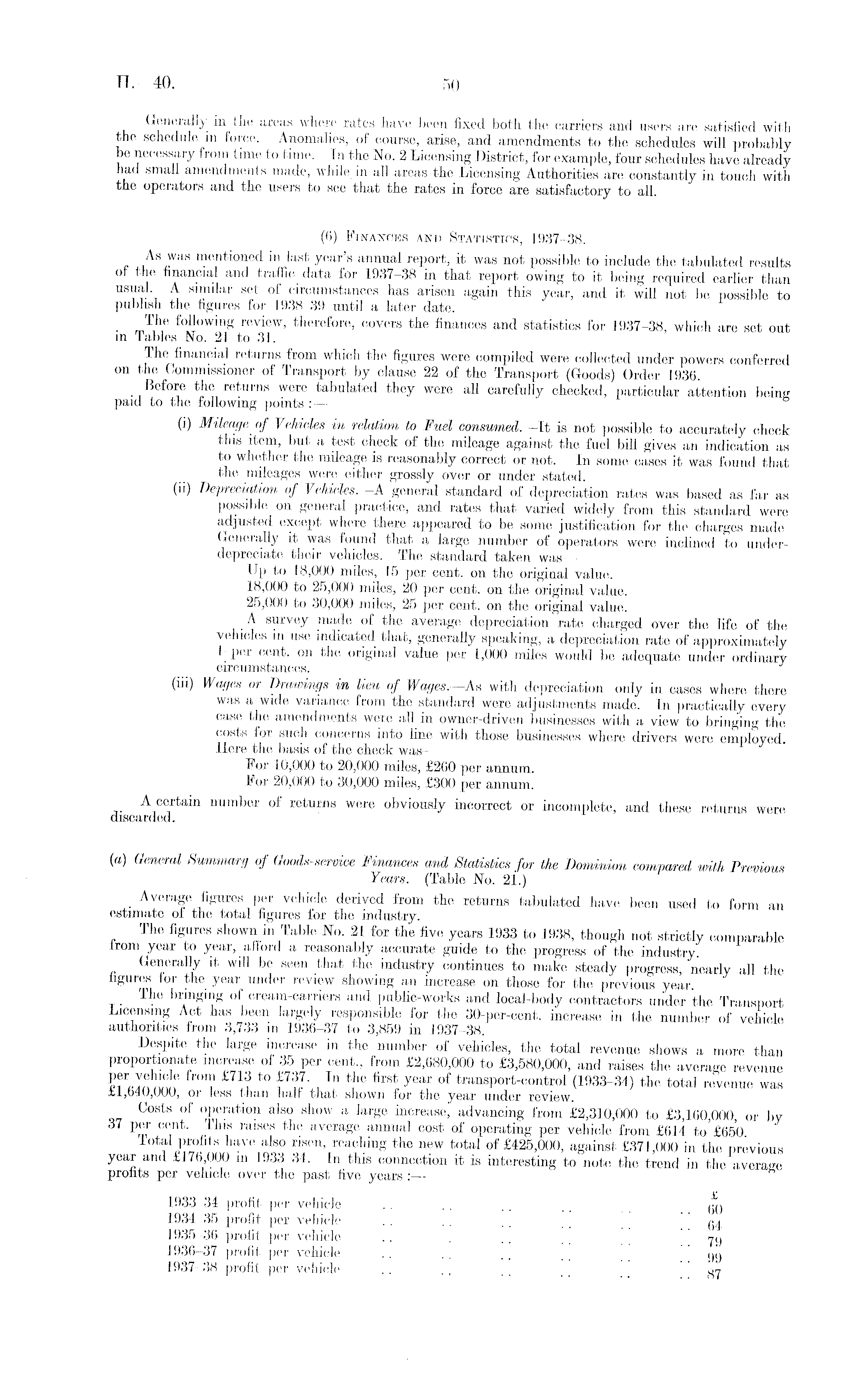 Generally in the areas where rates have been fixed both the carriers and users are satisfied with the schedule in force. Anomalies, of course, arise, and amendments to the schedules will probably be necessary from time to time. In the No. 2 Licensing District, for example, four schedules have already had small amendments made, while in all areas the Licensing Authorities are constantly in touch with the operators and the users to see that the rates in force are satisfactory to all. (6) Finances and Statistics, 1937-38. As was mentioned in last year's annual report, it was not possible to include the tabulated results of the financial and traffic data for 1937-38 in that report owing to it being required earlier than usual A similar set of circumstances has arisen again this year, and it will not be possible to publish the figures for 1938-39 until a later date. The following review, therefore, covers the finances and statistics for 1937-38, which are set out m Tables No. 21 to 31. The financial returns from which the figures were compiled were collected under powers conferred on the Commissioner of Transport by clause 22 of the Transport (Goods) Order 1936. Before the returns were tabulated they were all carefully checked, particular attention being paid to the following points : —■ (i) Mileage of Vehicles in relation to Fuel consumed.—lt is not possible to accurately check this item, but a test check of the mileage against the fuel bill gives an indication as to whether the mileage is reasonably correct or not. In some cases it was found that the mileages were either grossly over or under stated. (ii) Depreciation of Vehicles. A general standard of depreciation rates was based as far as possible on general practice, and rates that varied widely from this standard were adjusted except where there appeared to be some justification for the charges made Generally it was found that a large number of operators were inclined to underdepreciate their vehicles. The standard taken was— Up to 18,000 miles, 15 per cent, on the original value. 18,000 to 25,000 miles, 20 per cent, on the original value. 25,000 to 30,000 miles, 25 per cent, on the original value. A survey made of the average depreciation rate charged over the life of the vehicles in use indicated that, generally speaking, a depreciation rate of approximately L per cent, on the original value per 1,000 miles would be adequate under ordinary circumstances. (iii) Wa 9 es or Drawings in lieu of Wages.—As with depreciation only in cases where there was a wide variance from the standard were adjustments made. In practically every case the amendments were all in owner-driven businesses with a view to bringing the costs for such concerns into line with those businesses where drivers were employed. Here the basis of the check was — For 10,000 to 20,000 miles, £260 per annum. For 20,000 to 30,000 miles, £300 per annum. A certain number of returns were obviously incorrect or incomplete, and these returns were discarded. (a) General Summary of Goods-service Finances and Statistics for the Dominion compared with Previous Years. (Table No. 21.) Average figures per vehicle derived from the returns tabulated have been used to form an estimate of the total figures for the industry. The figures shown in Table No. 21 for the five years 1933 to 1938, though not strictly comparable irom year to year, afford a reasonably accurate guide to the progress of the industry. Generally it will be seen that the industry continues to make steady progress, nearly all the figures for the year under review showing an increase on those for the previous year The bringing of cream-carriers and public-works and local-body contractors under the Transport Licensing Act has been largely responsible for the 30-per-cent. increase in the number of vehicle authorities from 3,733 in 1936-37 to 3,859 in 1937-38. Despite the large increase in the number of vehicles, the total revenue shows a more than proportionate increase of 35 per cent., from £2,680,000 to £3,580,000, and raises the average revenue rfflln nnn 7 Ito f', In &St , year ° f trans P ort "Control (1933-34) the total revenue was x1,b40,000, or less than half that shown for the year under review. Costs of operation also show a large increase, advancing from £2,310,000 to £3,160,000, or by 37 per cent. I his raises the average annual cost of operating per vehicle from £614 to' £650 Total profits have also risen, reaching the new total of £425,000, against £371,000 in the previous year and £176,000 m 1933-34. In this connection it is interesting to note the trend in the average pronts per vehicle over the past five years : — 1933-34 profit per vehicle .. . . .. iL 1934-35 profit per vehicle . . .. .. 64 1935-36 profit per vehicle .. .. .. 79 1936-37 profit per vehicle .. .. .. 99 1937-38 profit per vehiclc .. .. 87