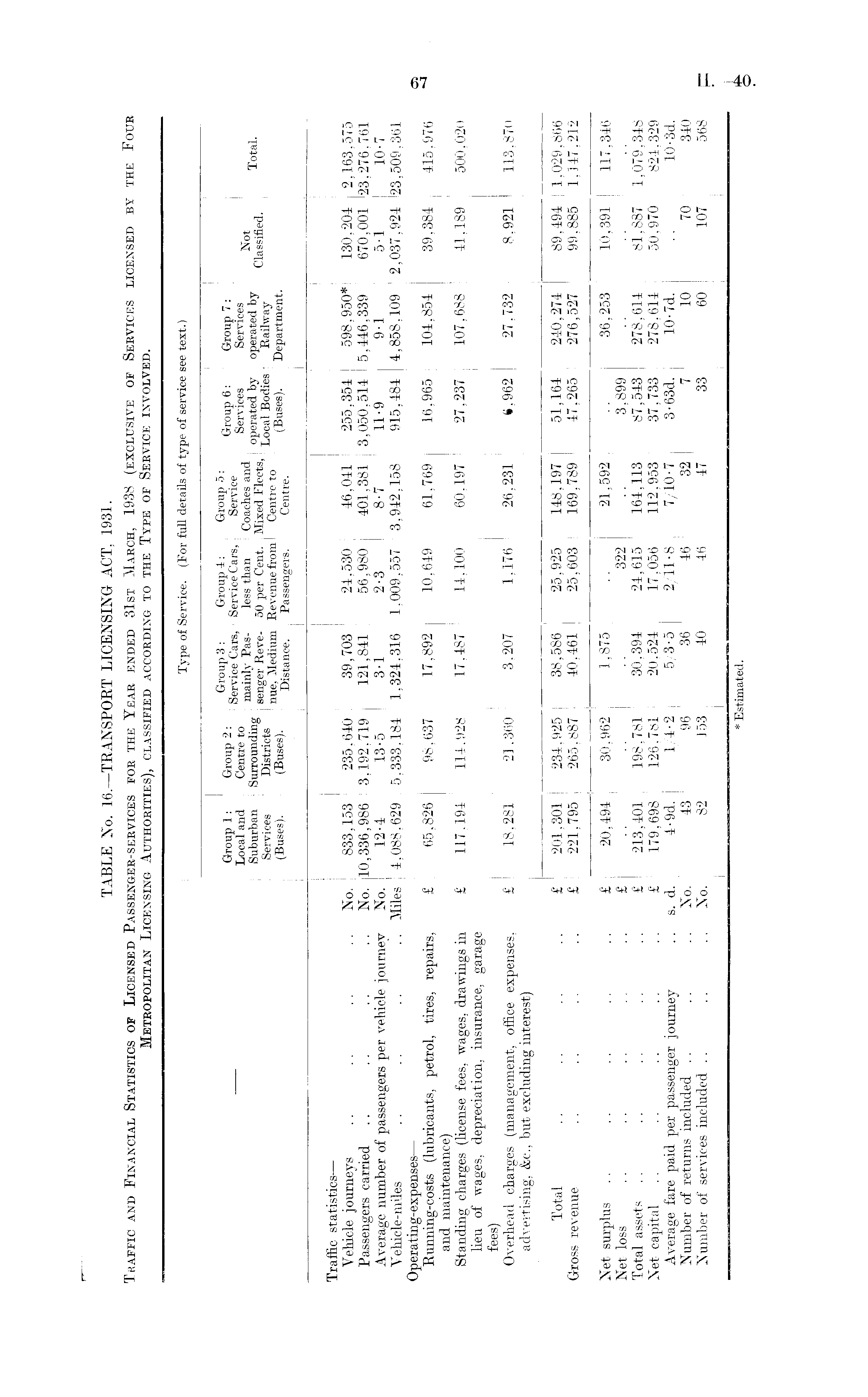 TABLE No. 16.—TRANSPORT LICENSING ACT, 1931. Traffic and Financial Statistics of Licensed Passenger-services for the Year ended 31st March, 1938 (exclusive of Services licensed by the Four Metropolitan Licensing Authorities), classified according to the Type of Service involved.