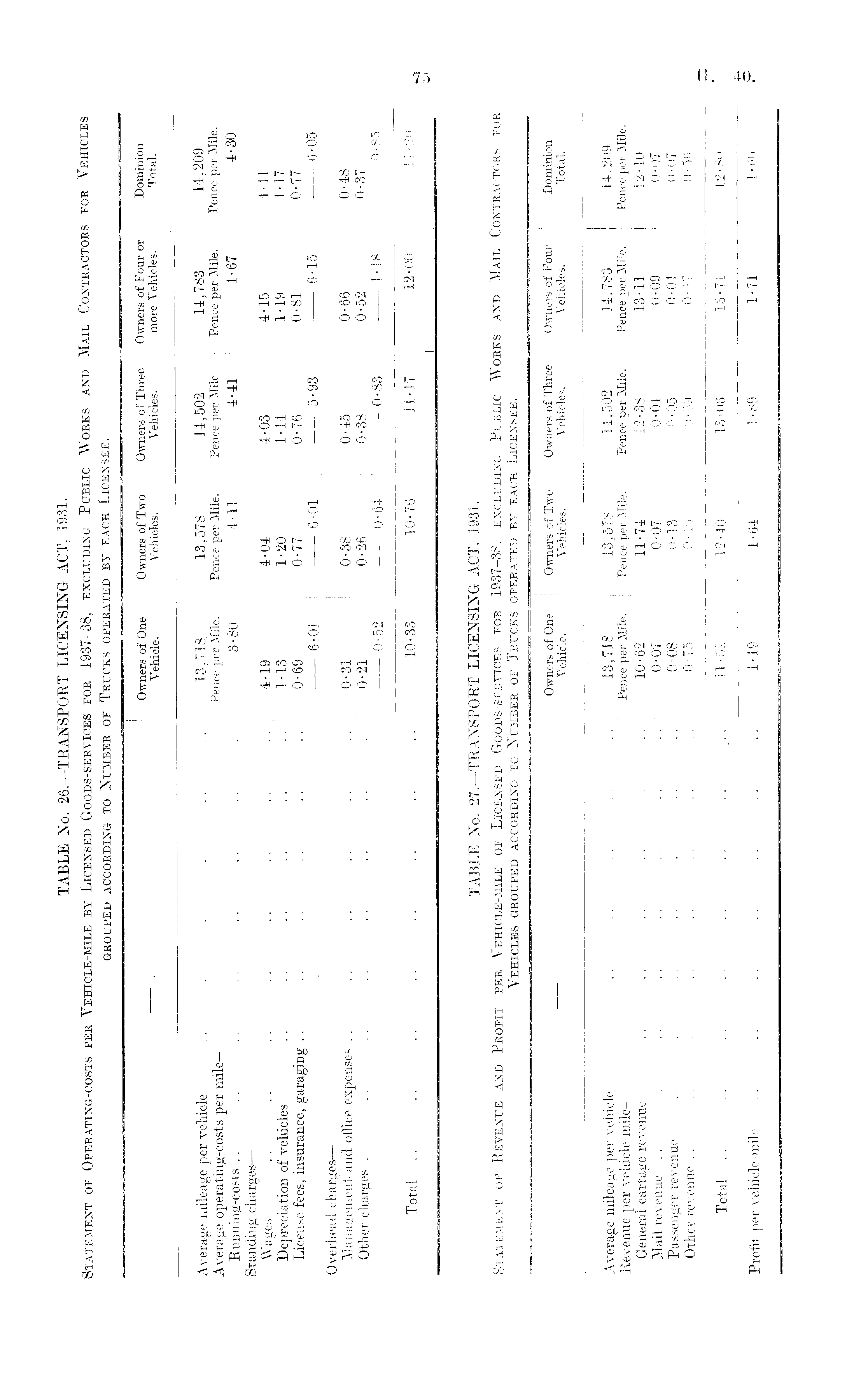 Owners of One Owners of Two Owners of Three Owners of Four ! Dominion | Vehicle. Vehicles. Vehicles. I Vehicles. i Total. Average mileage per vehicle .. .. .. .. .. .. 13,718 13,578 11,502 14,783 14,209 Revenue per vehicle-mile Pence per Mile. Pence per Mile. Pence per Mile. Pence per Mile. Pence per Mile. General cartage revenue .. .. .. .. .. .. 10-62 11-74 12-38 13-11 12-10 Mail revenue .. . . .. .. .. .. .. .. 0-07 0-07 0-04 0-09 0-07 Passenger revenue .. .. .. .. .. .. .. 0-08 0-13 0-05 0-04 0-07 Other revenue .. .. .. .. .. .. .. .. 0-75 0-46 0-59 0-47 0-56 Total .. .. .. .. .. .. .. ... | 11-52 12-40 13-06 13-71 12-80 Profit per vehicle-mile .. .. .. .. .. .. .. j 1-19 1-64 1-89 i 1-71 1-60 1 I