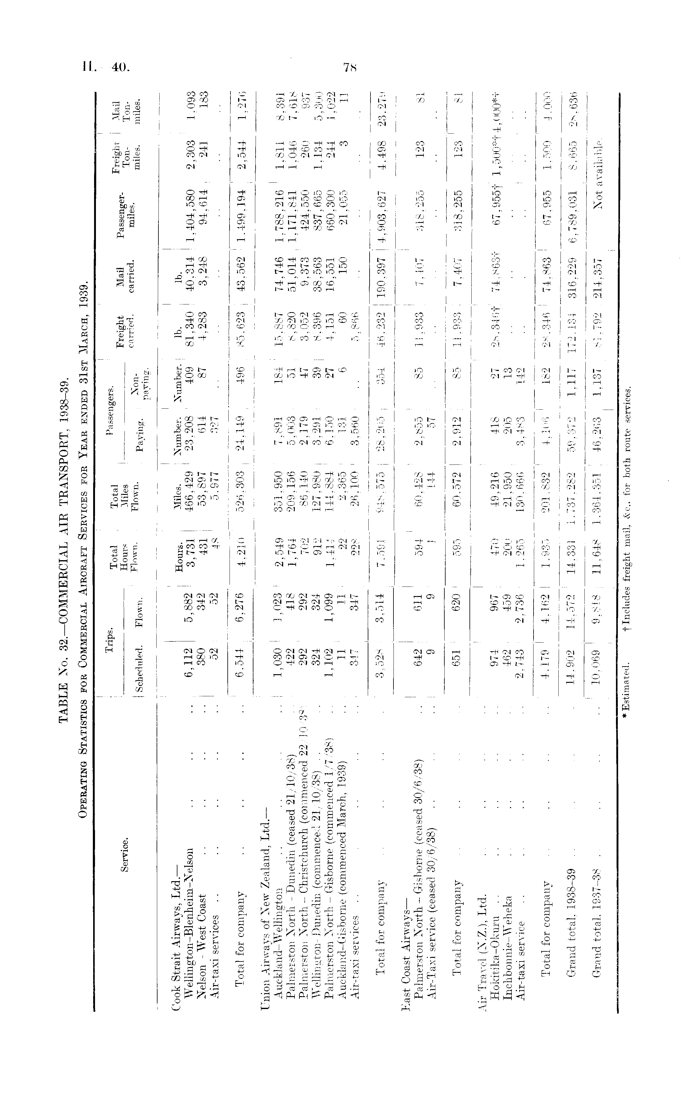 TABLE No. 32.—COMMERCIAL AIR TRANSPORT, 1938-39. Operating Statistics for Commercial Aircraft Services for Year ended 31st March, 1939.