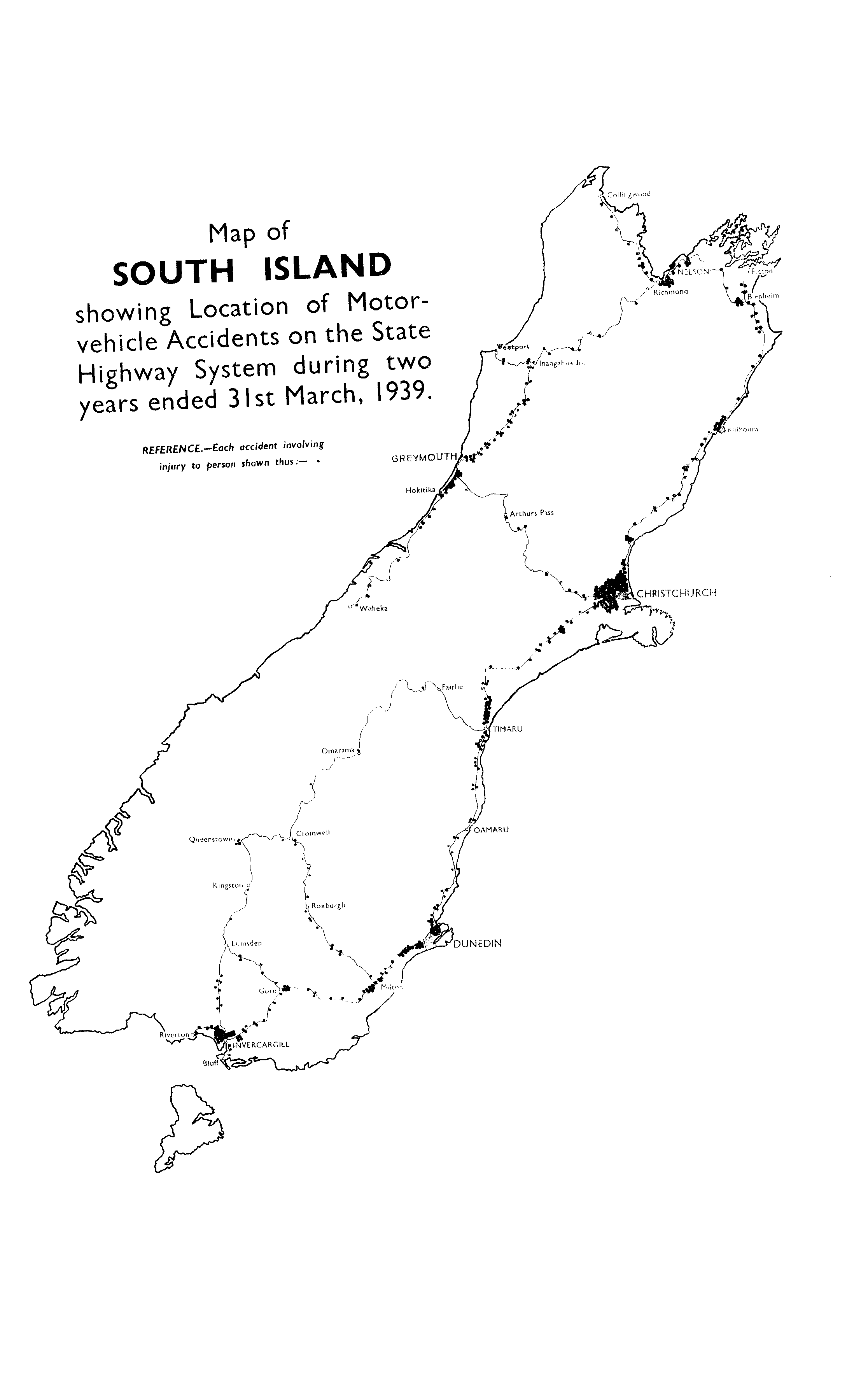 Map of SOUTH ISLAND showing Location of Motorvehicle Accidents on the State Highway System during two years ended 31st March, 1939.