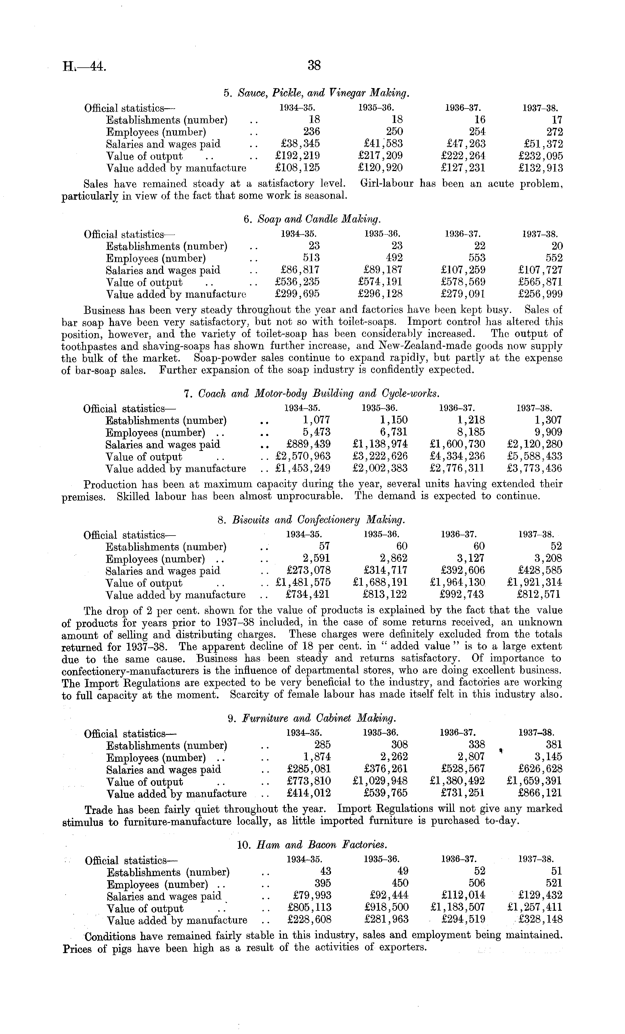 5. Sauce, Pickle, and Vinegar Making. Official statistics— 1934-35. 1935-36. 1936-37. 1937-38. Establishments (number) .. 18 18 16 17 Employees (number) .. 236 250 254 272 Salaries and wages paid .. £38,345 £41,583 £47,263 £51,372 Value of output .. .. £192,219 £217,209 £222,264 £232,095 Value added by manufacture £108,125 £120,920 £127,231 £132,913 Sales have remained steady at a satisfactory level. Girl-labour has been an acute problem, particularly in view of the fact that some work is seasonal. 6. Soap and Candle Making. Official statistics— 1934-35. 1935-36. 1936-37. 1937-38. Establishments (number) .. 23 23 22 20 Employees (number) .. 513 492 553 552 Salaries and wages paid .. £86,817 £89,187 £107,259 £107,727 Value of output .. .. £536,235 £574,191 £578,569 £565,871 Value added by manufacture £299,695 £296,128 £279,091 £256,999 Business has been very steady throughout the year and factories have been kept busy. Sales of bar soap have been very satisfactory, but not so with toilet-soaps. Import control has altered this position, however, and the variety of toilet-soap has been considerably increased. The output of toothpastes and shaving-soaps has shown further increase, and New-Zealand-made goods now supply the bulk of the market. Soap-powder sales continue to expand rapidly, but partly at the expense of bar-soap sales. Further expansion of the soap industry is confidently expected. 7. Coach and Motor-body Building and Cycle-works. Official statistics— 1934-35. 1935-36. 1936-37. 1937-38. Establishments (number) .. 1,077 1,150 1,218 1,307 Employees (number) .. .. 5,473 6,731 8,185 9,909 Salaries and wages paid .. £889,439 £1,138,974 £1,600,730 £2,120,280 Value of output .. .. £2,570,963 £3,222,626 £4,334,236 £5,588,433 Value added by manufacture .. £1,453,249 £2,002,383 £2,776,311 £3,773,436 Production has been at maximum capacity during the year, several units having extended their premises. Skilled labour has been almost unprocurable. The demand is expected to continue. 8. Biscuits and Confectionery Making. Official statistics— 1934-35. 1935-36. 1936-37. 1937-38. Establishments (number) .. 57 60 60 52 Employees (number) .. .. 2,591 2,862 3,127 3,208 Salaries and wages paid .. £273,078 £314,717 £392,606 £428,585 Value of output .. .. £1,481,575 £1,688,191 £1,964,130 £1,921,314 Value added by manufacture .. £734,421 £813,122 £992,743 £812,571 The drop of 2 per cent, shown for the value of products is explained by the fact that the value of products for years prior to 1937-38 included, in the case of some returns received, an unknown amount of selling and distributing charges. These charges were definitely excluded from the totals returned for 1937-38. The apparent decline of 18 per cent, in " added value " is to a large extent due to the same cause. Business has been steady and returns satisfactory. Of importance to confectionery-manufacturers is the influence of departmental stores, who are doing excellent business. The Import Regulations are expected to be very beneficial to the industry, and factories are working to full capacity at the moment. Scarcity of female labour has made itself felt in this industry also. 9. Furniture and Cabinet Making. Official statistics— 1934-35. 1935-36. 1936-37. 1937-38. Establishments (number) .. 285 308 338 381 Employees (number) .. .. 1,874 2,262 2,807 3,145 Salaries and wages paid .. £285,081 £376,261 £528,567 £626,628 Value of output .. .. £773,810 £1,029,948 £1,380,492 £1,659,391 Value added by manufacture .. £414,012 £539,765 £731,251 £866,121 Trade has been fairly quiet throughout the year. Import Regulations will not give any marked stimulus to furniture-manufacture locally, as little imported furniture is purchased to-day. 10. Ham and Bacon Factories. Official statistics— 1934-35. 1935-36. 1936-37. 1937-38. Establishments (number) .. 43 49 52 51 Employees (number) .. .. 395 450 506 521 Salaries and wages paid .. £79,993 £92,444 £112,014 £129,432 Value of output .." .. £805,113 £918,500 £1,183,507 £1,257,411 Value added by manufacture .. £228,608 £281,963 £294,519 £328,148 Conditions have remained fairly stable in this industry, sales and employment being maintained. Prices of pigs have been high as a result of the activities of exporters.