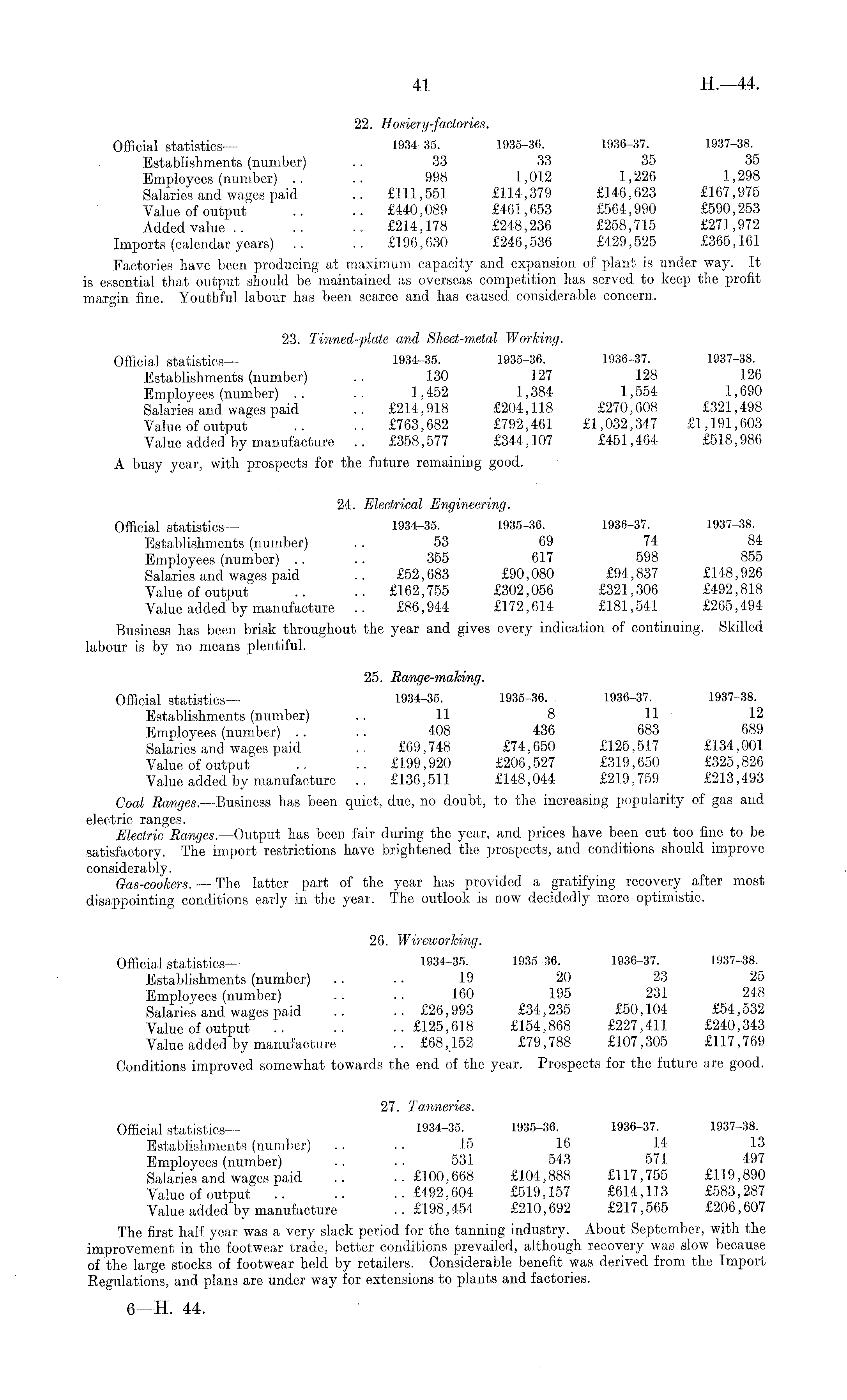 22. Hosiery-factories. Official statistics— 1934-35. 1935-36. 1936-37. 1937-38. Establishments (number) .. 33 33 35 35 Employees (number) .. .. 998 1,012 1,226 1,298 Salaries and wages paid .. £111,551 £114,379 £146,623 £167,975 Value of output .. .. £440,089 £461,653 £564,990 £590,253 Added value £214,178 £248,236 £258,715 £271,972 Imports (calendar years) .. .. £196,630 £246,536 £429,525 £365,161 Factories have been producing at maximum capacity and expansion of plant is under way. It is essential that output should be maintained as overseas competition has served to keep the profit margin fine. Youthful labour has been scarce and has caused considerable concern. 23. Tinned-plate and Sheet-metal Working. Official statistics— 1934-35. 1935-36. 1936-37. 1937-38. Establishments (number) .. 130 127 128 126 Employees (number) .. .. 1, 452 1,384- 1,554 1,690 Salaries and wages paid .. £214,918 £204,118 £270,608 £321,498 Value of output .. .. £763,682 £792,461 £1,032,347 £1,191,603 Value added by manufacture .. £358,577 £344,107 £451,464 £518,986 A busy year, with prospects for the future remaining good. 24. Electrical Engineering. Official statistics — 1934-35. 1935-36. 1936-37. 1937-38. Establishments (number) .. 53 69 74 84 Employees (number) .. .. 355 617 598 855 Salaries and wages paid .. £52,683 £90,080 £94,837 £148,926 Value of output .. .. £162,755 £302,056 £321,306 £492,818 Value added by manufacture .. £86,944 £172,614 £181,541 £265,494 Business has been brisk throughout the year and gives every indication of continuing. Skilled labour is by no means plentiful. 25. Range-making. Official statistics— 1934-35. 1935-36. 1936-37. 1937-38. Establishments (number) .. 11 8 11 12 Employees (number) .. .. 408 436 683 689 Salaries and wages paid .. £69,748 £74,650 £125,517 £134,001 Value of output .. .. £199,920 £206,527 £319,650 £325,826 Value added by manufacture .. £136,511 £148,044 £219,759 £213,493 Coal Ranges. —Business has been quiet, due, no doubt, to the increasing popularity of gas and electric ranges. Electric Ranges.—Output has been fair during the year, and prices have been cut too fine to be satisfactory. The import restrictions have brightened the prospects, and conditions should improve considerably. Gas-cookers. — The latter part of the year has provided a gratifying recovery after most disappointing conditions early in the year. The outlook is now decidedly more optimistic. 26. Wireworking. Official statistics — 1934-35. 1935-36. 1936-37. 1937-38. Establishments (number) .. .. 19 20 23 25 Employees (number) .. • • 160 195 231 248 Salaries and wages paid .. .. £26,993 £34,235 £50,104 £54,532 Value of output £125,618 £154,868 £227,411 £240,343 Value added by manufacture .. £68,152 £79,788 £107,305 £117,769 Conditions improved somewhat towards the end of the year. Prospects for the future are good. 27. Tanneries. Official statistics — 1934-35. 1935-36. 1936-37. 1937-38. Establishments (number) .. .. 15 16 14 13 Employees (number) .. .. 531 543 571 497 Salaries and wages paid .. .. £100,668 £104,888 £117,755 £119,890 Value of output £492,604 £519,157 £614,113 £583,287 Value added by manufacture .. £198,454 £210,692 £217,565 £206,607 The first half year was a very slack period for the tanning industry. About September, with the improvement in the footwear trade, better conditions prevailed, although recovery was slow because of the large stocks of footwear held by retailers. Considerable benefit was derived from the Import Regulations, and plans are under way for extensions to plants and factories.