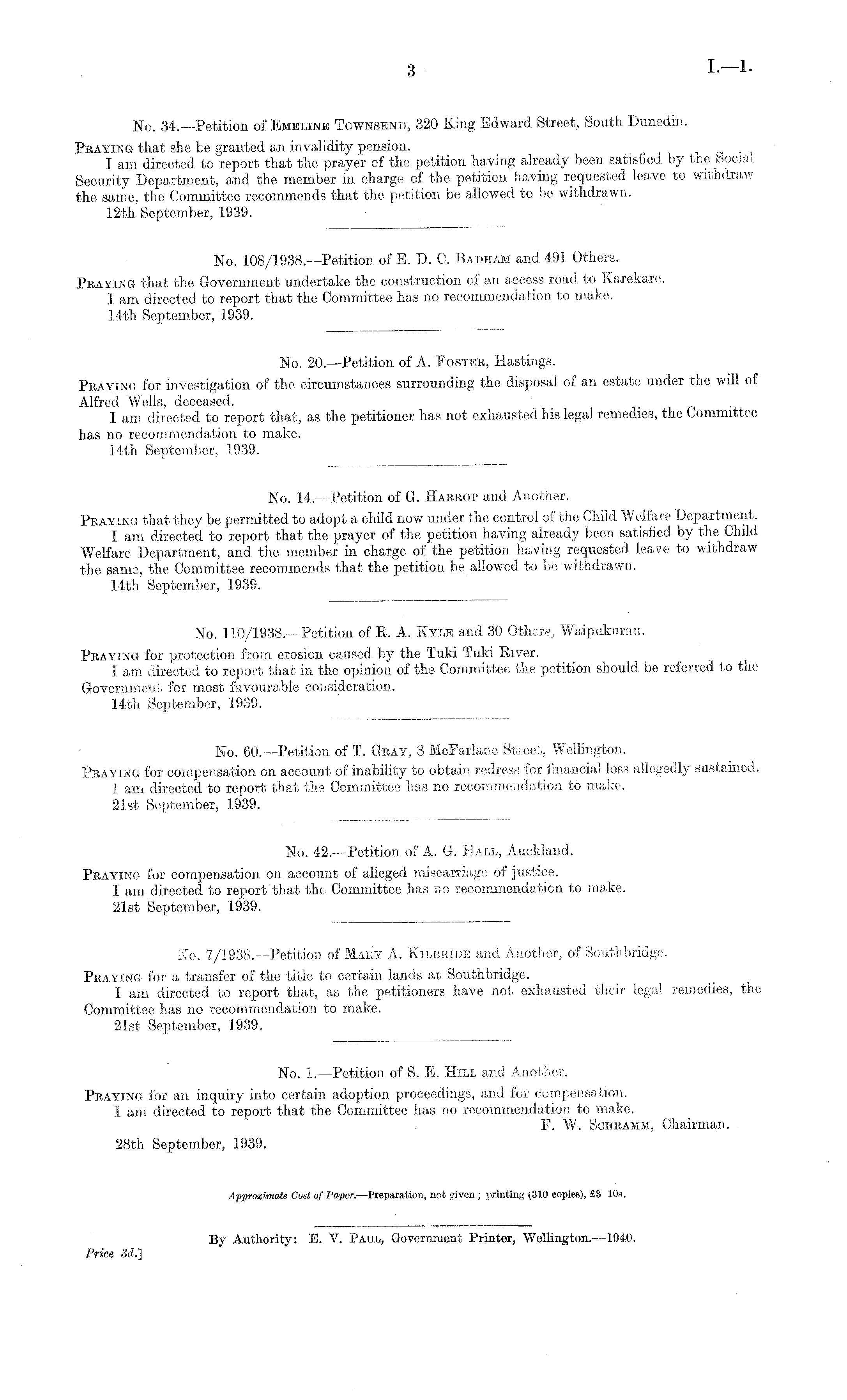 No. 1. —Petition of S. E. Hill and Another. Praying for an inquiry into certain adoption proceedings, and for compensation. I am directed to report that the Committee has no recommendation to make. P. W. Schramm, Chairman. 28th September, 1939.