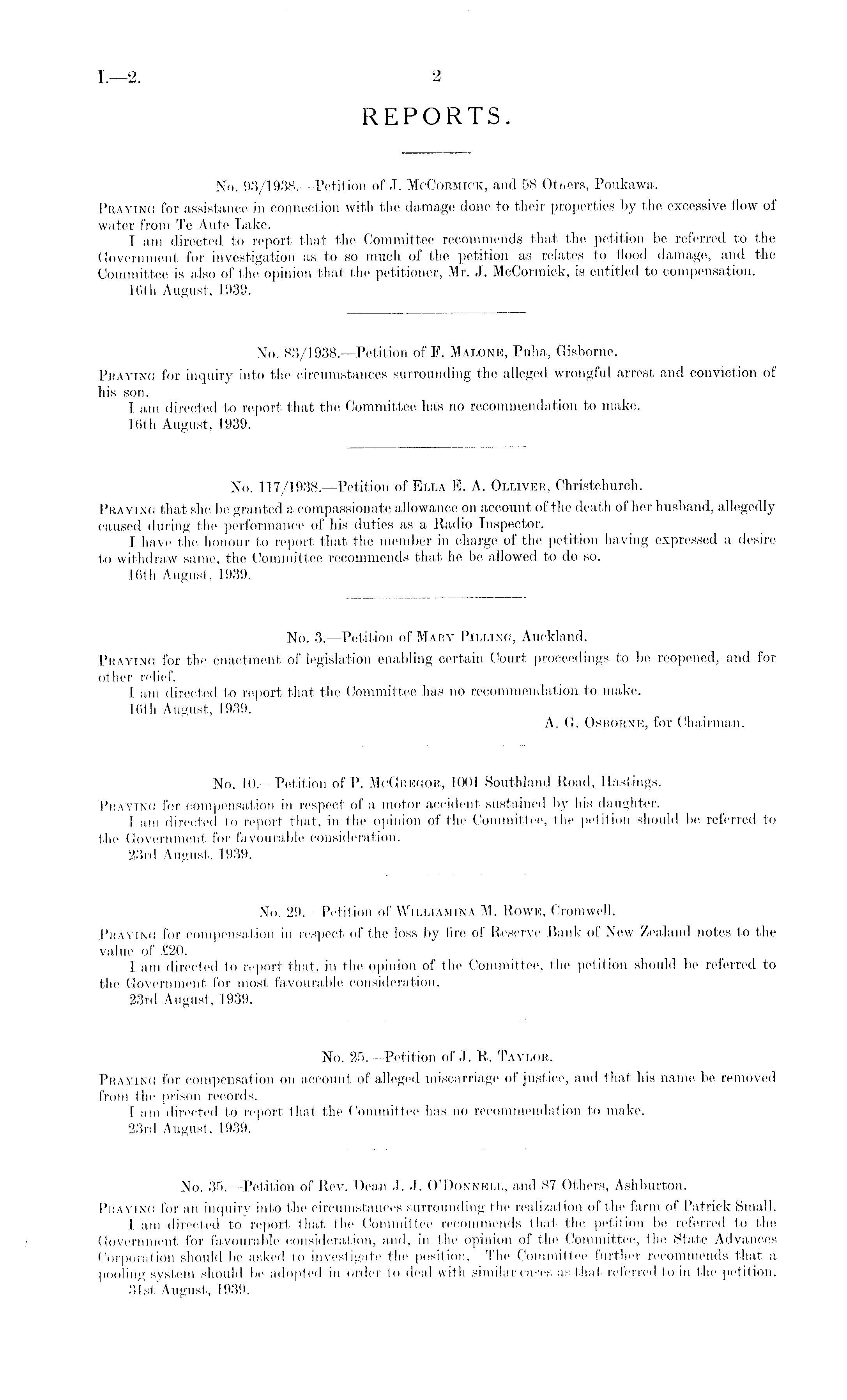 No. 93/1938. —Petition of J. McCormick, and 58 Others, Poukawa. Praying for assistance in connection with the damage done to their properties by the excessive flow of water from Te Aute Lake. I am directed to report that the Committee recommends that the petition be referred to the Government for investigation as to so much of the petition as relates to flood damage, and the Committee is also of the opinion that the petitioner, Mr. J. McCormick, is entitled to compensation. 16th August, 1939.