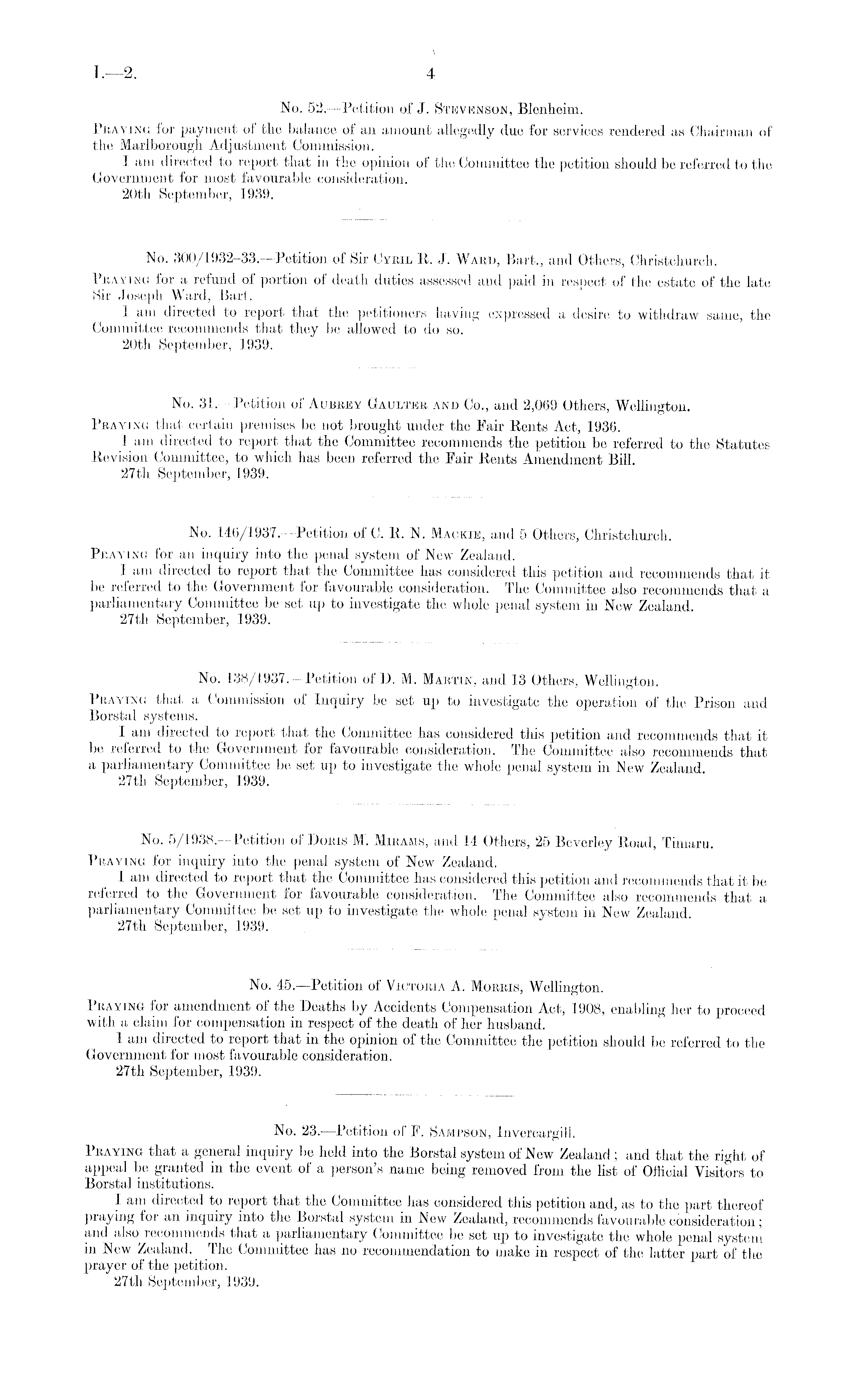 No. 23.—Petition of F. Sampson, Invercargill. Peaying that a general inquiry be held into the Borstal system of New Zealand; and that the right of appeal be granted in the event of a person's name being removed from the list of Official Visitors to Borstal institutions. I am directed to report that the Committee has considered this petition and, as to the part thereof praying for an inquiry into the Borstal system in New Zealand, rccommends favourable consideration; and also recommends that a parliamentary Committee be set up to investigate the whole penal system in New Zealand. The Committee has no recommendation to make in respect of the latter part of the prayer of the petition. 27th September, 1939.