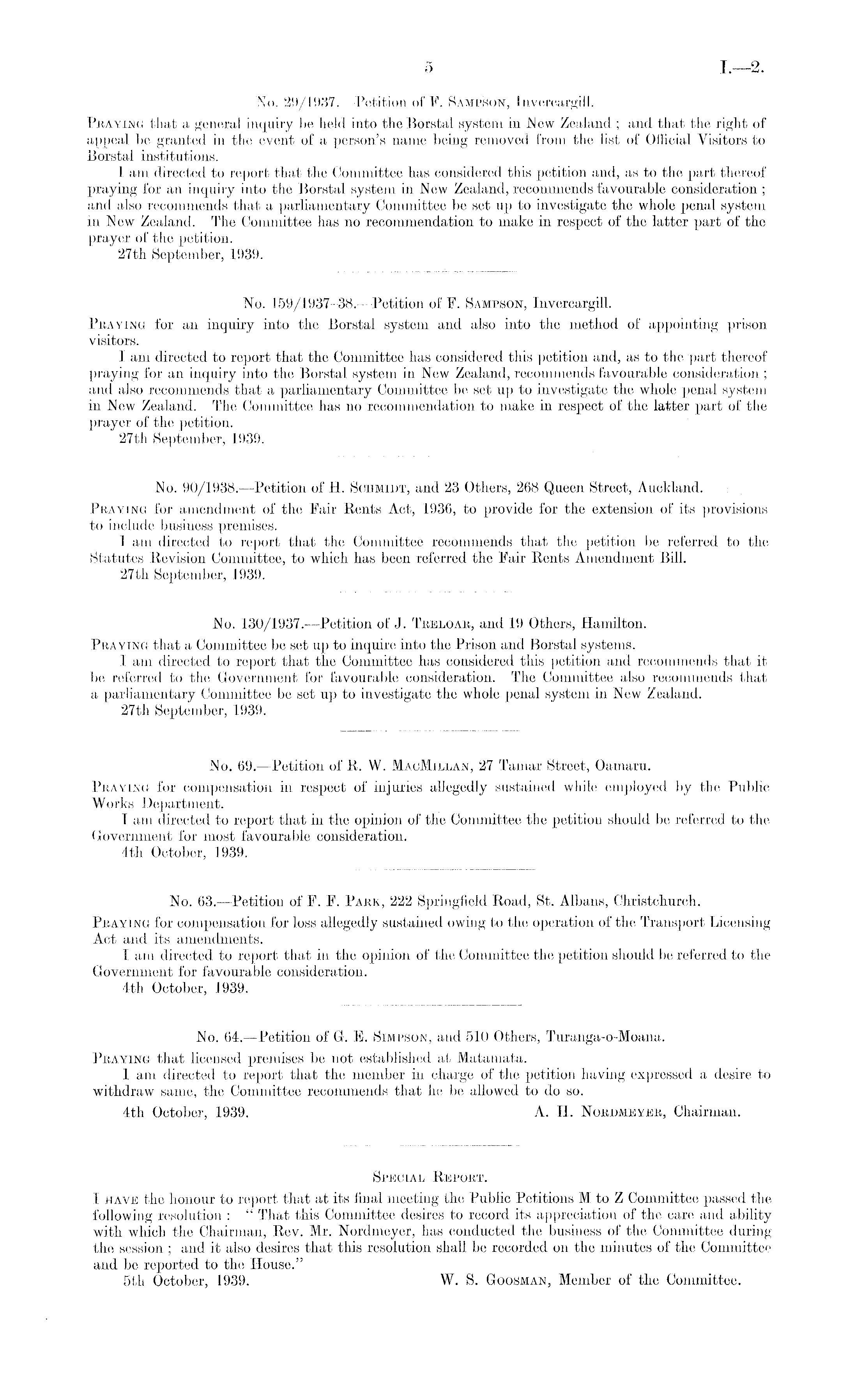 Special "Report. I have the honour to report that at its final meeting the Public Petitions M to Z Committee passed the following resolution : " That this Committee desires to record its appreciation of the care and ability with which the Chairman, Rev. Mr. Nordmeyer, has conducted the business of the Committee during the session ; and it also desires that this resolution shall be recorded on the minutes of the Committee and be reported to the House." sth October, 1939. W. S. Goosman, Member of the Committee.